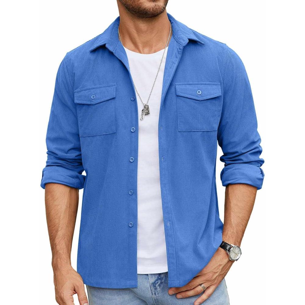 COOFANDY Men's Button Down Waffle Shirt Jacket Casual Long Sleeve Shacket Lightweight Overshirts with Flap Pockets(Blue)