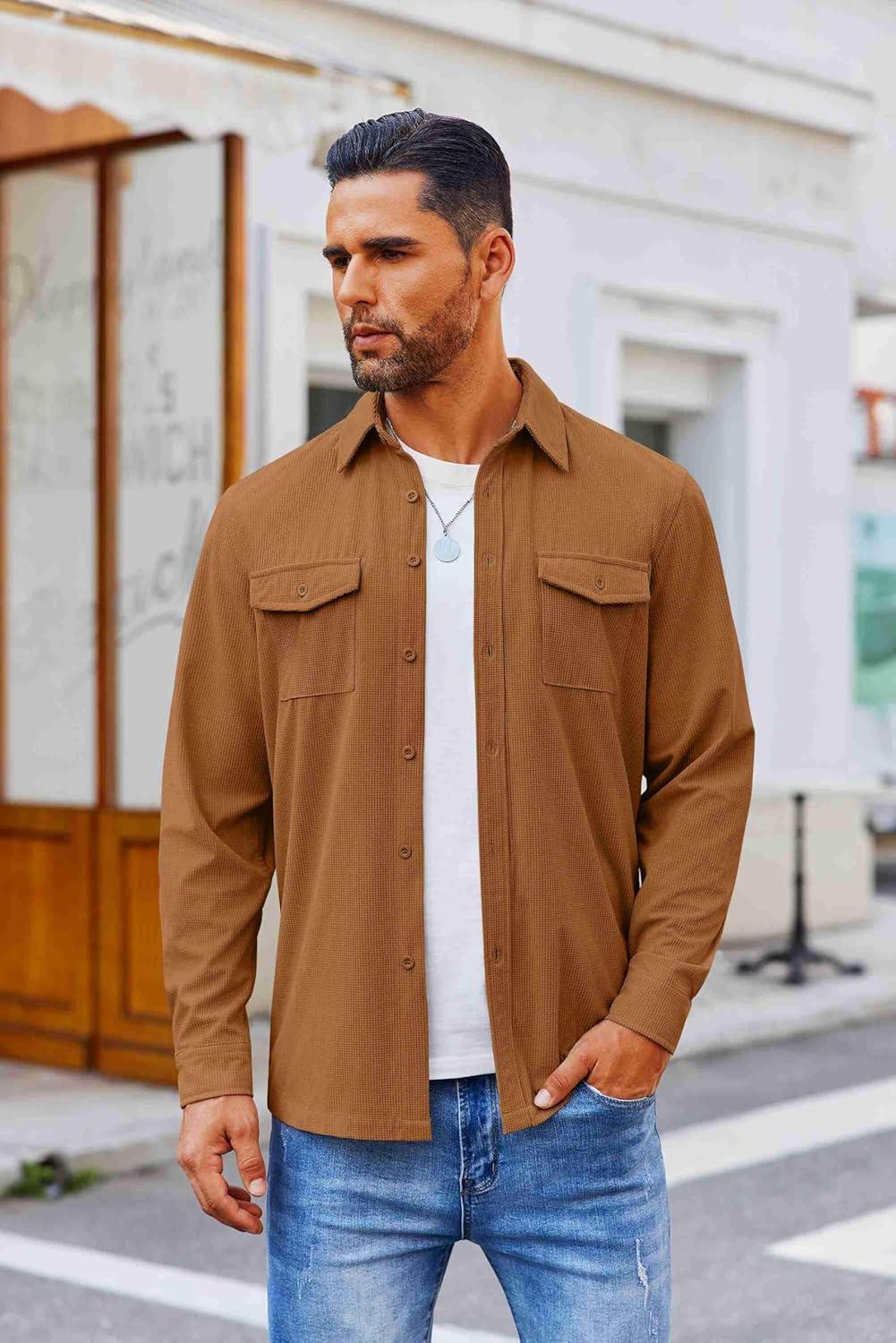 COOFANDY Men's Button Down Waffle Shirt Jacket Casual Long Sleeve Shacket Lightweight Overshirts with Flap Pockets(Light Brown)
