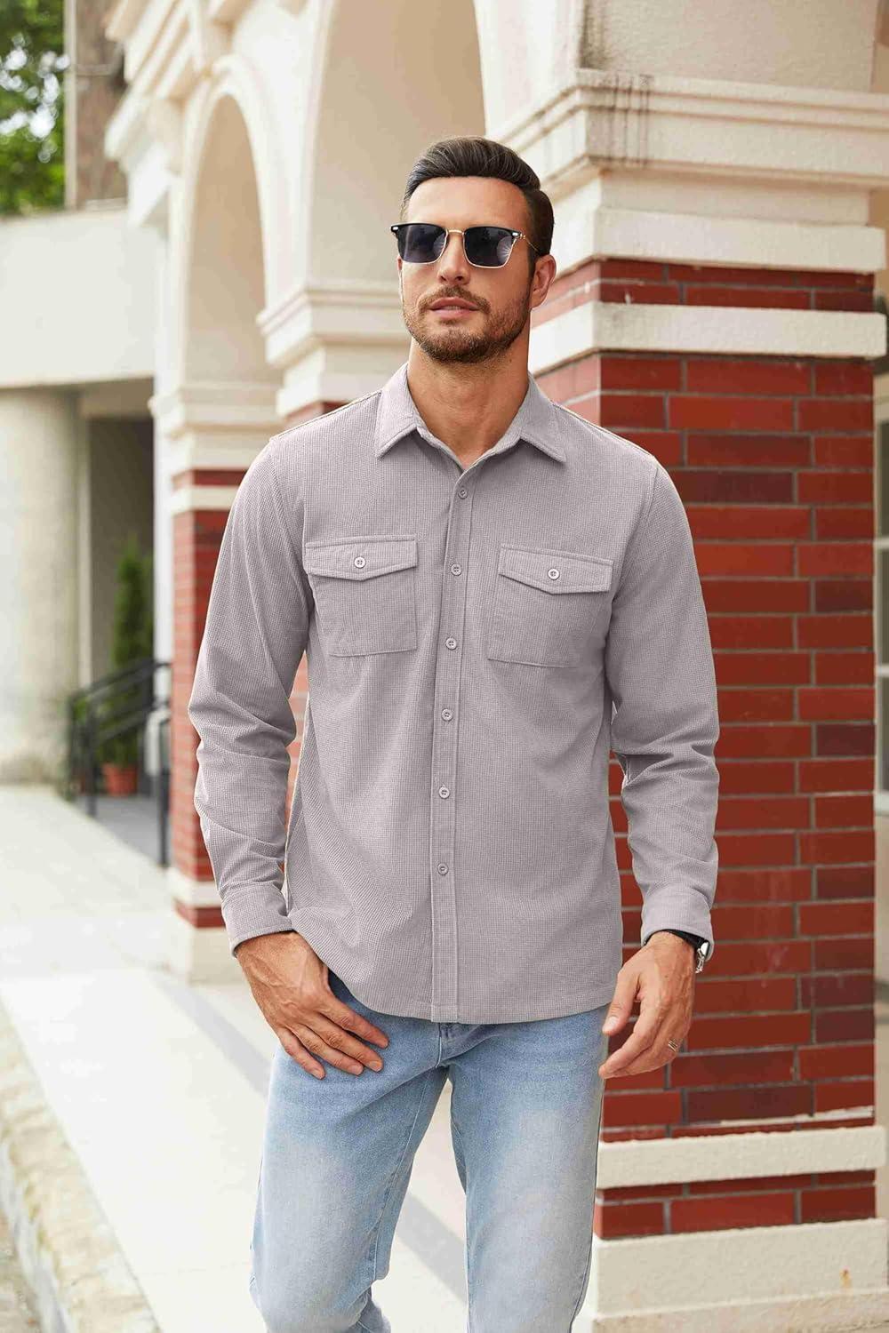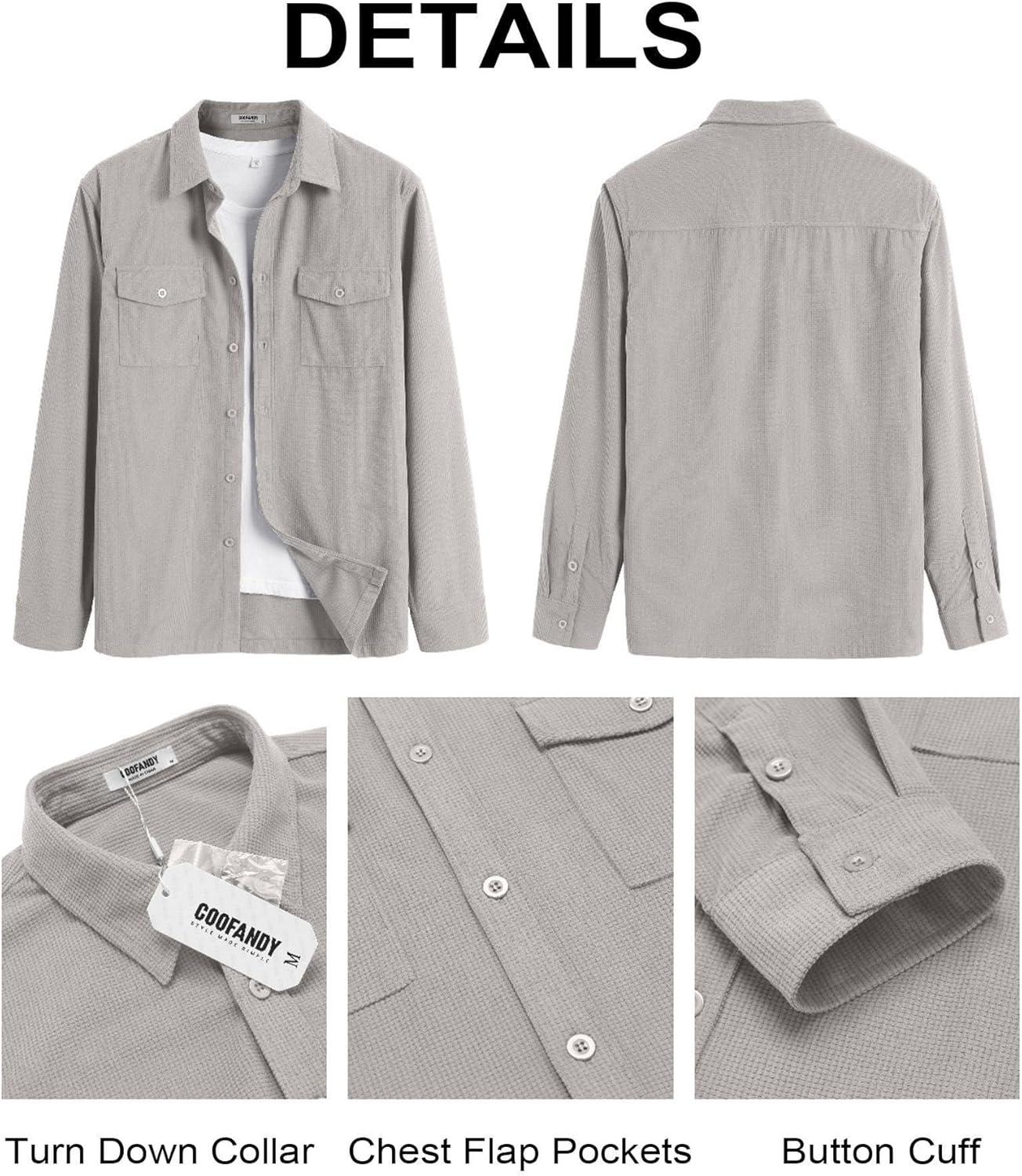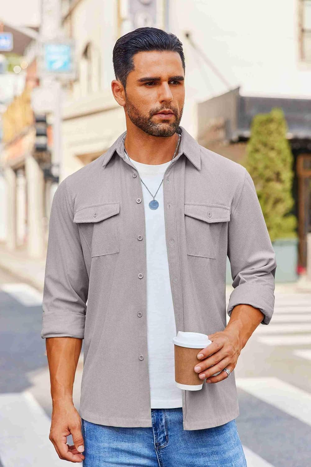 COOFANDY Men's Button Down Waffle Shirt Jacket Casual Long Sleeve Shacket Lightweight Overshirts with Flap Pockets(Light Gray)