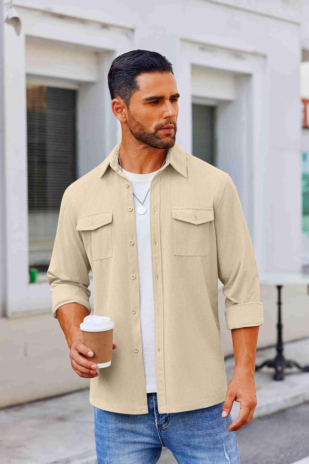 COOFANDY Men's Button Down Waffle Shirt Jacket Casual Long Sleeve Shacket Lightweight Overshirts with Flap Pockets(Light Khaki)