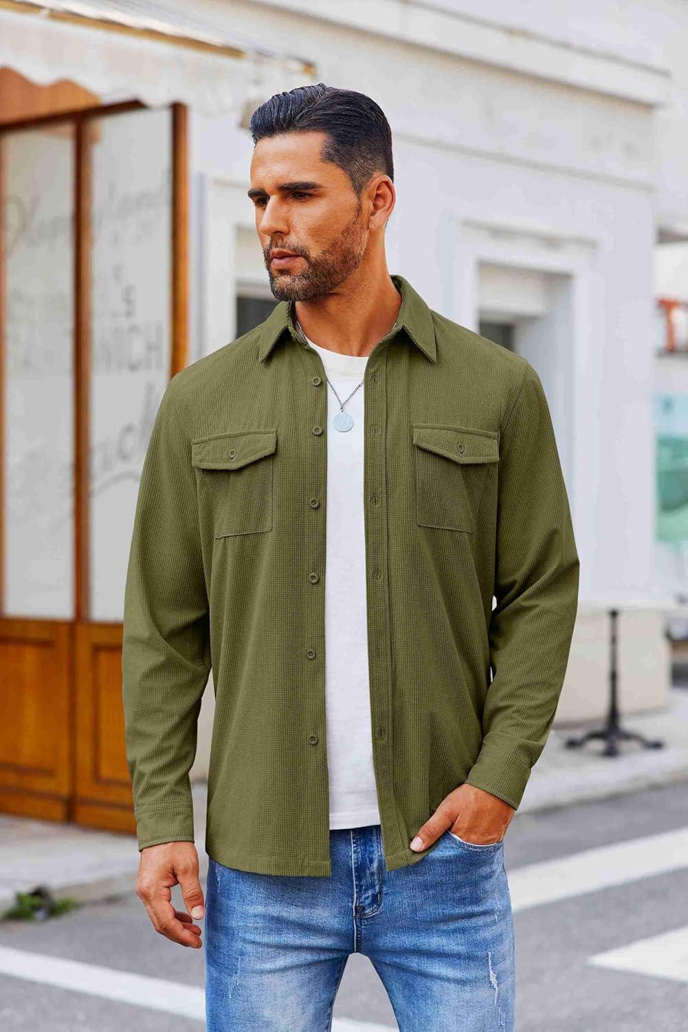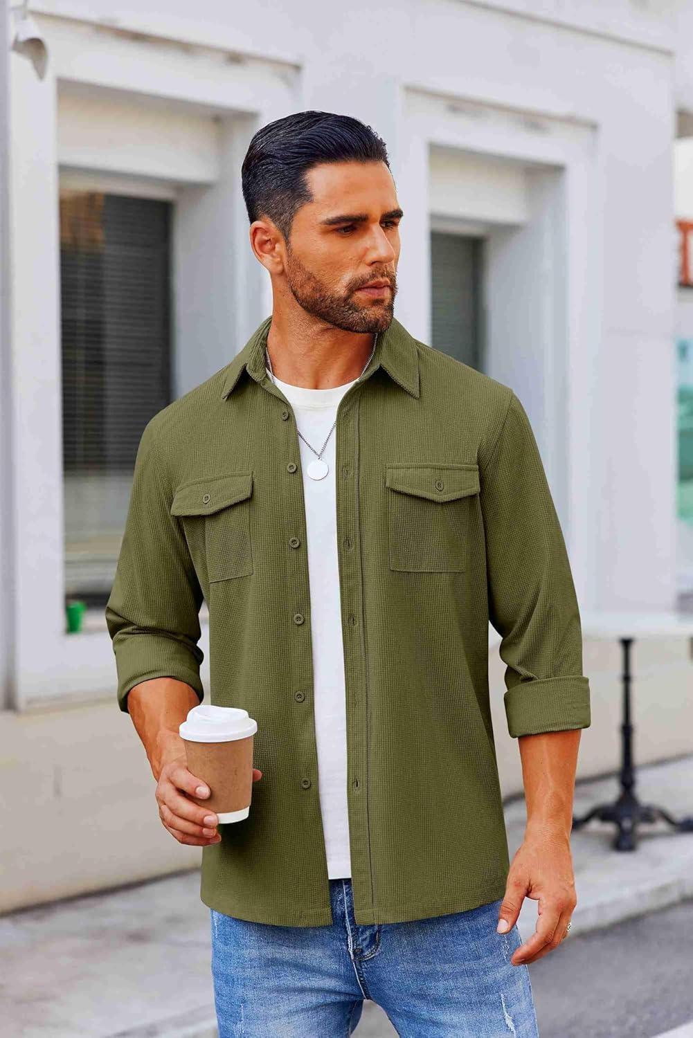 COOFANDY Men's Button Down Waffle Shirt Jacket Casual Long Sleeve Shacket Lightweight Overshirts with Flap Pockets(Olive Green)