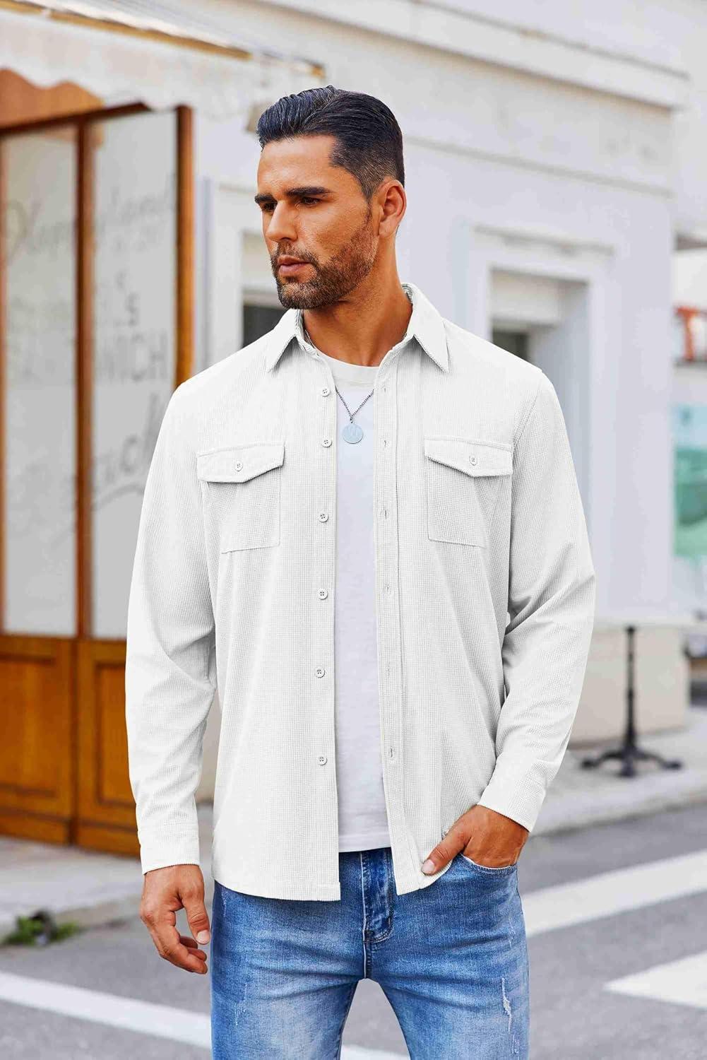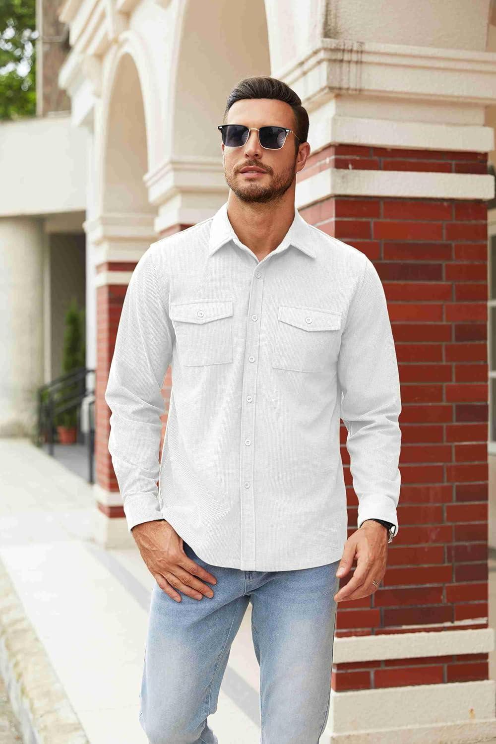 COOFANDY Men's Button Down Waffle Shirt Jacket Casual Long Sleeve Shacket Lightweight Overshirts with Flap Pockets(White)