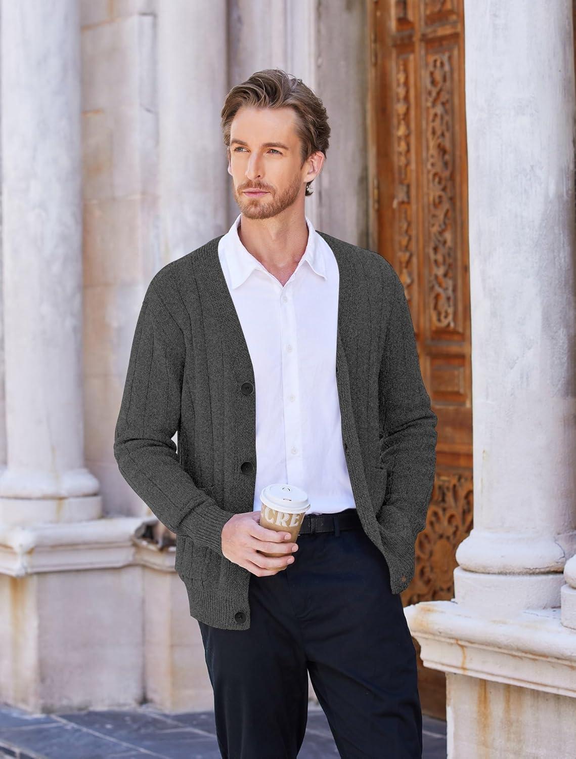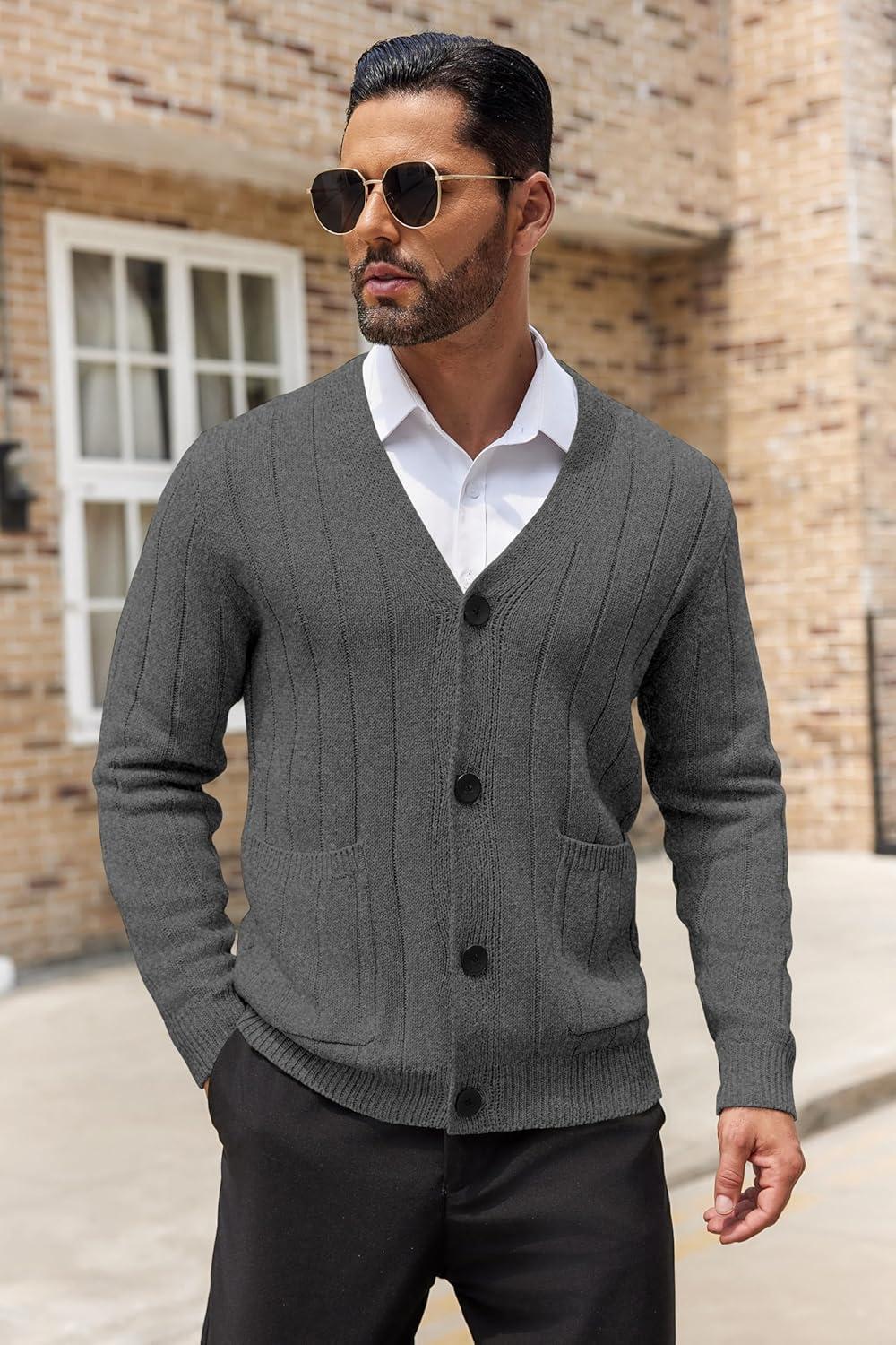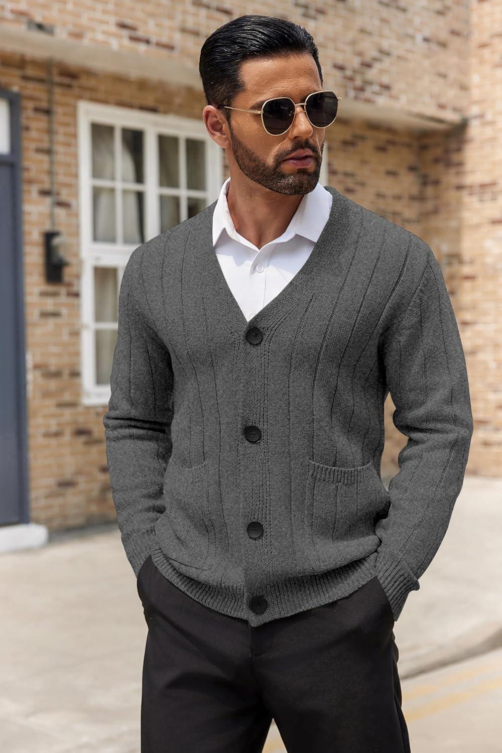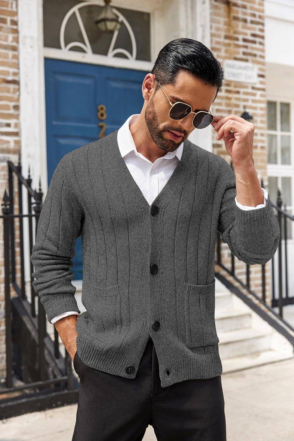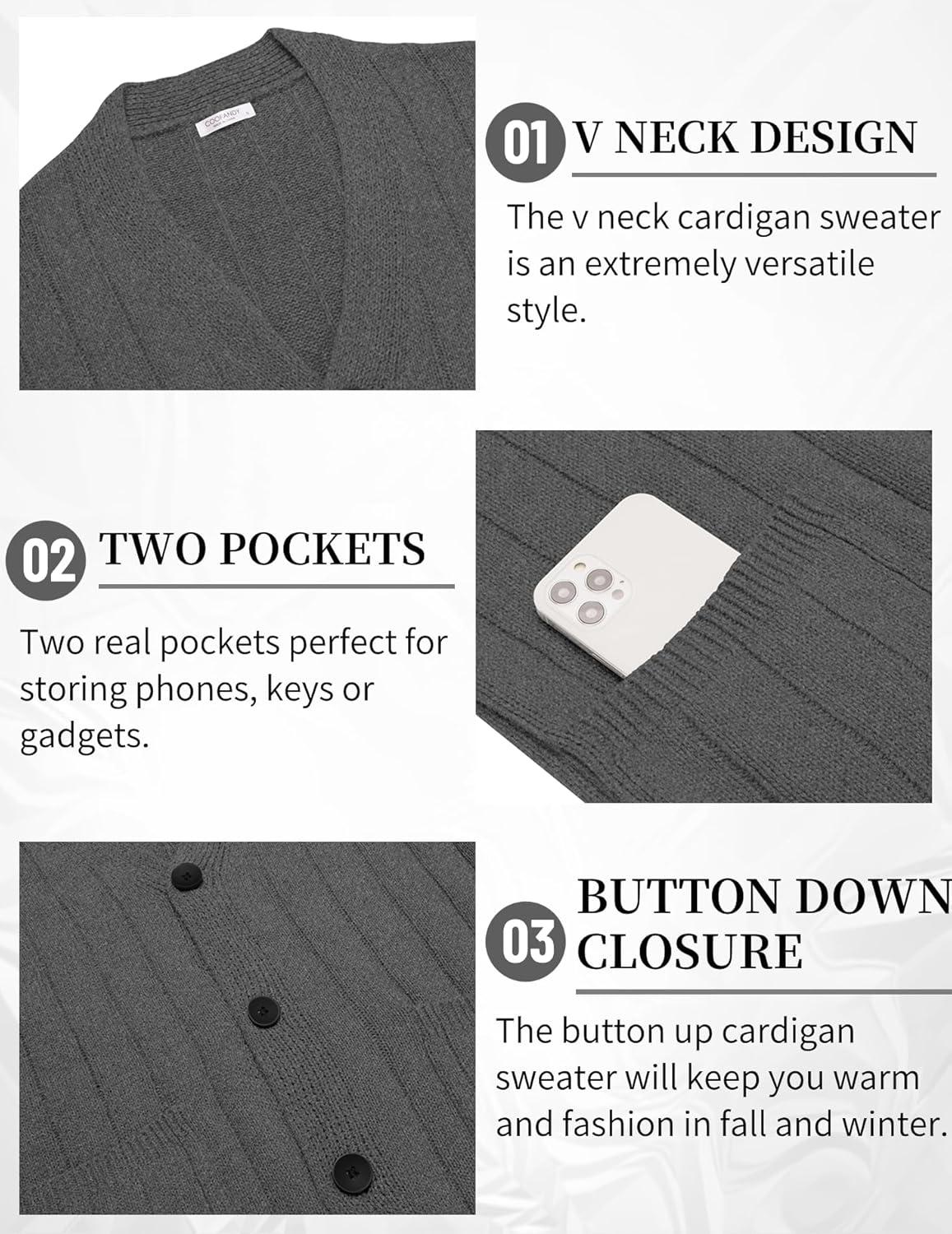 COOFANDY Men's Cardigan Sweater Cable Knit V Neck Button up Sweaters Ribbed Cardigan Sweater with Pockets(Dark Grey)
