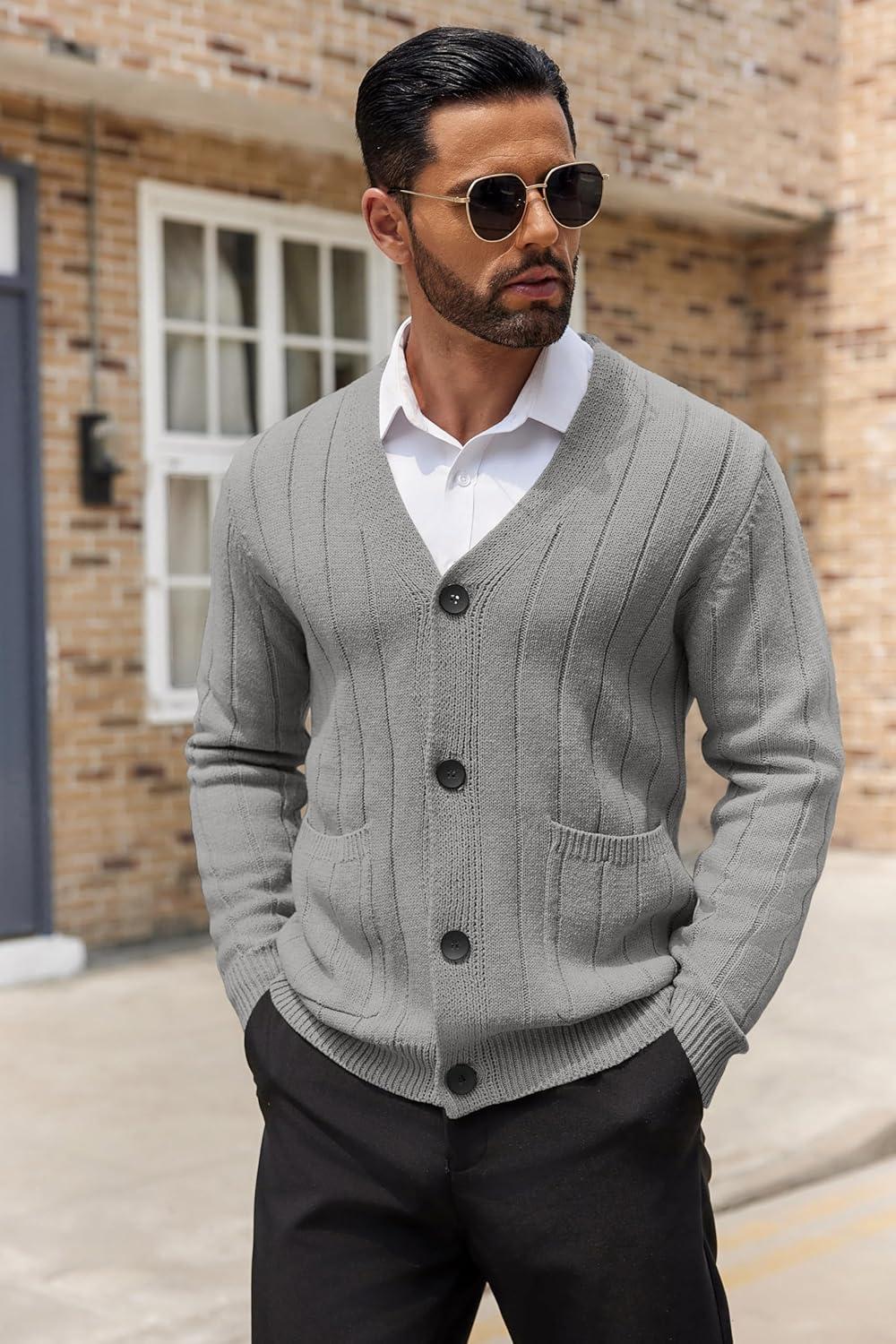 COOFANDY Men's Cardigan Sweater Cable Knit V Neck Button up Sweaters Ribbed Cardigan Sweater with Pockets(Light Grey)