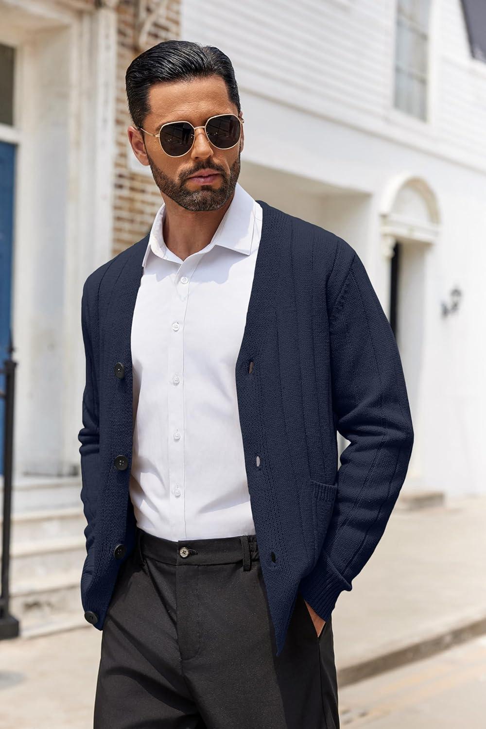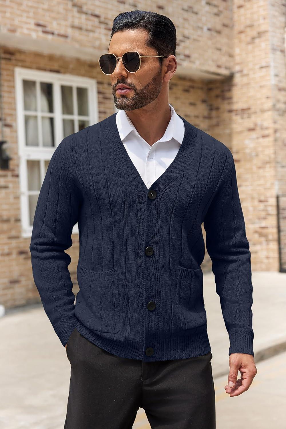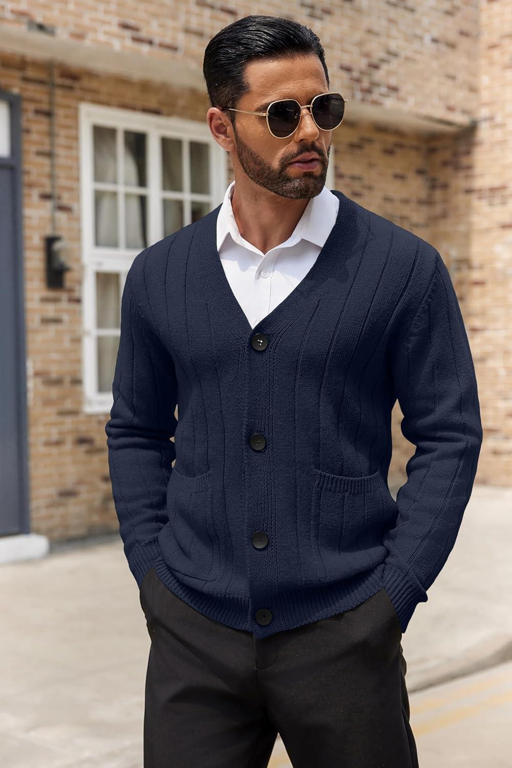 COOFANDY Men's Cardigan Sweater Cable Knit V Neck Button up Sweaters Ribbed Cardigan Sweater with Pockets(Navy Blue)
