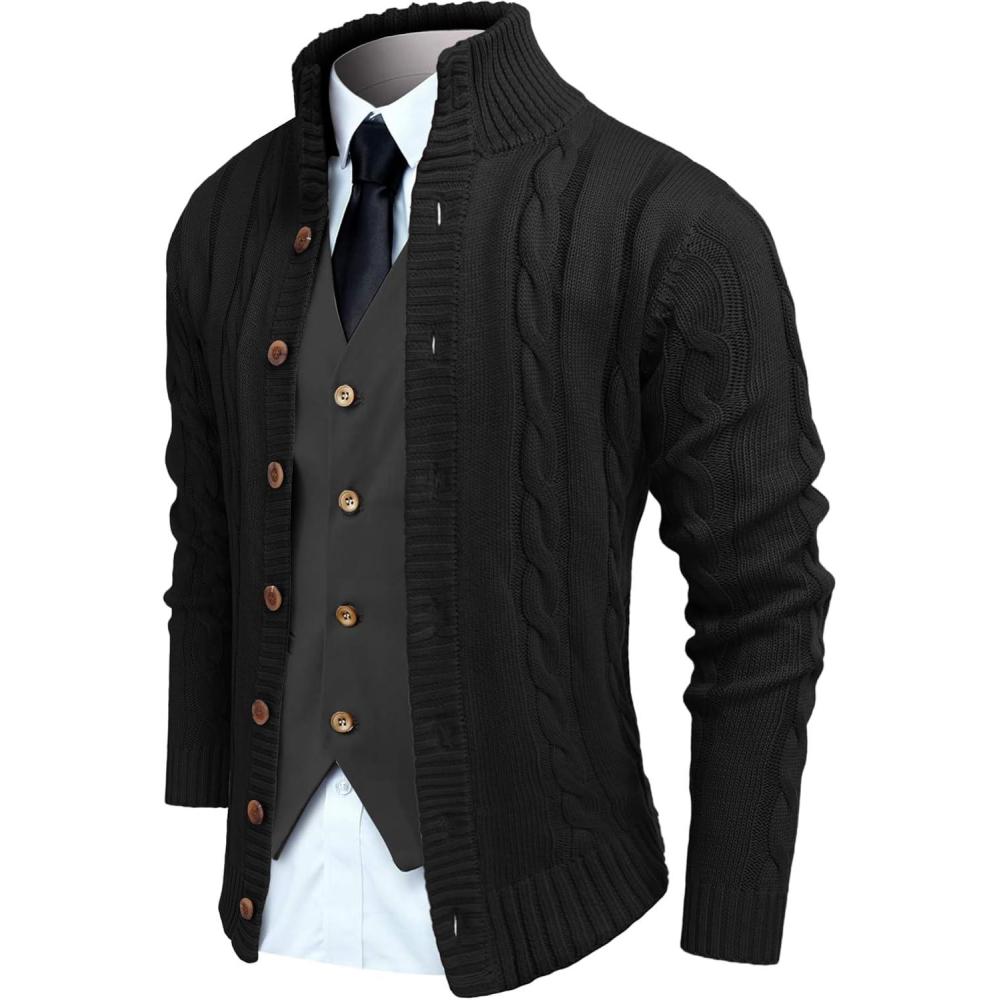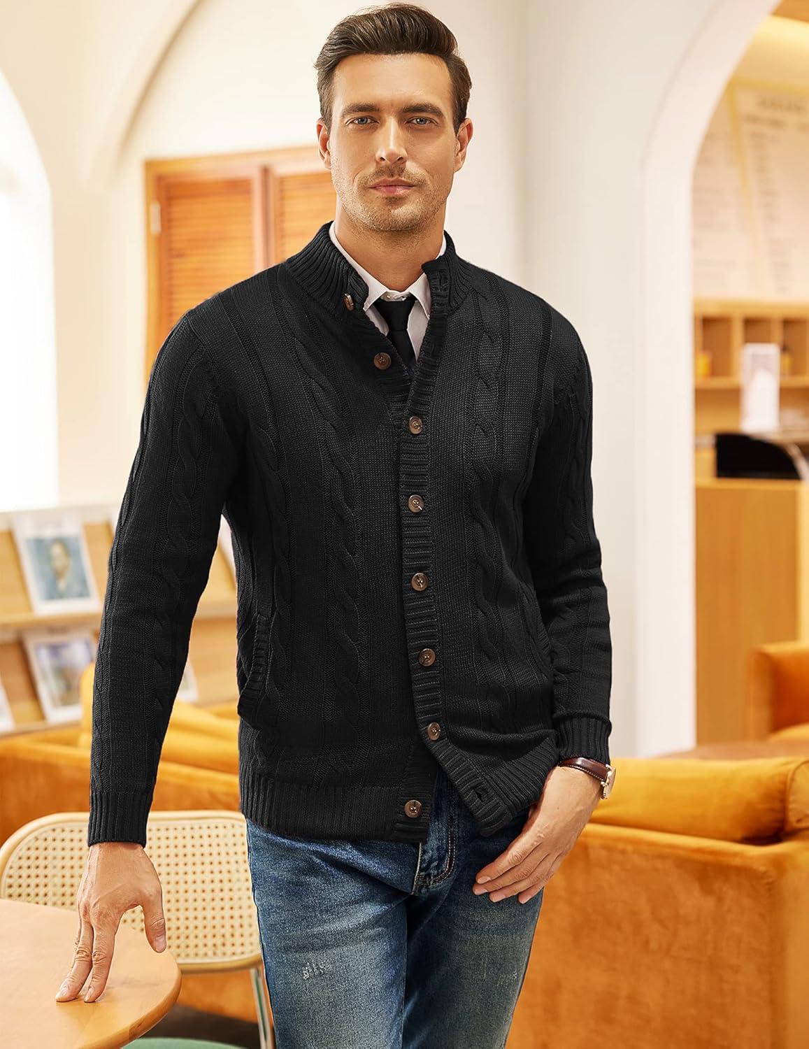 COOFANDY Men's Cardigan Sweater Slim Fit Stand Collar Cardigan Casual Cable Knitted Button Down Sweater with Pockets(Black)