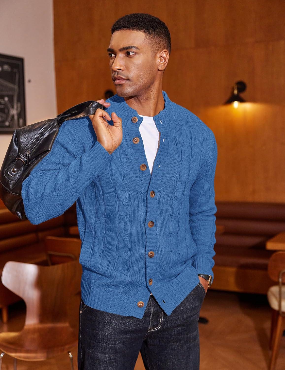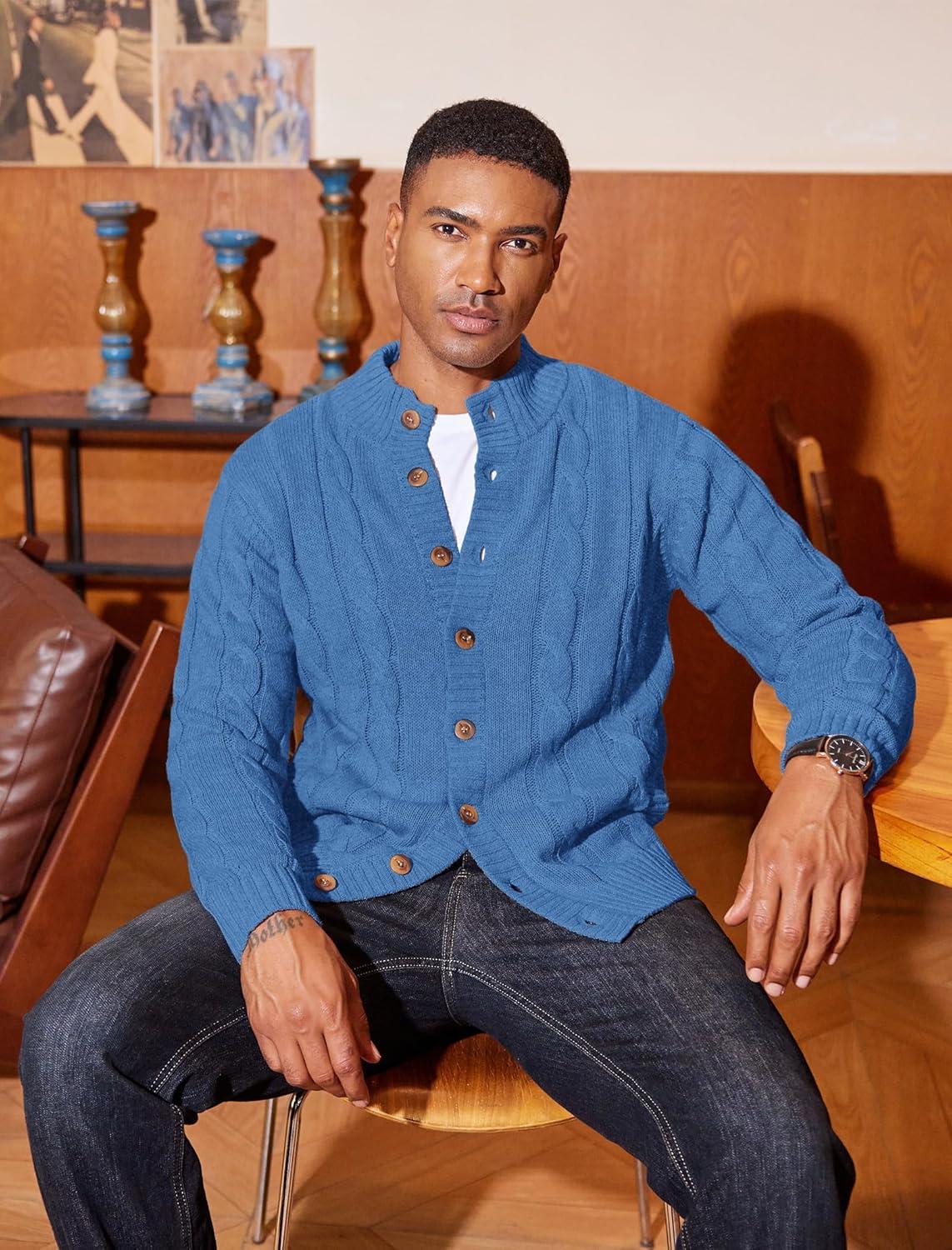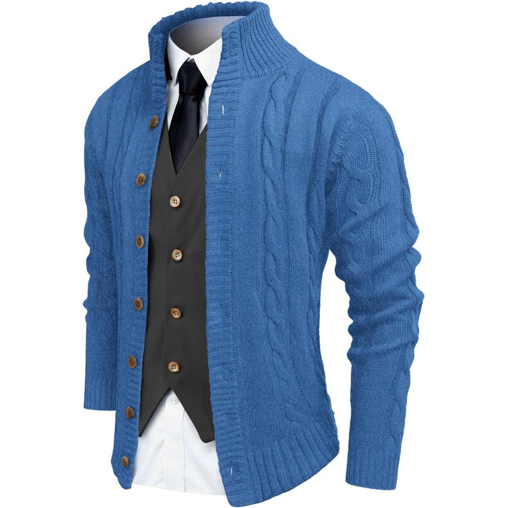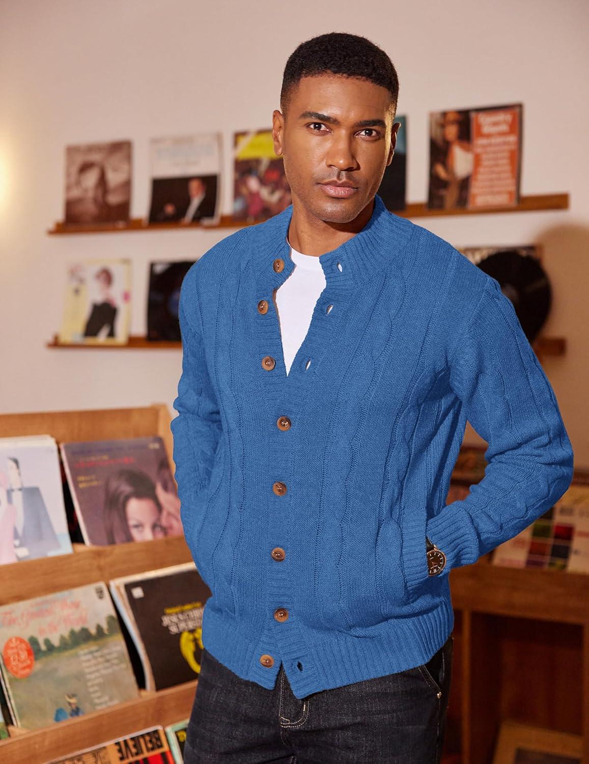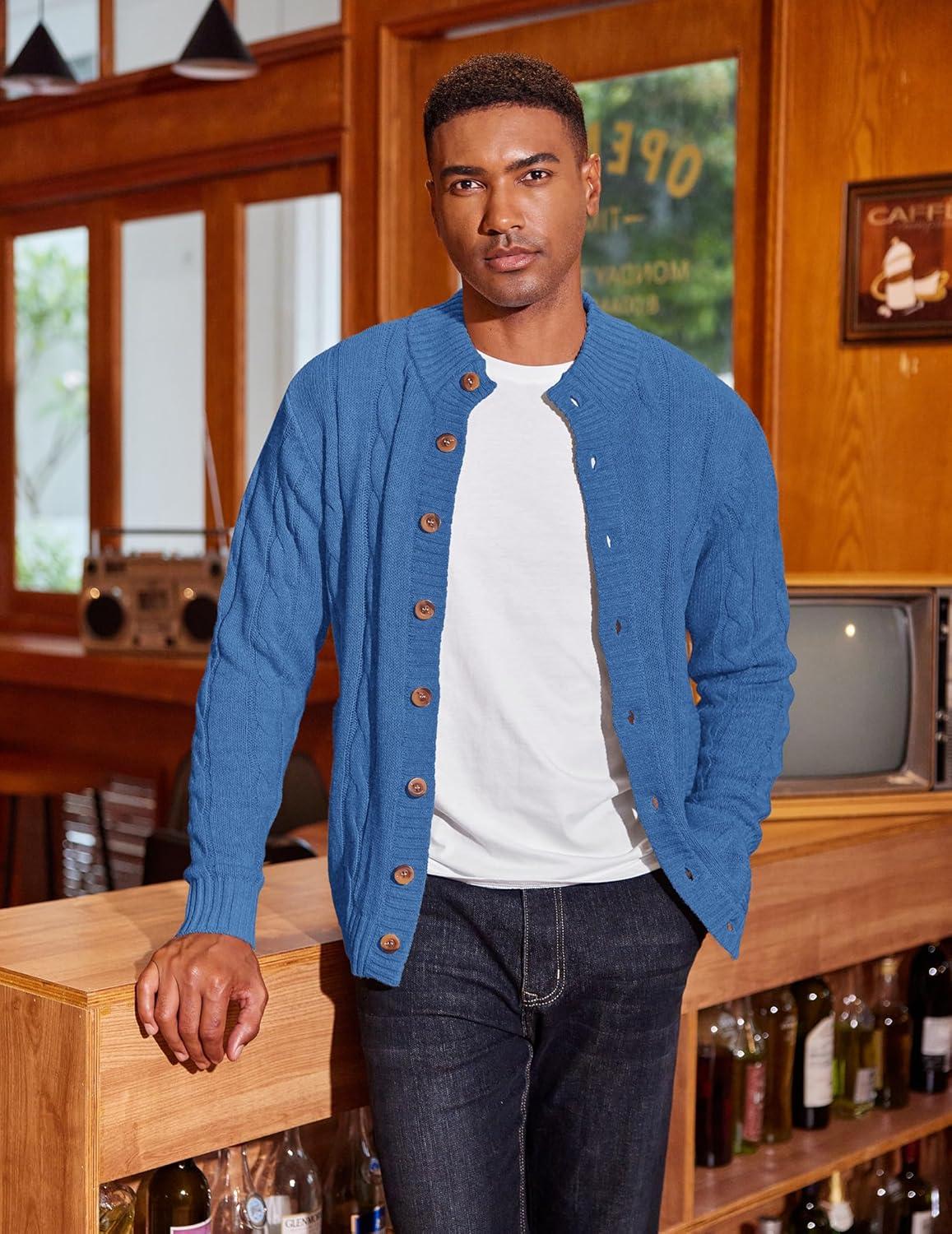 Get your hands on our exclusive COOFANDY Men’s Cardigan Sweater Slim Fit Stand Collar Cardigan Casual Cable Knitted Button Down Sweater with Pockets(Blue) collection, now at a discounted price.