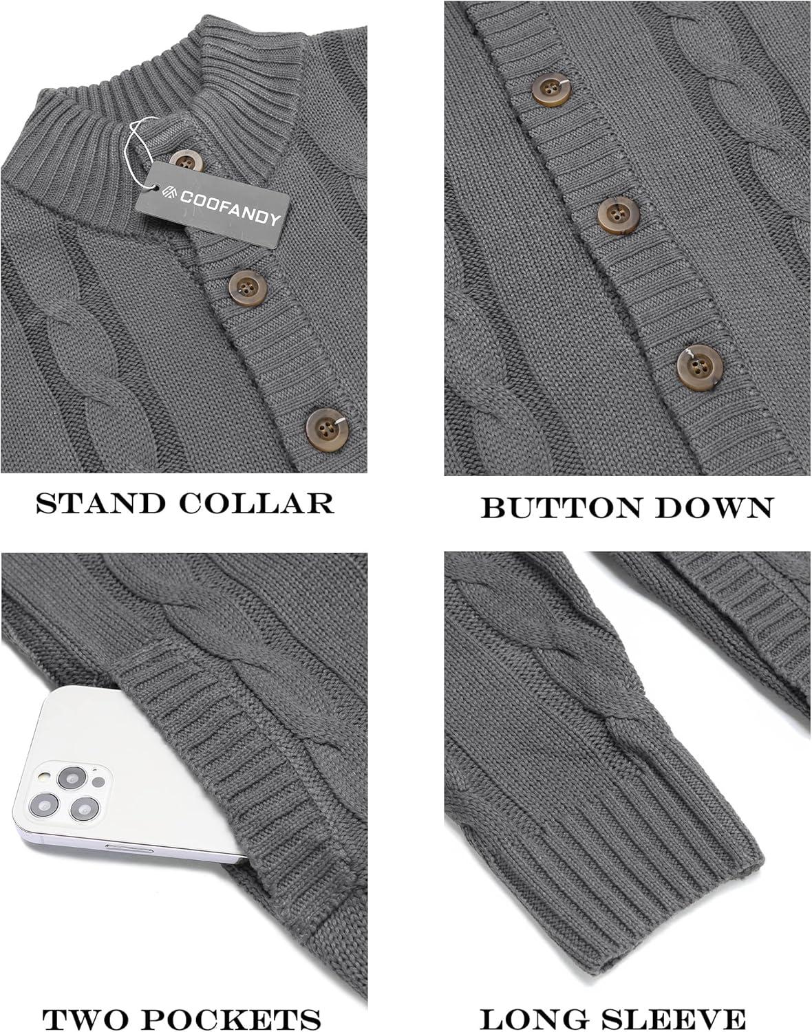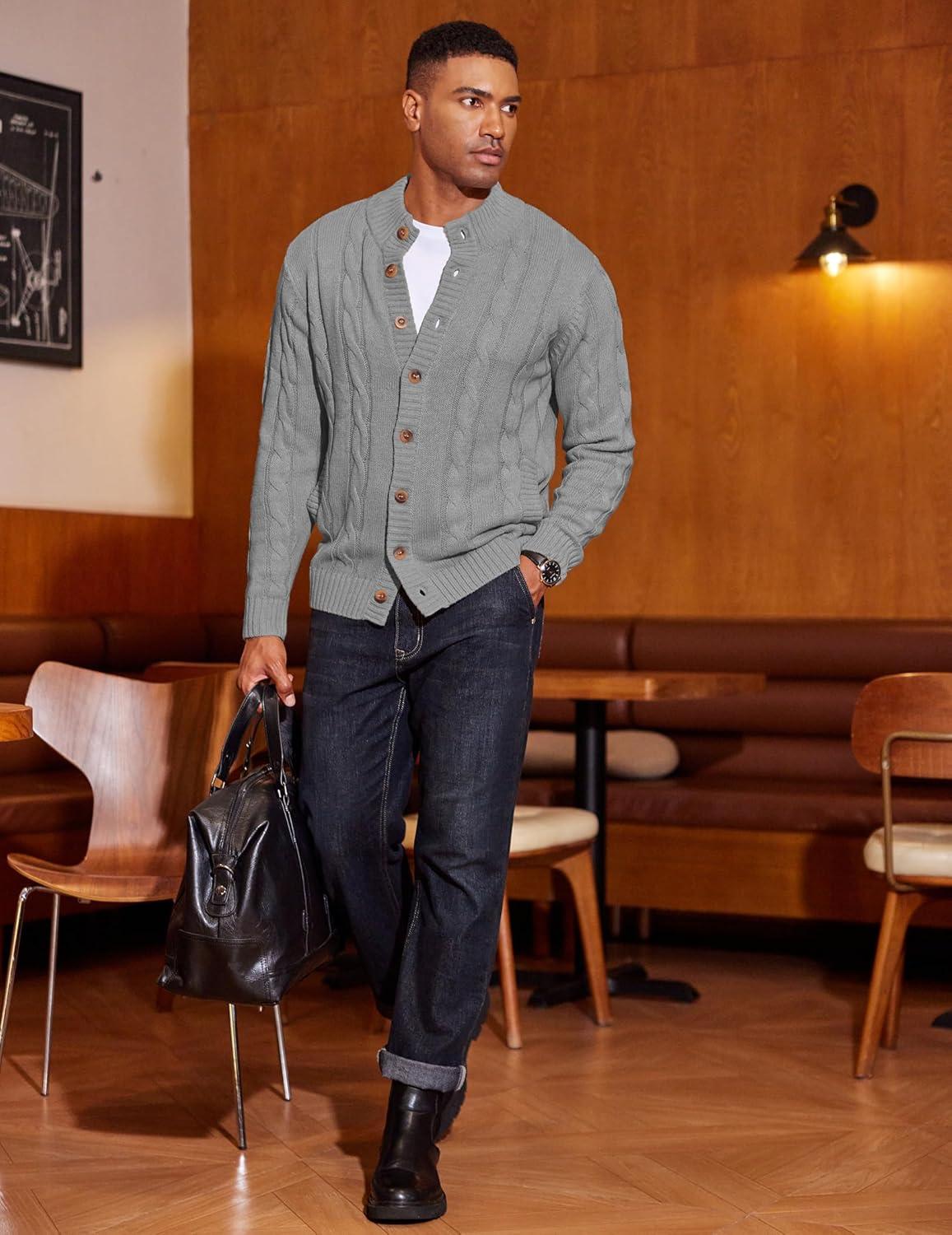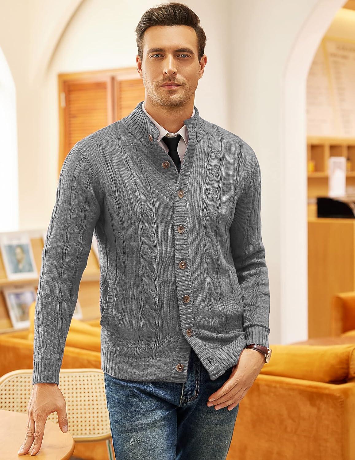 COOFANDY Men’s Cardigan Sweater Slim Fit Stand Collar Cardigan Casual Cable Knitted Button Down Sweater with Pockets(Grey)