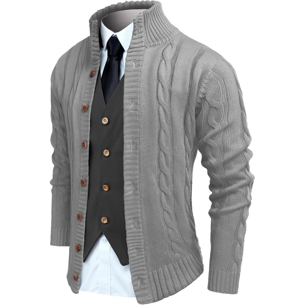 COOFANDY Men's Cardigan Sweater Slim Fit Stand Collar Cardigan Casual Cable Knitted Button Down Sweater with Pockets(Grey)