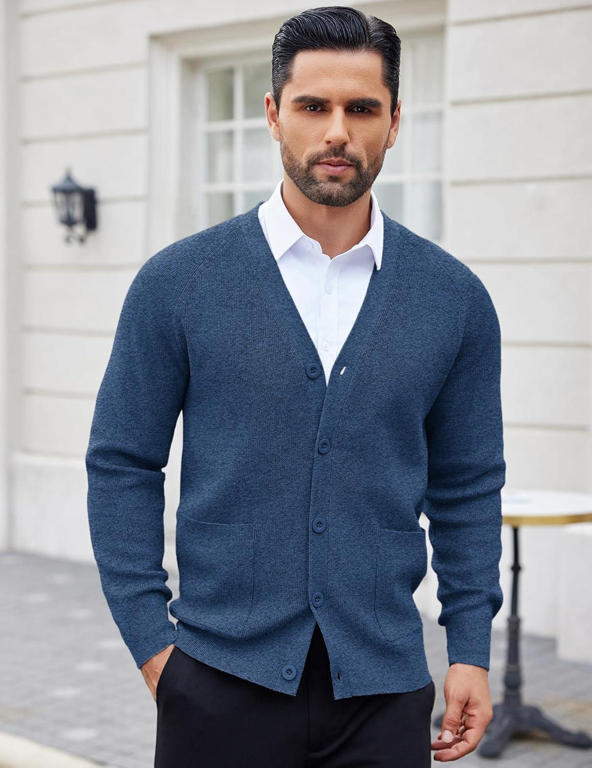 COOFANDY Men's Cardigan Sweaters with Button Lightweight Casual V Neck Long Sleeve Pockets Knitted Sweater(Blue)