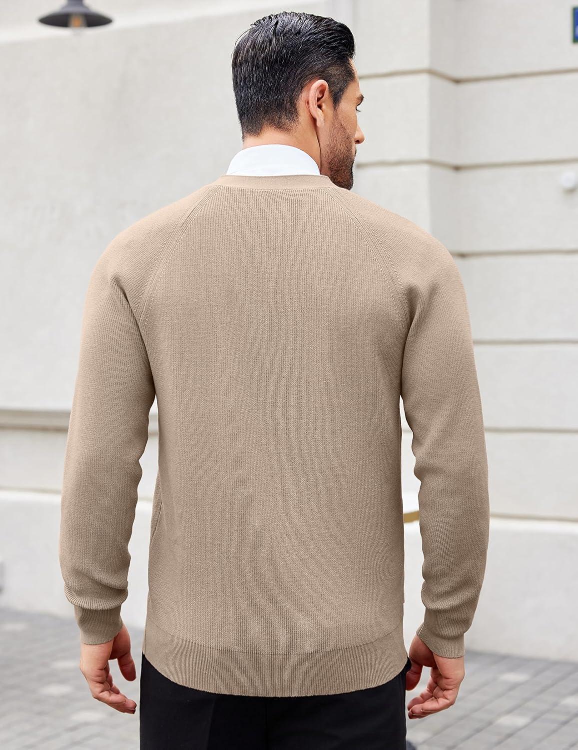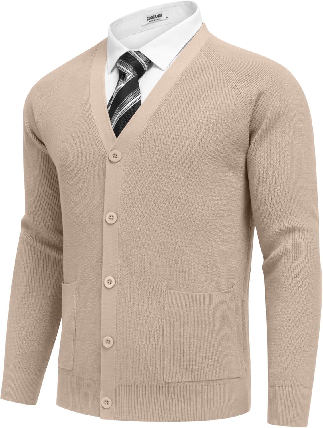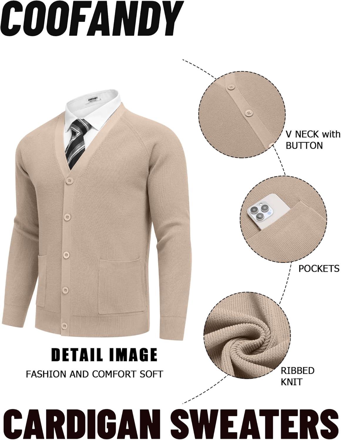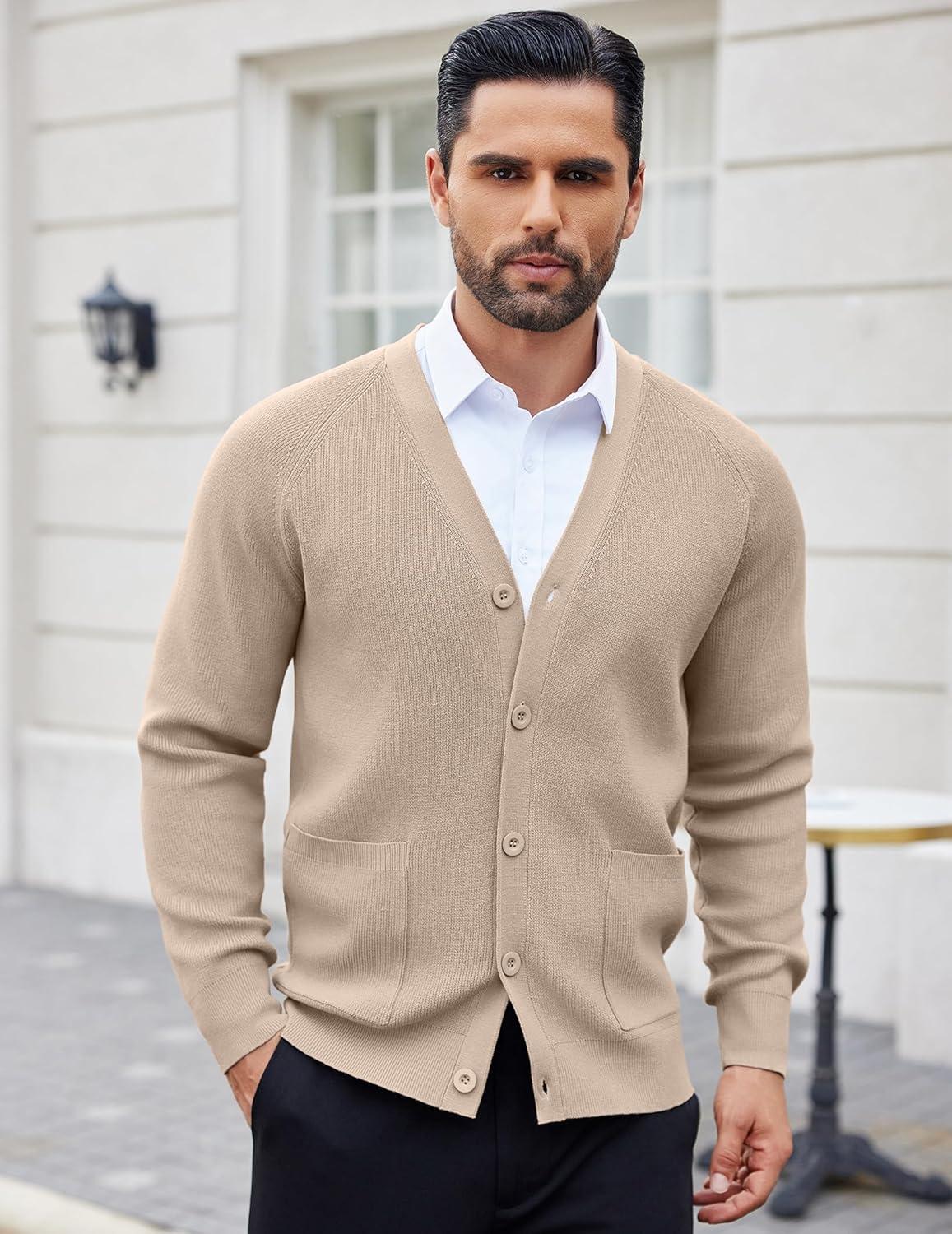 COOFANDY Men's Cardigan Sweaters with Button Lightweight Casual V Neck Long Sleeve Pockets Knitted Sweater(Kahki)