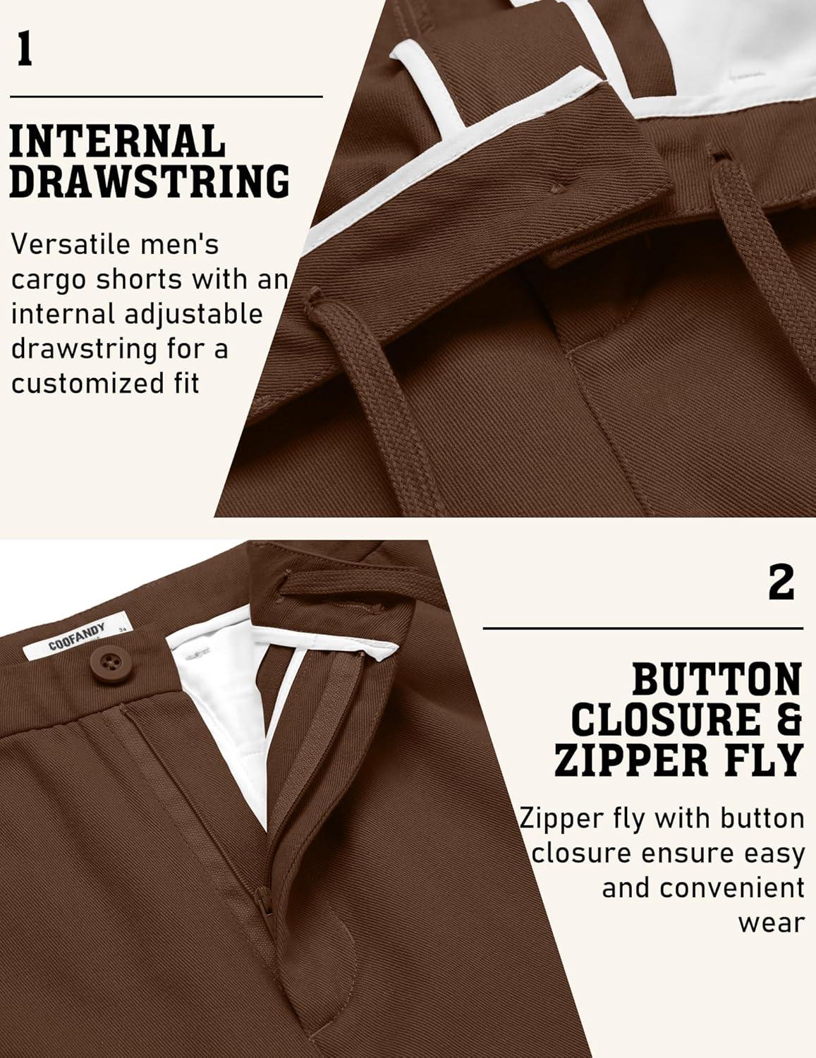 COOFANDY Men's Cargo Shorts 9" Relaxed Fit Casual Shorts Internal Drawstring Outdoor Hiking Shorts with Multi Pockets(Brown)