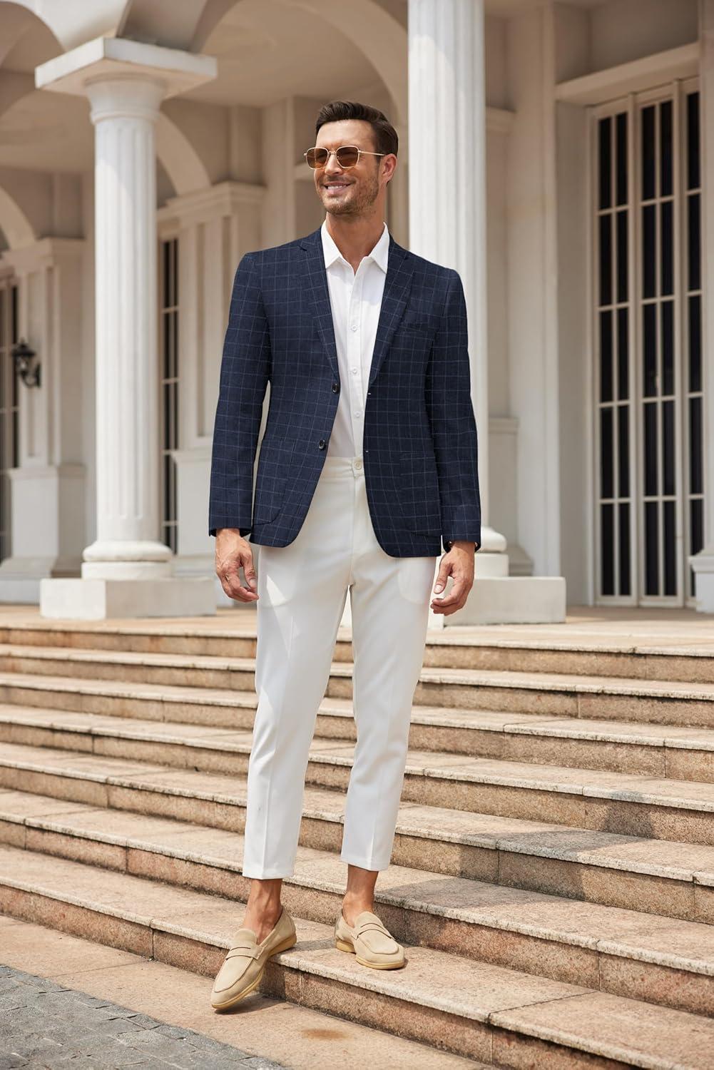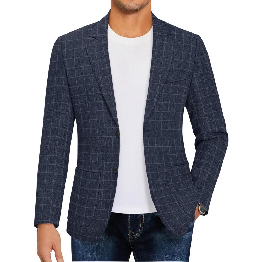 imageCOOFANDY Mens Casual Blazer Slim Fit Sport Coat Lightweight Two Button Suit JacketsPlaid Blazer Navy Blue
