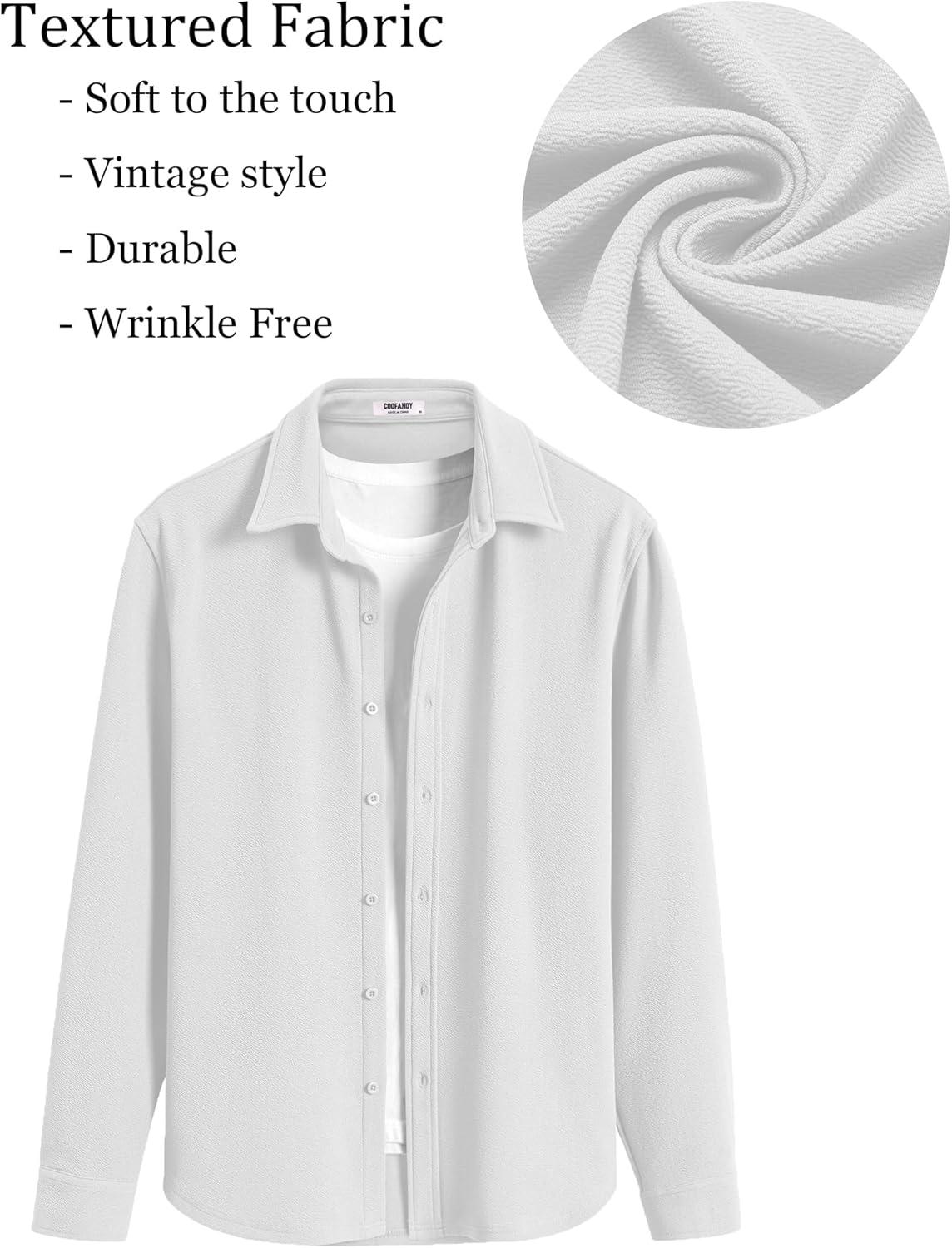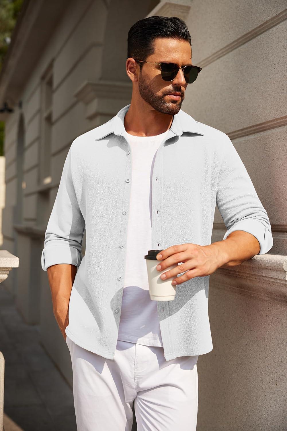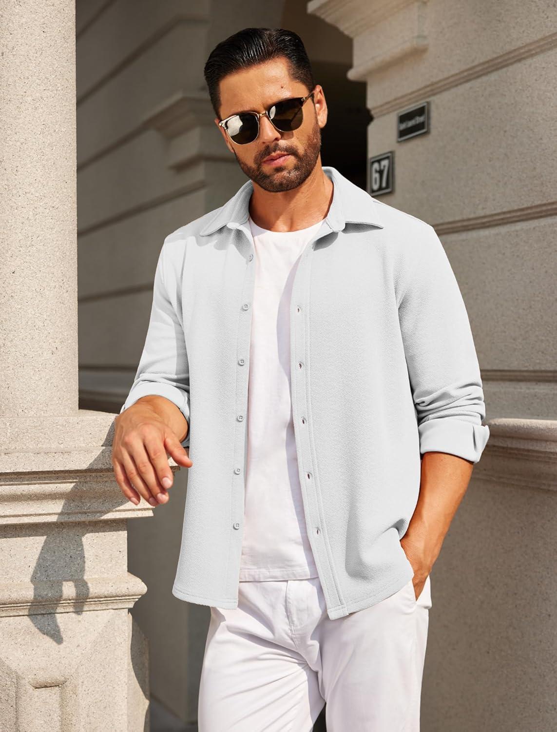 COOFANDY Mens Casual Button Down Shirt Long Sleeve Lightweight Jacket Fashion Textured Shirts(White)