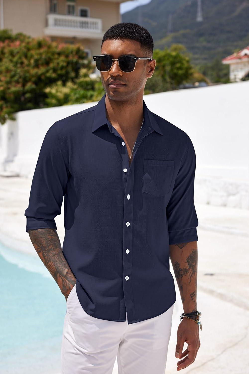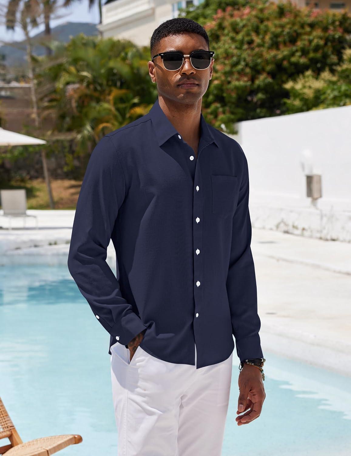 COOFANDY Men’s Casual Button Down Shirt Long Sleeve Linen Chambray Shirt(1- Royal Blue)
