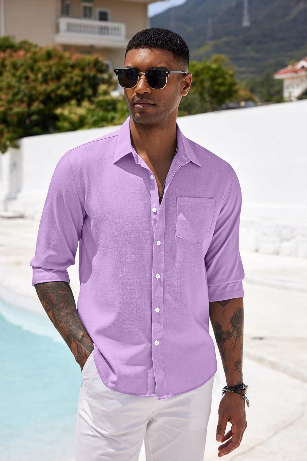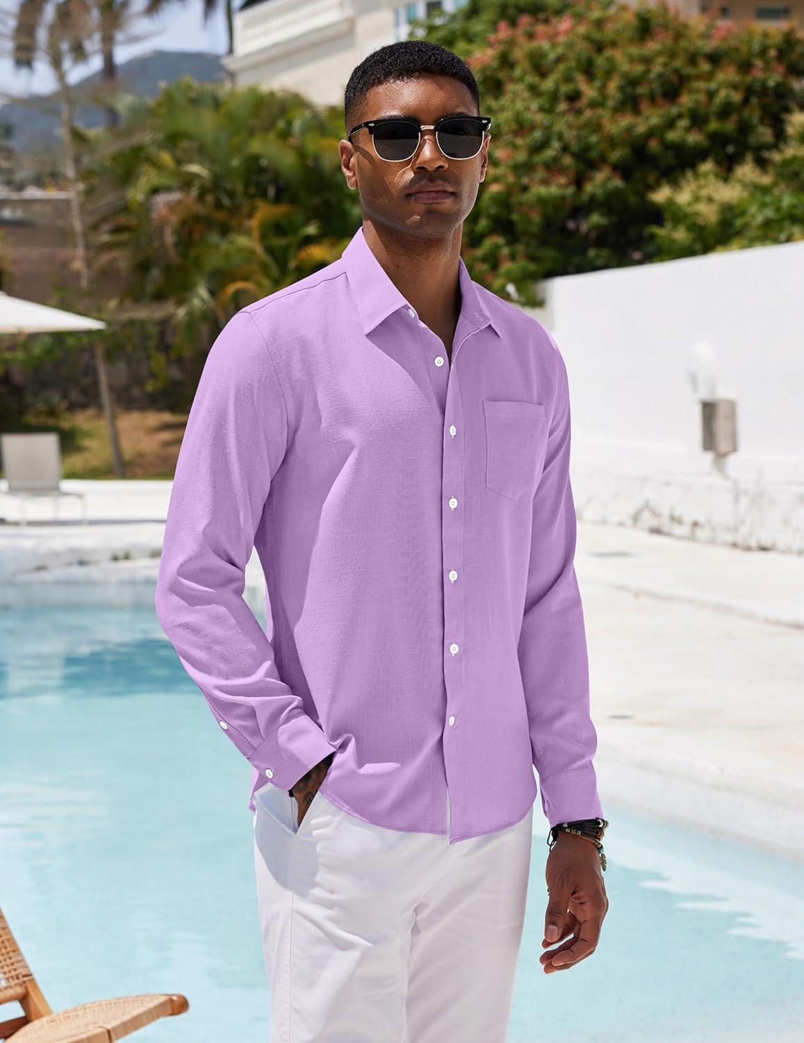 COOFANDY Men’s Casual Button Down Shirt Long Sleeve Linen Chambray Shirt(Purple)