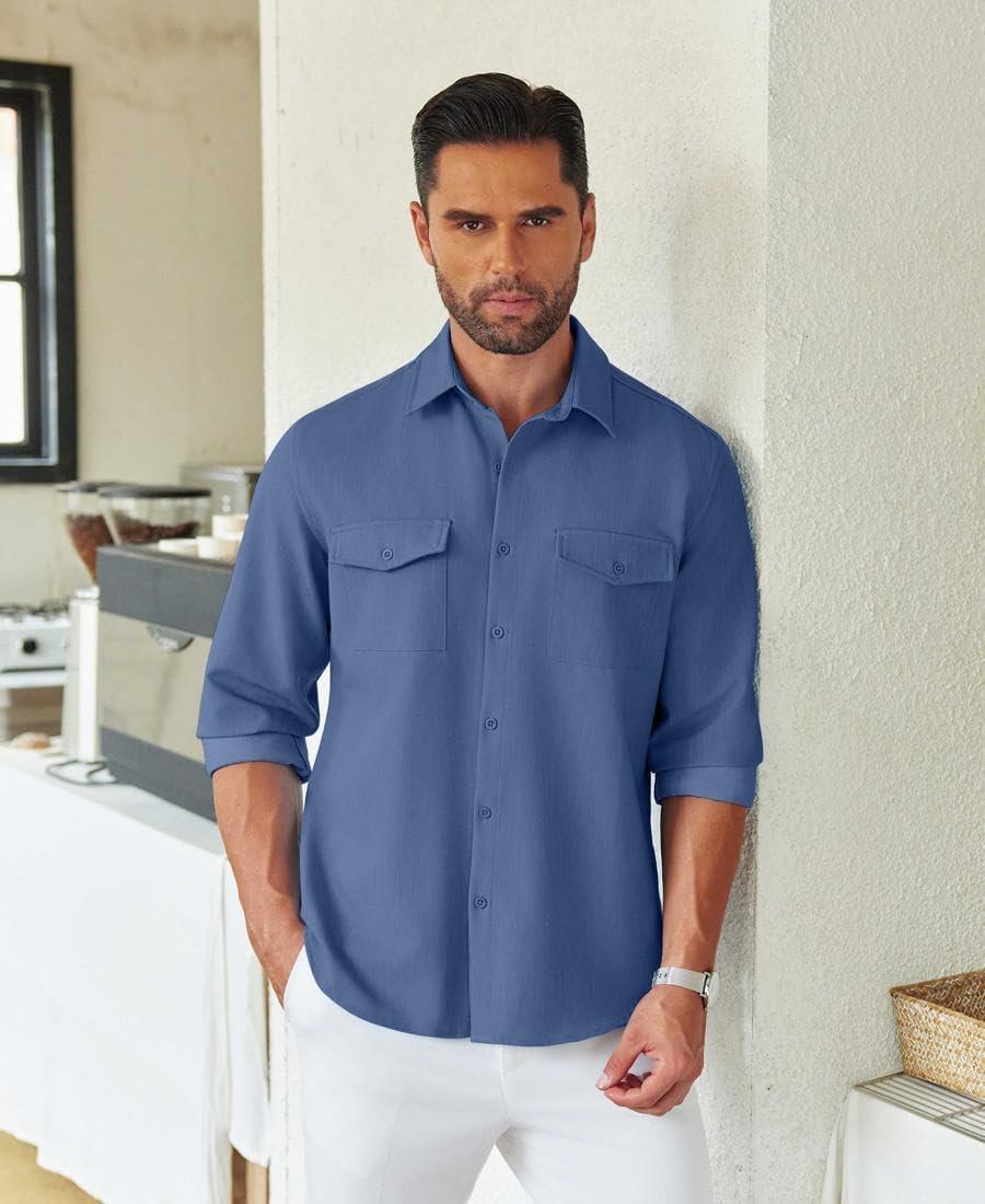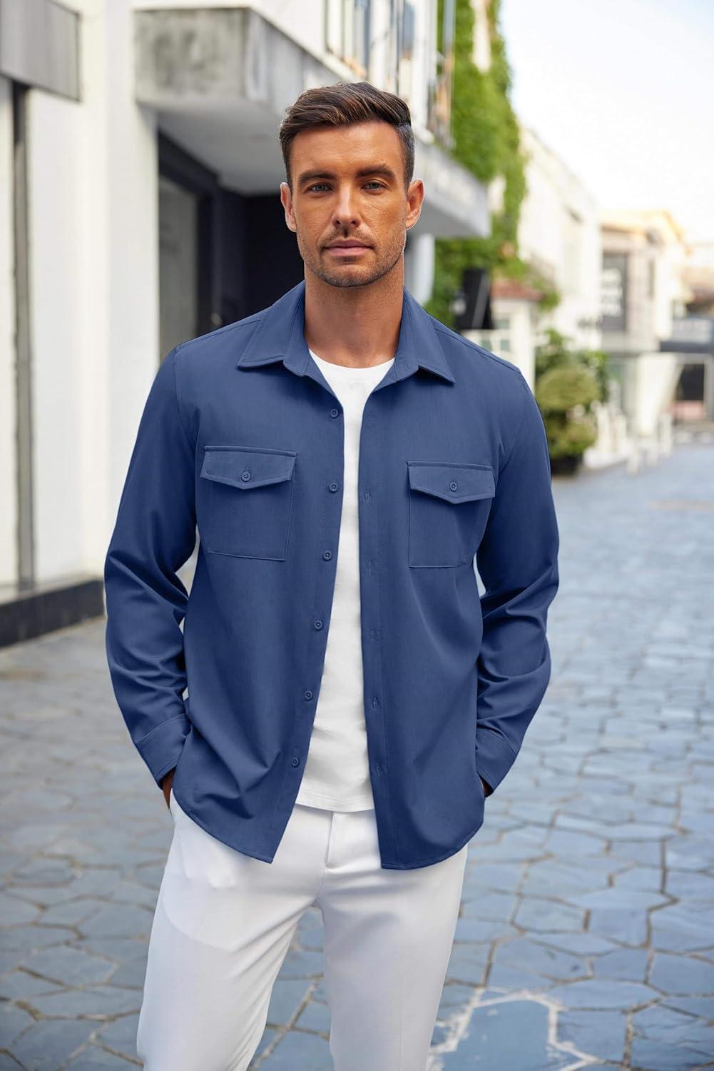 COOFANDY Men's Casual Button Down Shirt Long Sleeve Untucked Shirt Stretch Denim Dress Shirt with Pockets(Deep Blue)