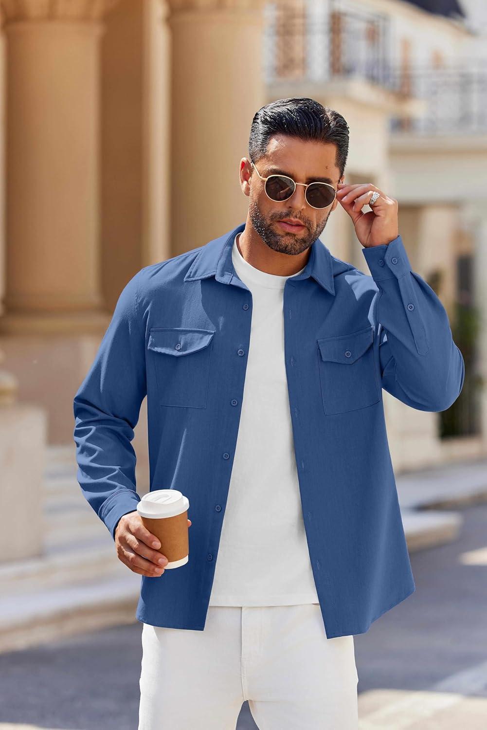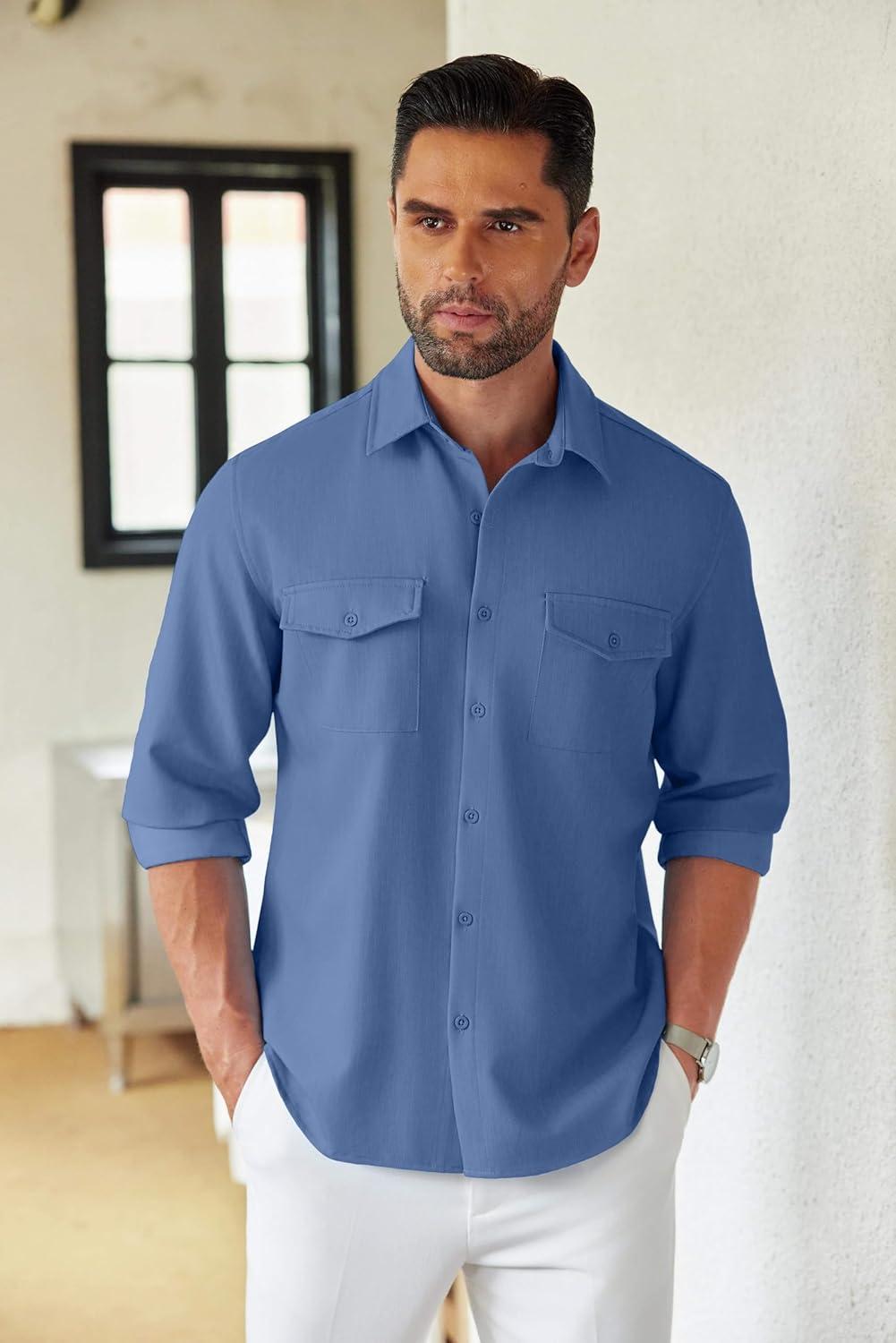 COOFANDY Men’s Casual Button Down Shirt Long Sleeve Untucked Shirt Stretch Denim Dress Shirt with Pockets(Deep Blue)
