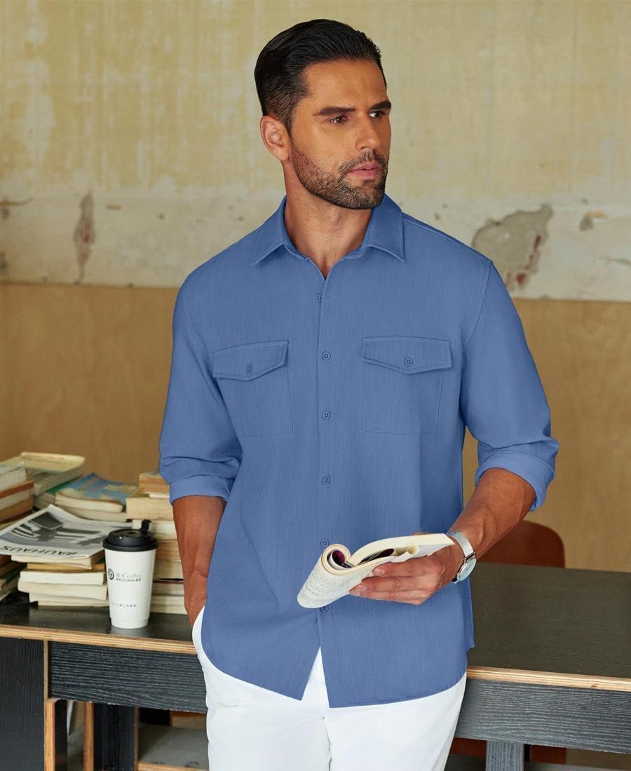 COOFANDY Men's Casual Button Down Shirt Long Sleeve Untucked Shirt Stretch Denim Dress Shirt with Pockets(Denim Blue)