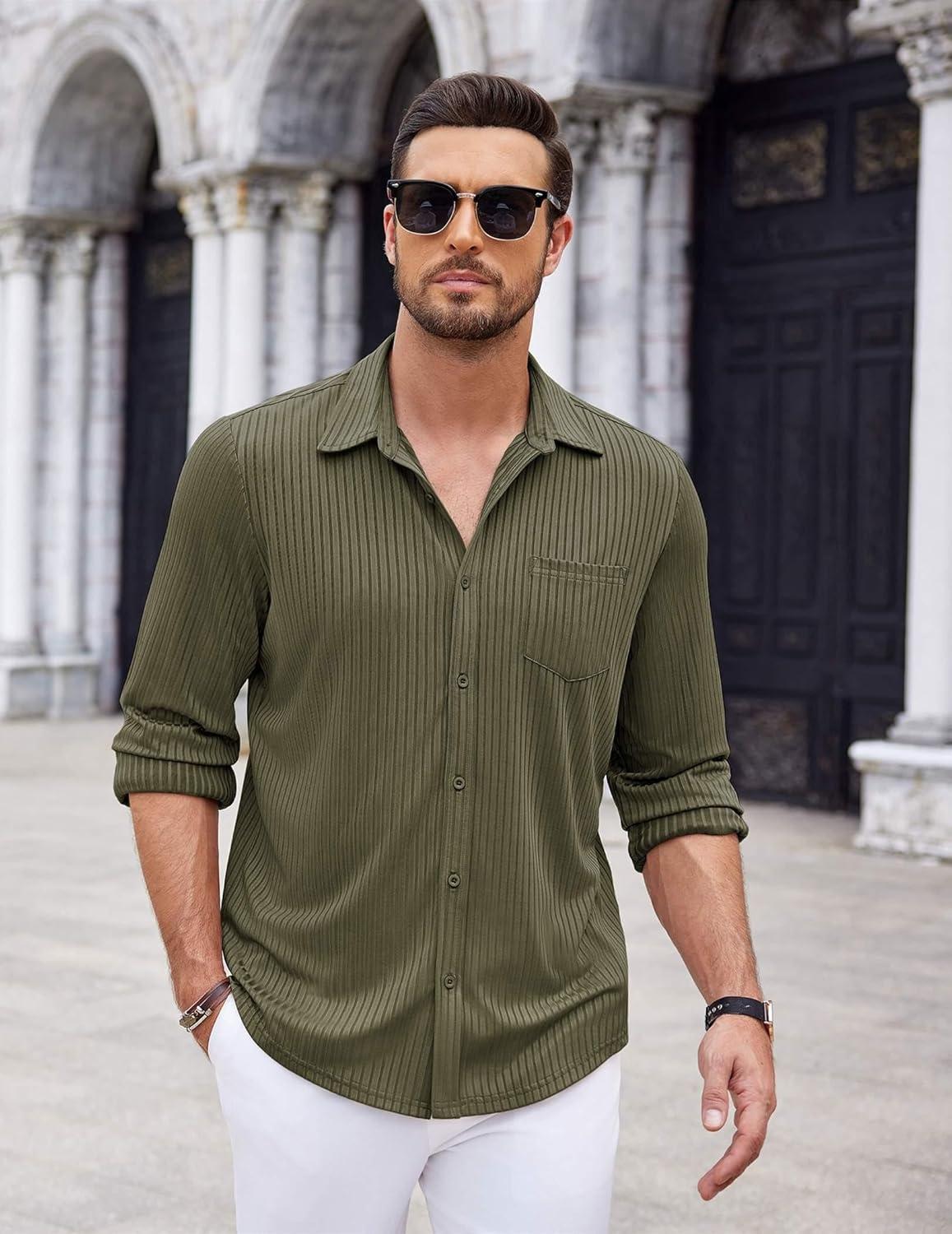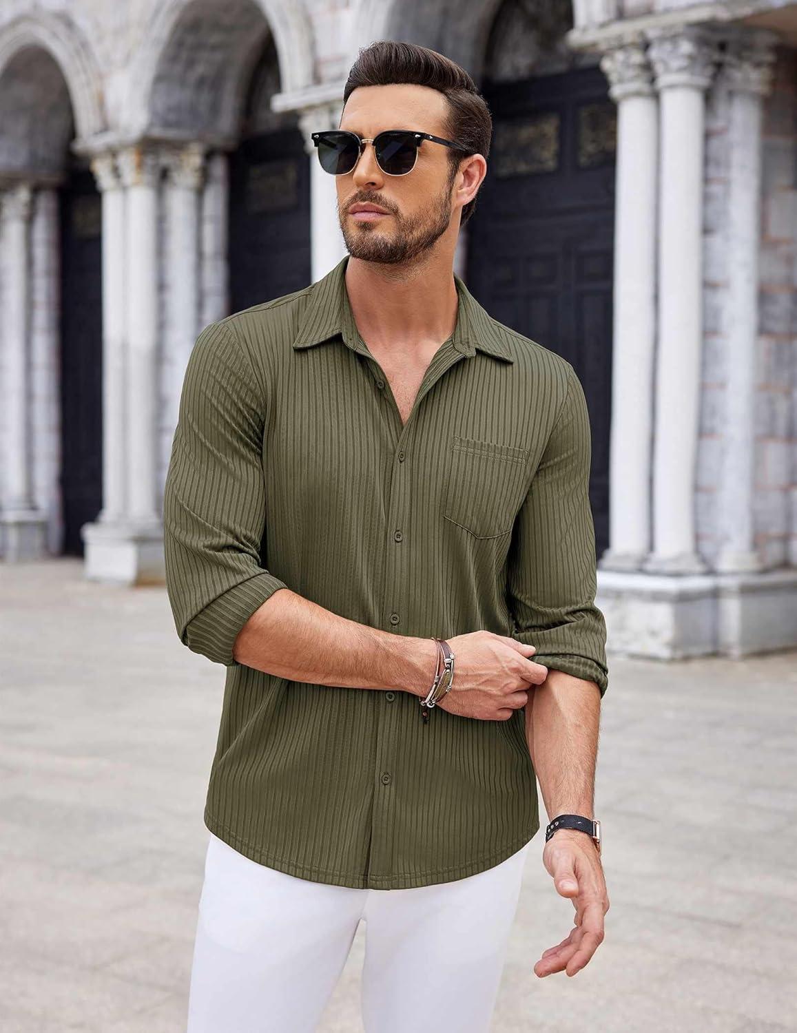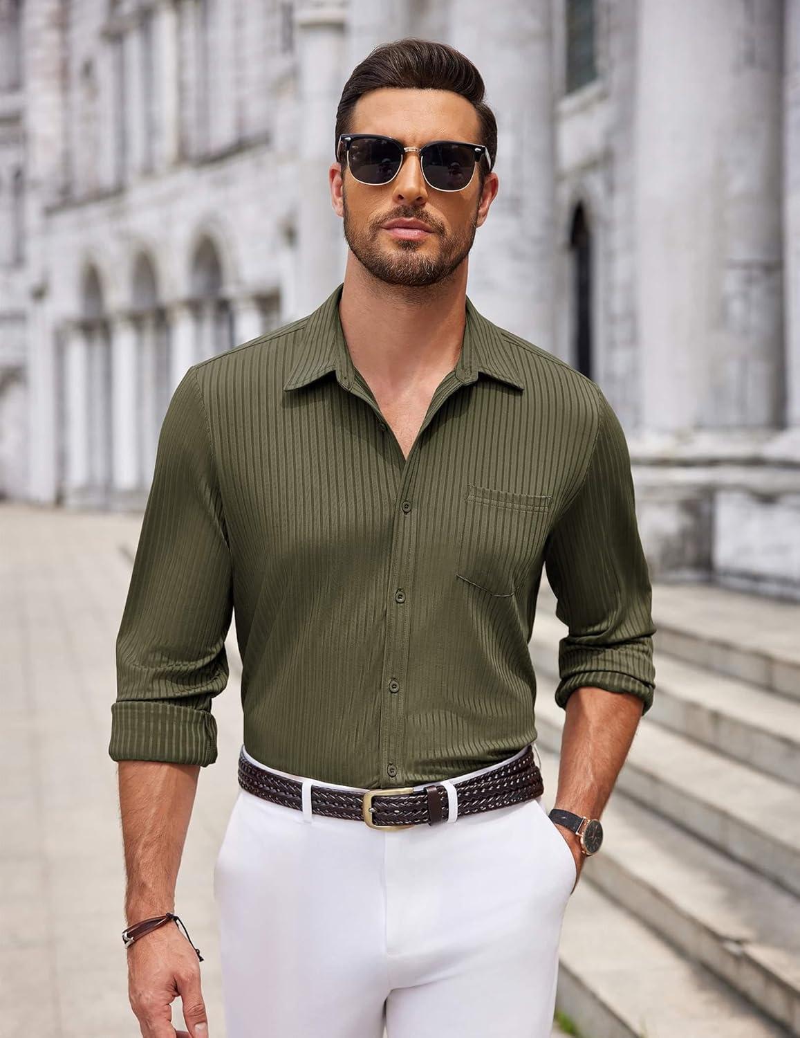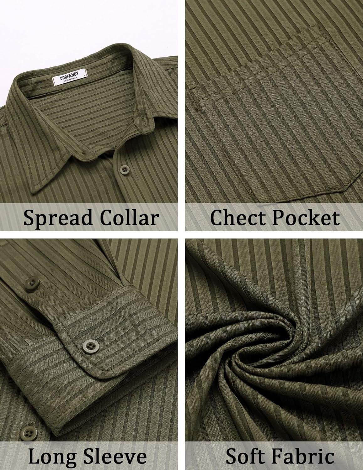 COOFANDY Men's Casual Button Down Shirt Long Sleeve Wrinkle Free Shirts Loose fit Shirt Textured Stretch Shirts with Pocket(Army Green)