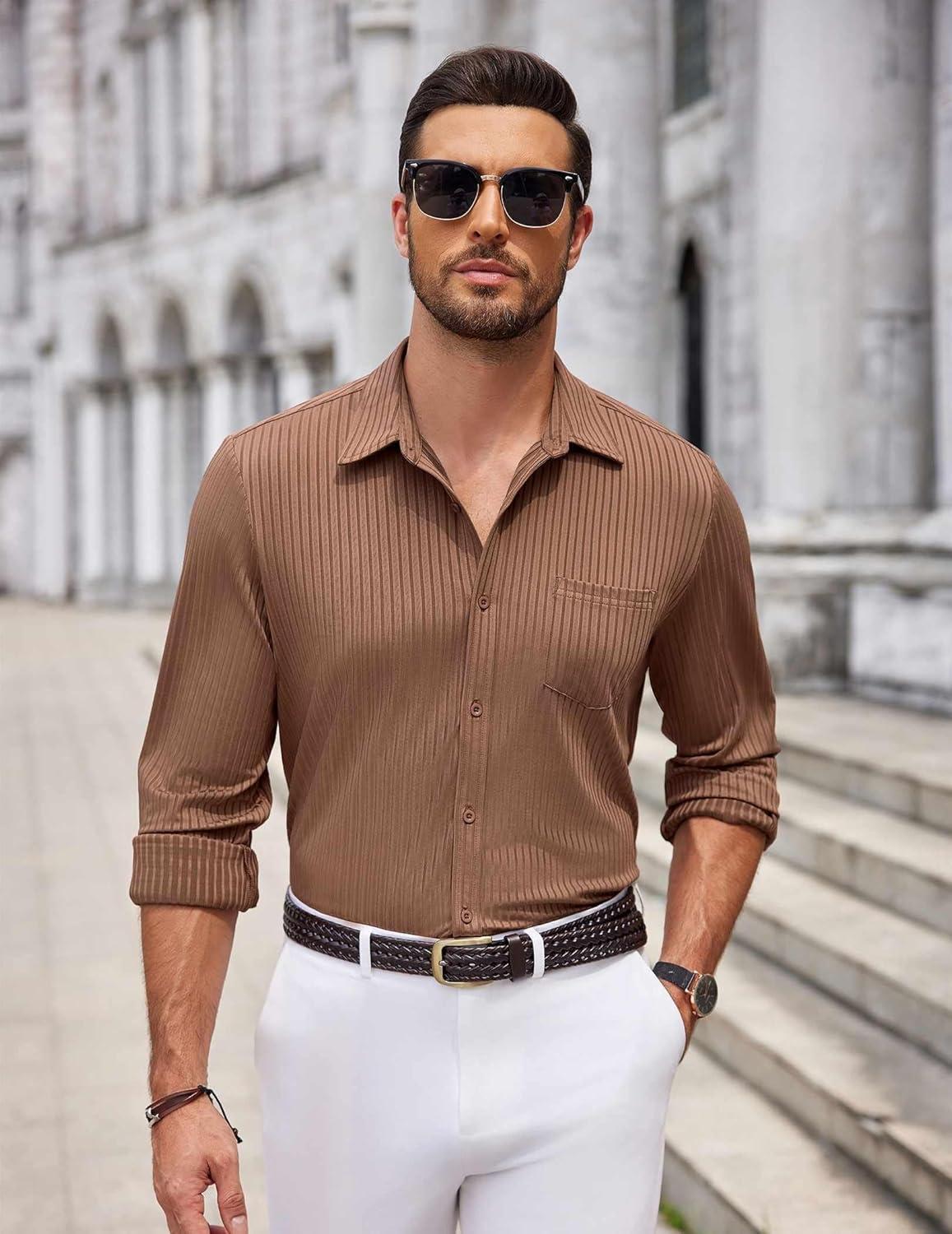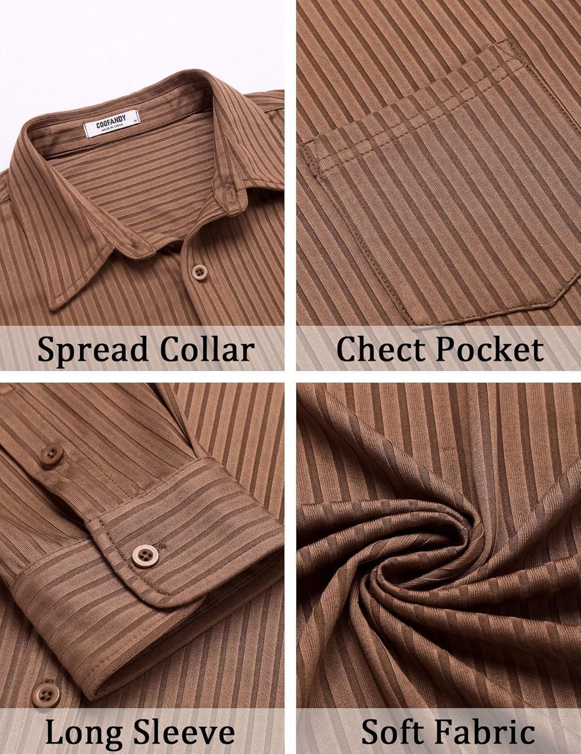 COOFANDY Men's Casual Button Down Shirt Long Sleeve Wrinkle Free Shirts Loose fit Shirt Textured Stretch Shirts with Pocket(Brown)
