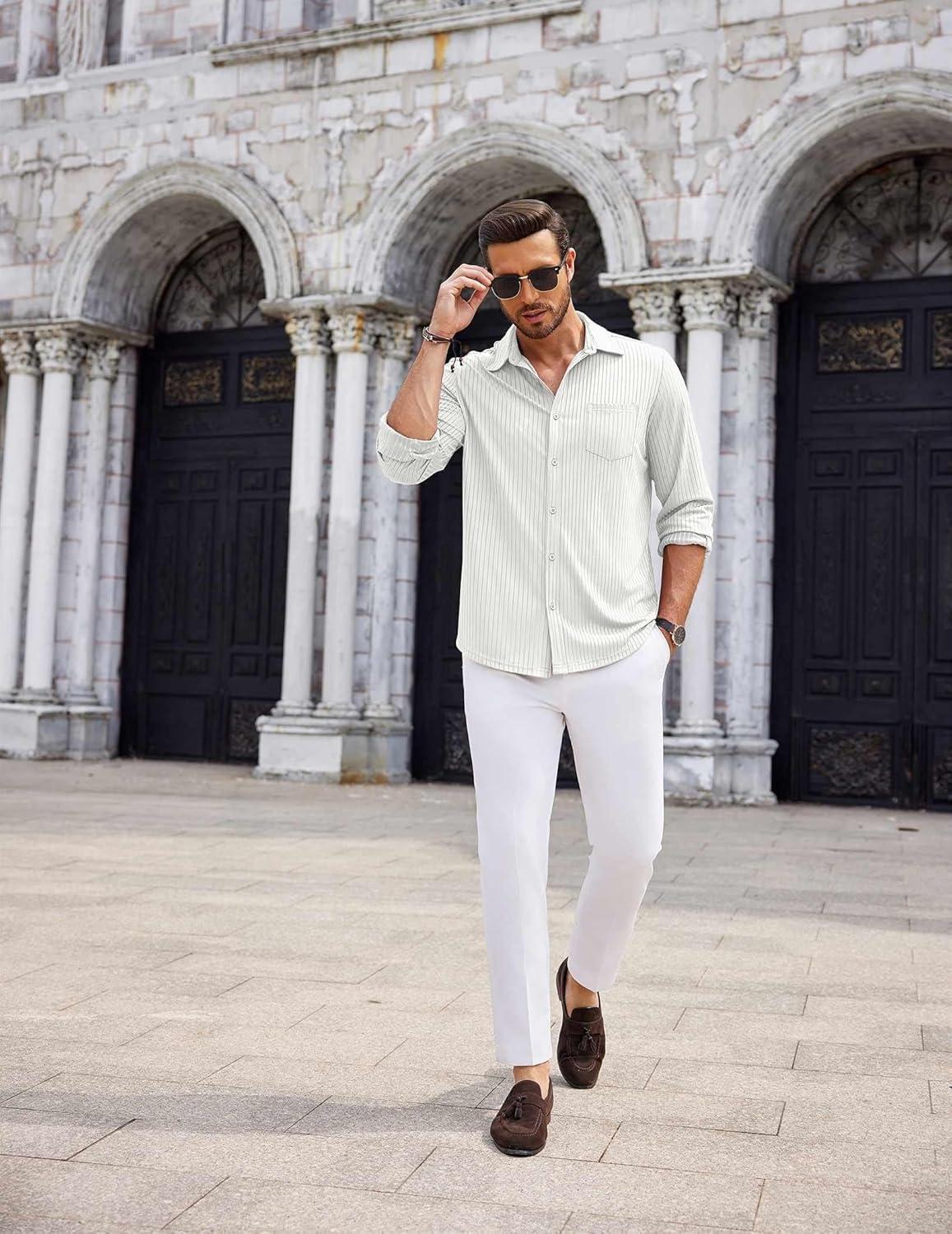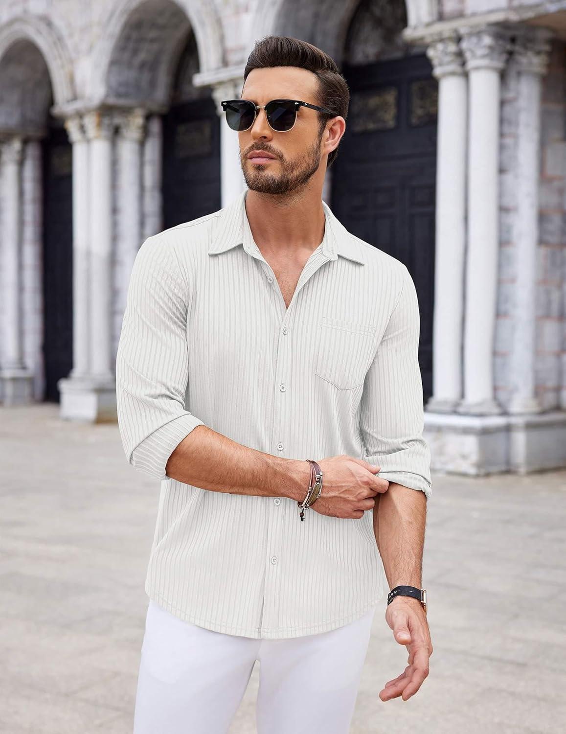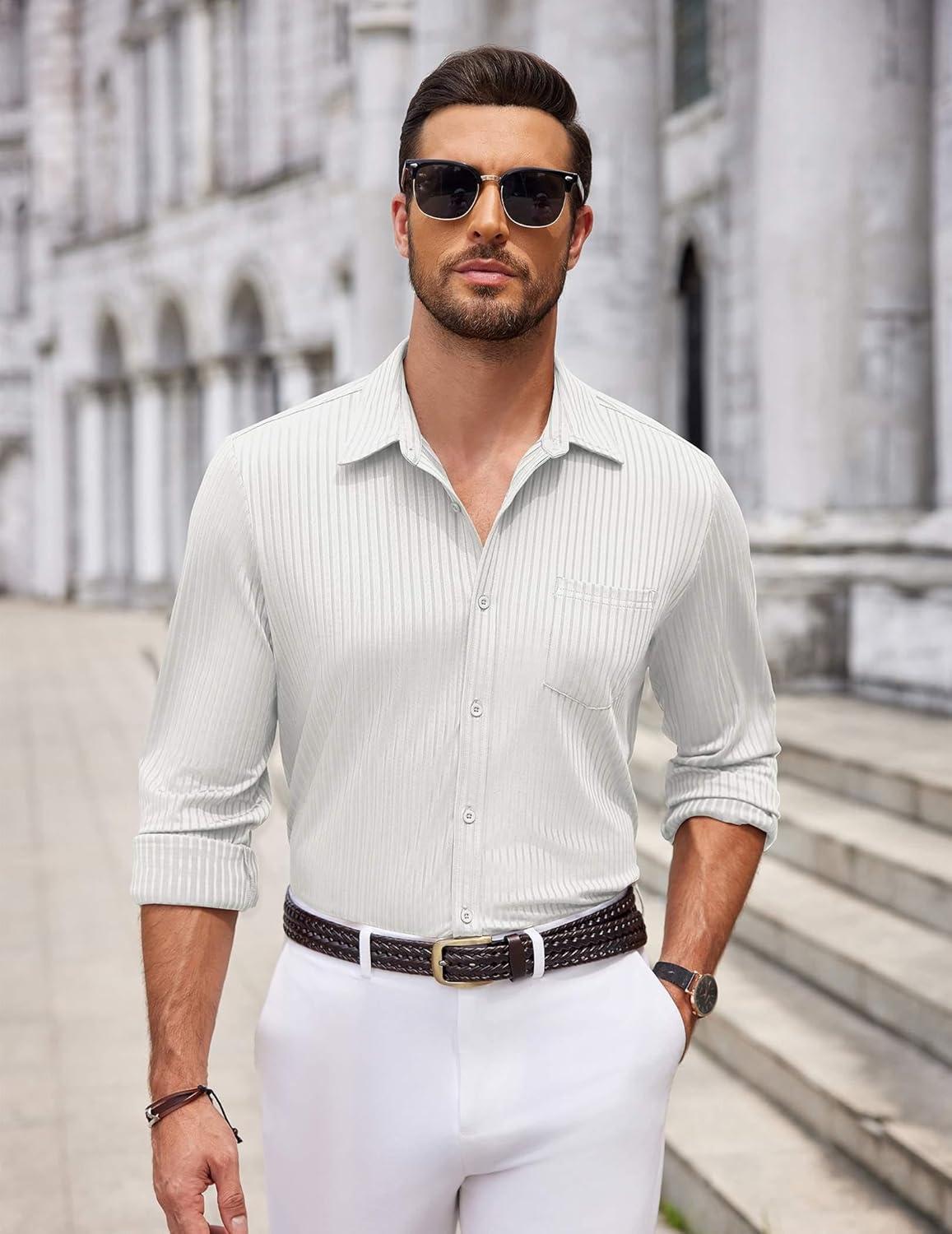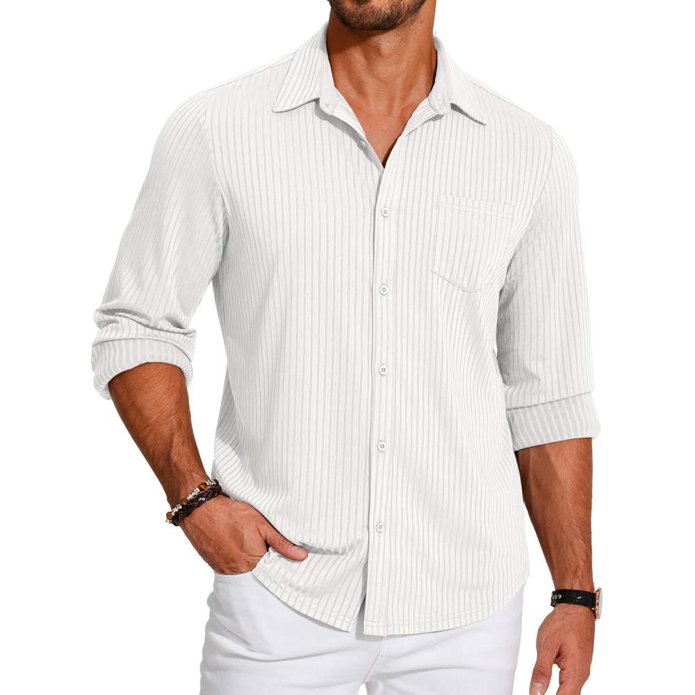 COOFANDY Men's Casual Button Down Shirt Long Sleeve Wrinkle Free Shirts Loose fit Shirt Textured Stretch Shirts with Pocket(White)