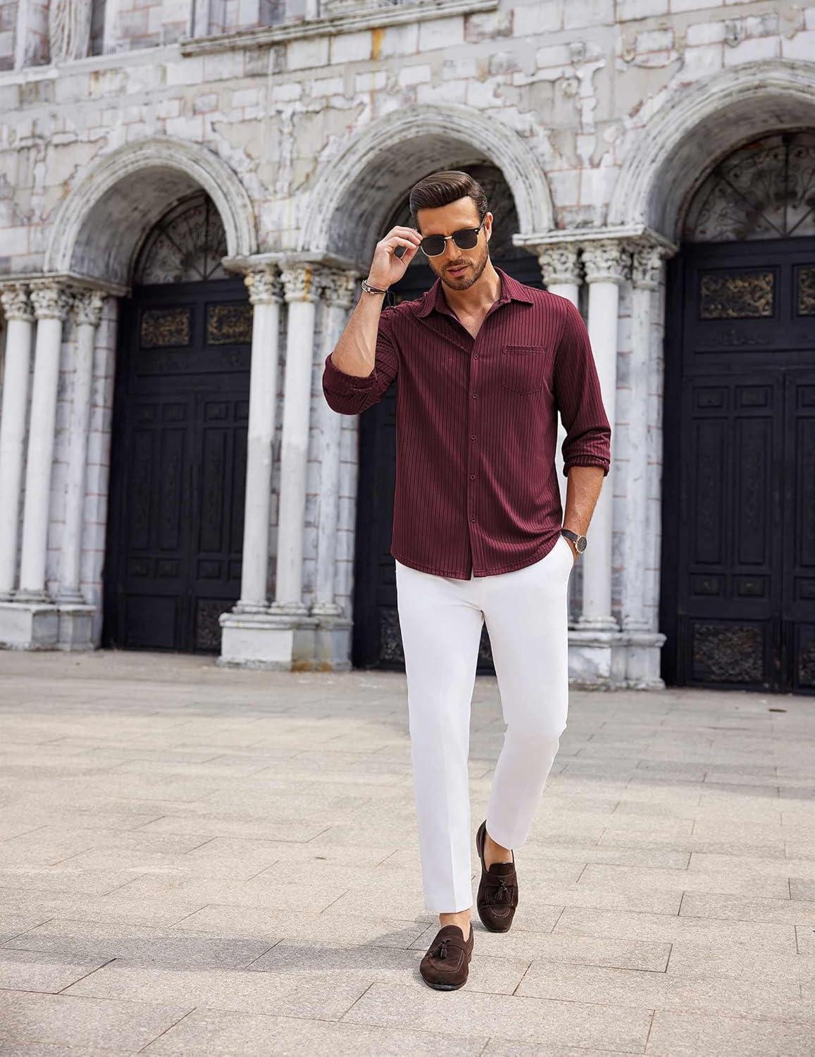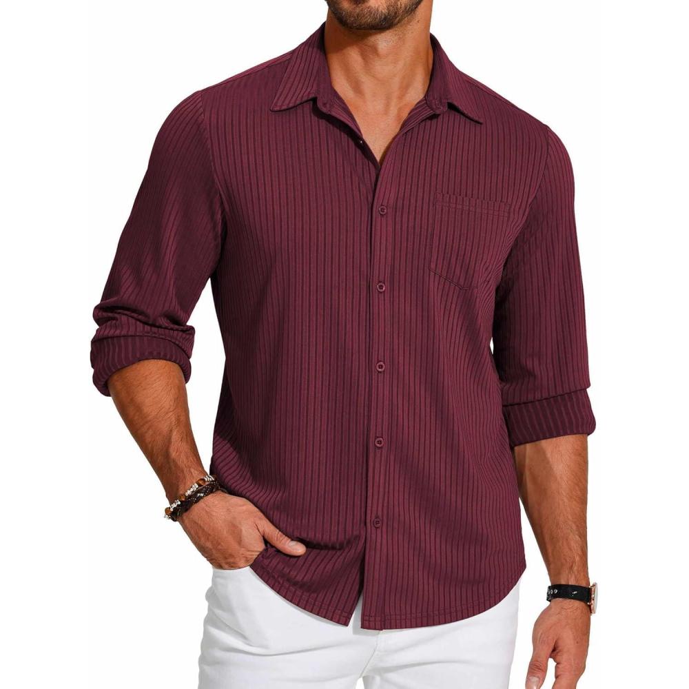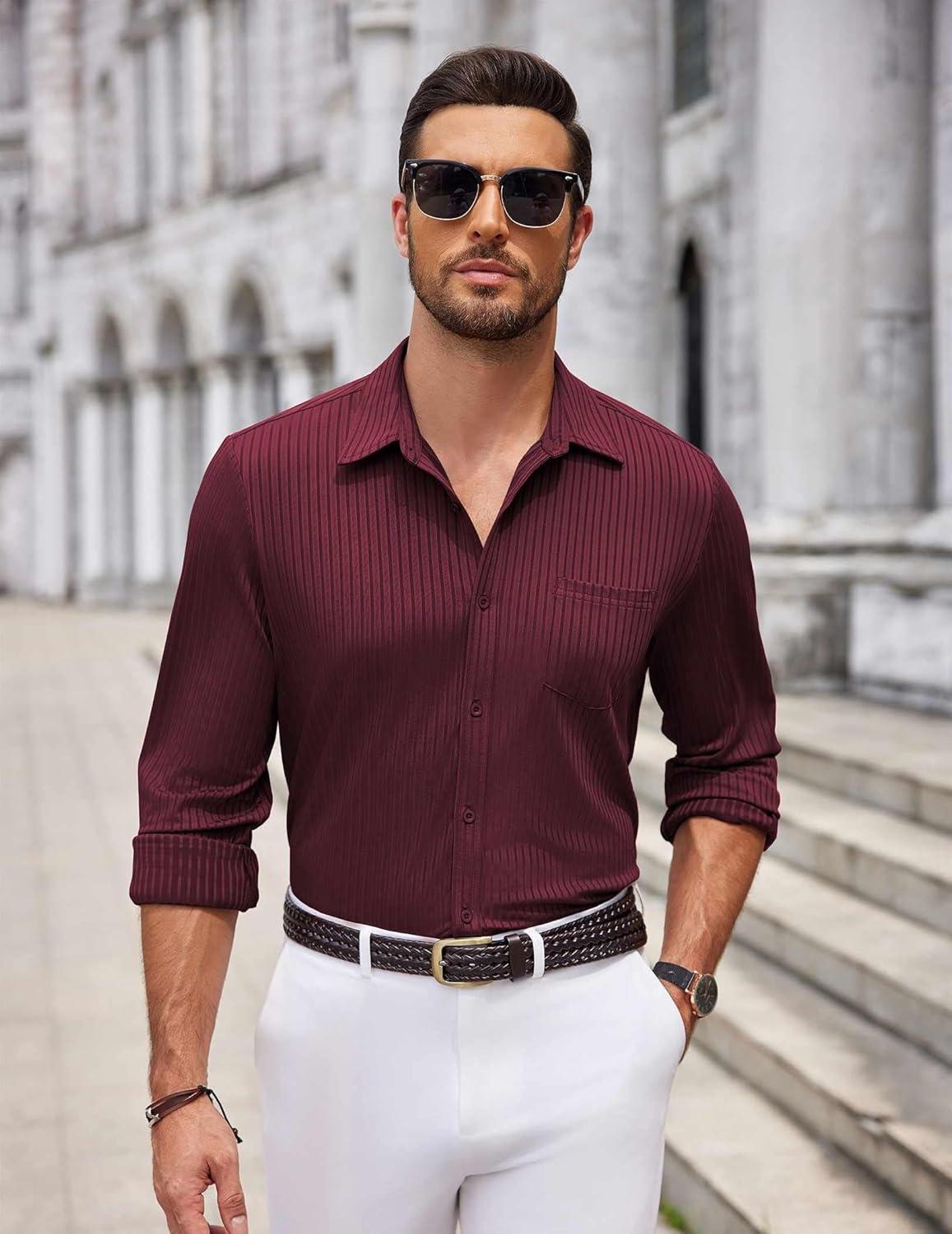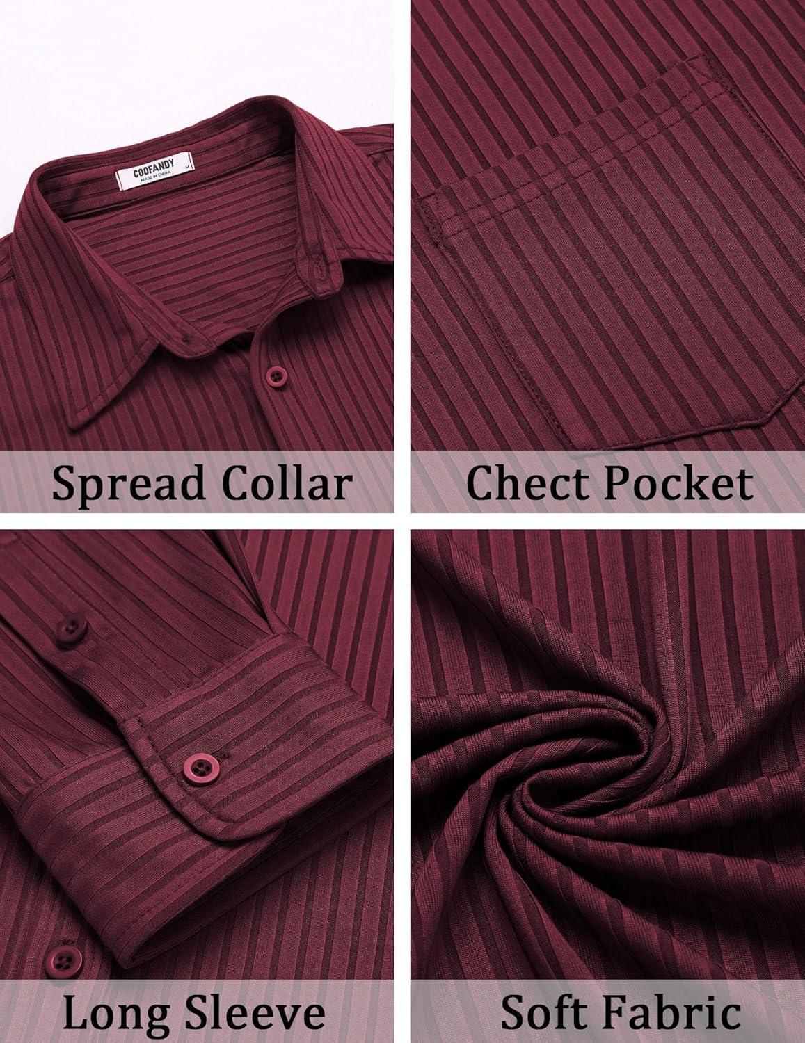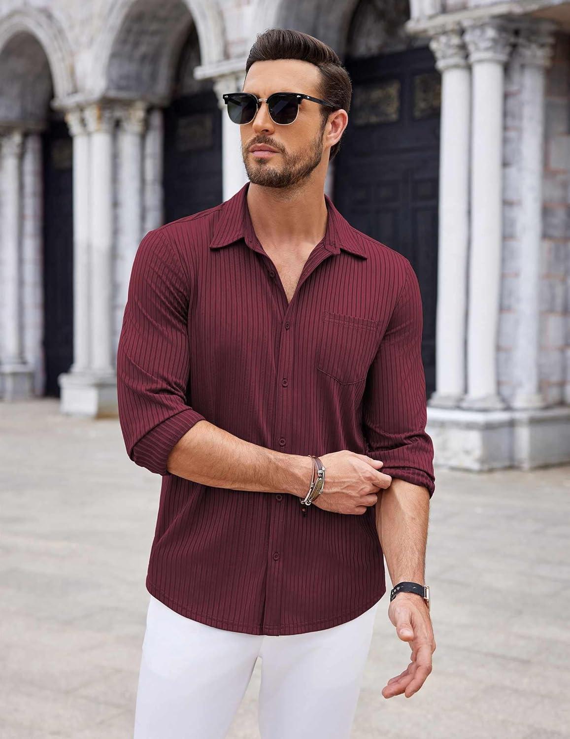 COOFANDY Men's Casual Button Down Shirt Long Sleeve Wrinkle Free Shirts Loose fit Shirt Textured Stretch Shirts with Pocket(Wine Red)