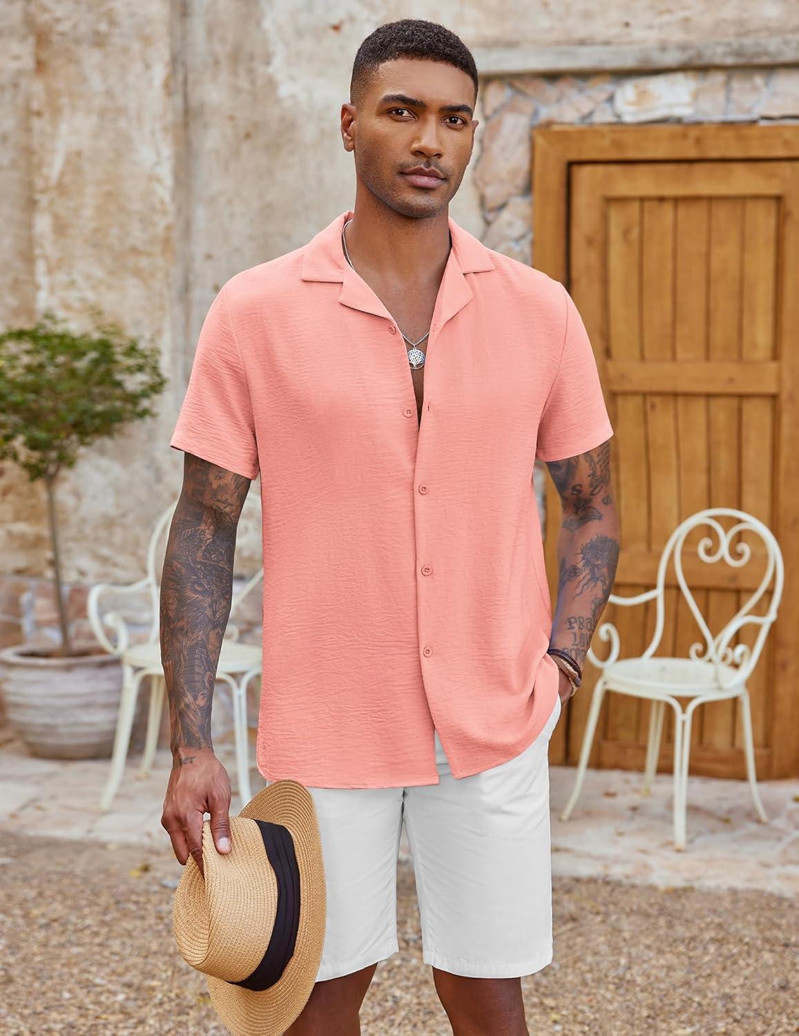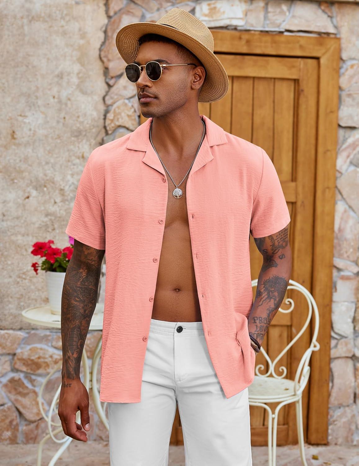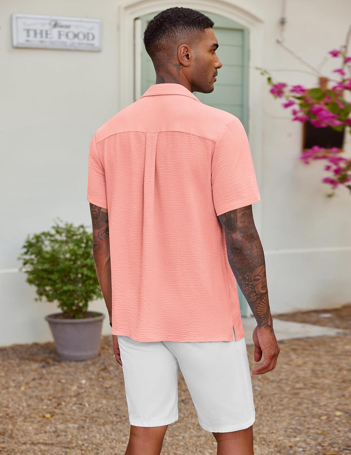 COOFANDY Men’s Casual Button Down Shirt Short Sleeve Textured Summer Cuban Beach Shirts(Pink)