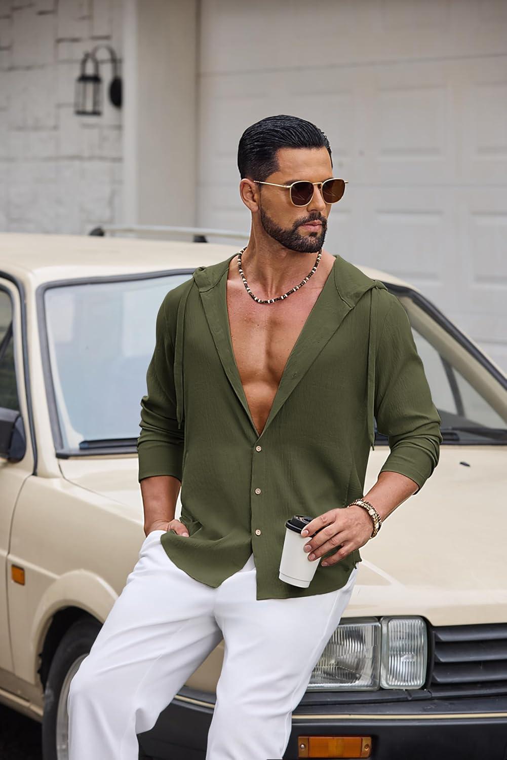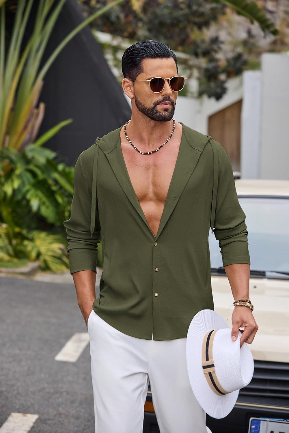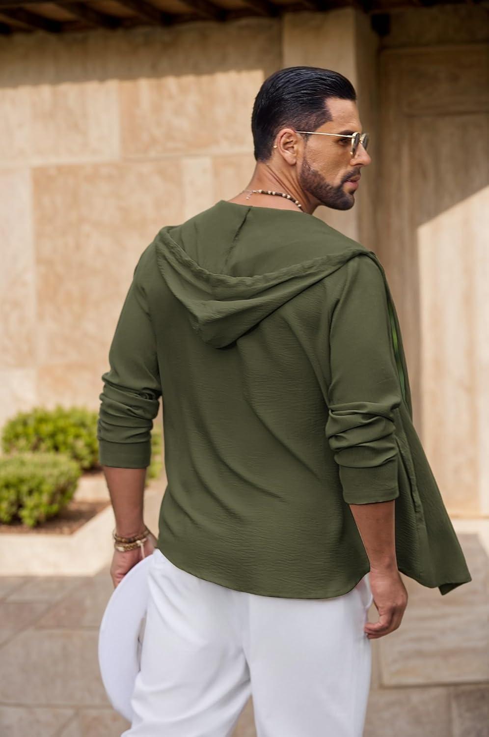 COOFANDY Mens Casual Button Down Shirt Summer Beach Shirts Lightweight Hoodie Sun Protection Coverup for Travel Vacation(Army Green)