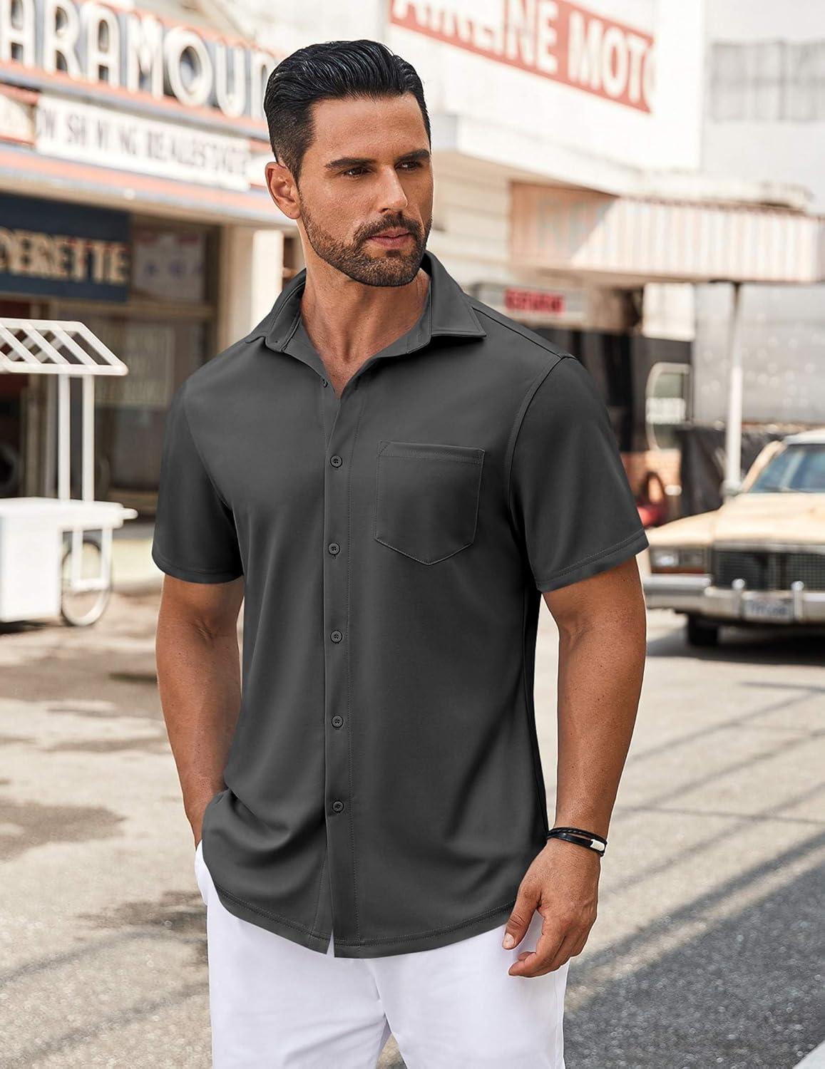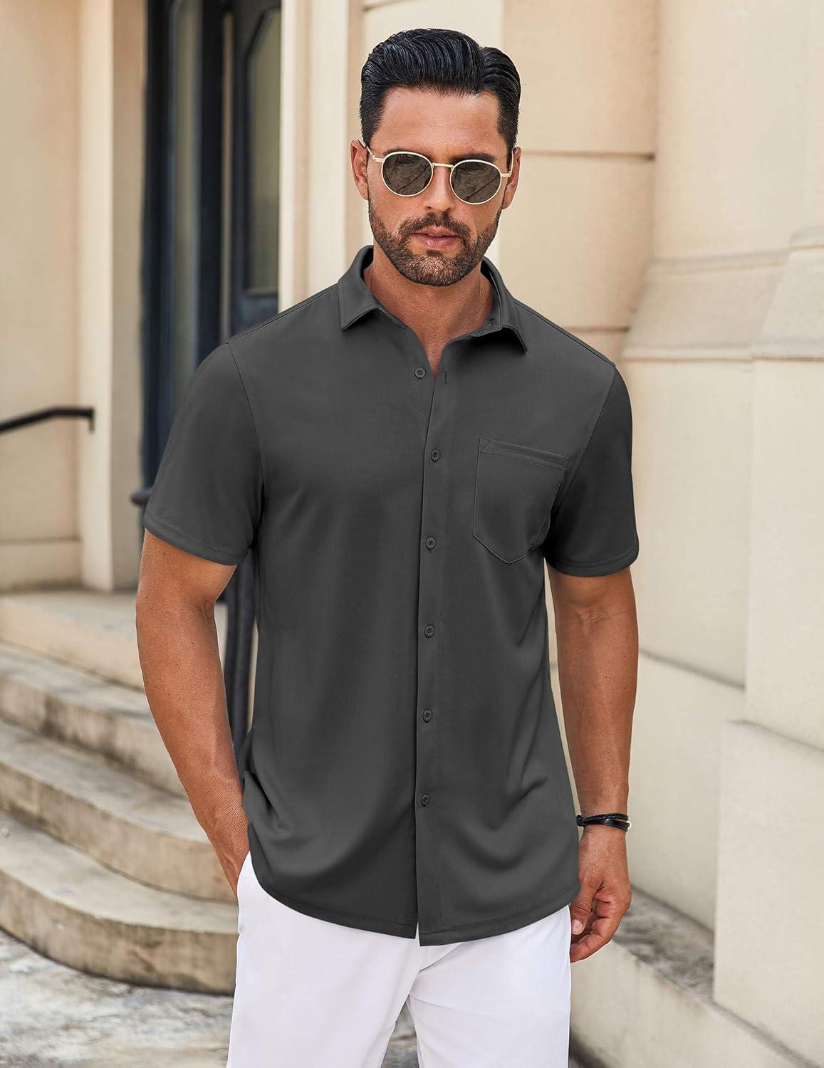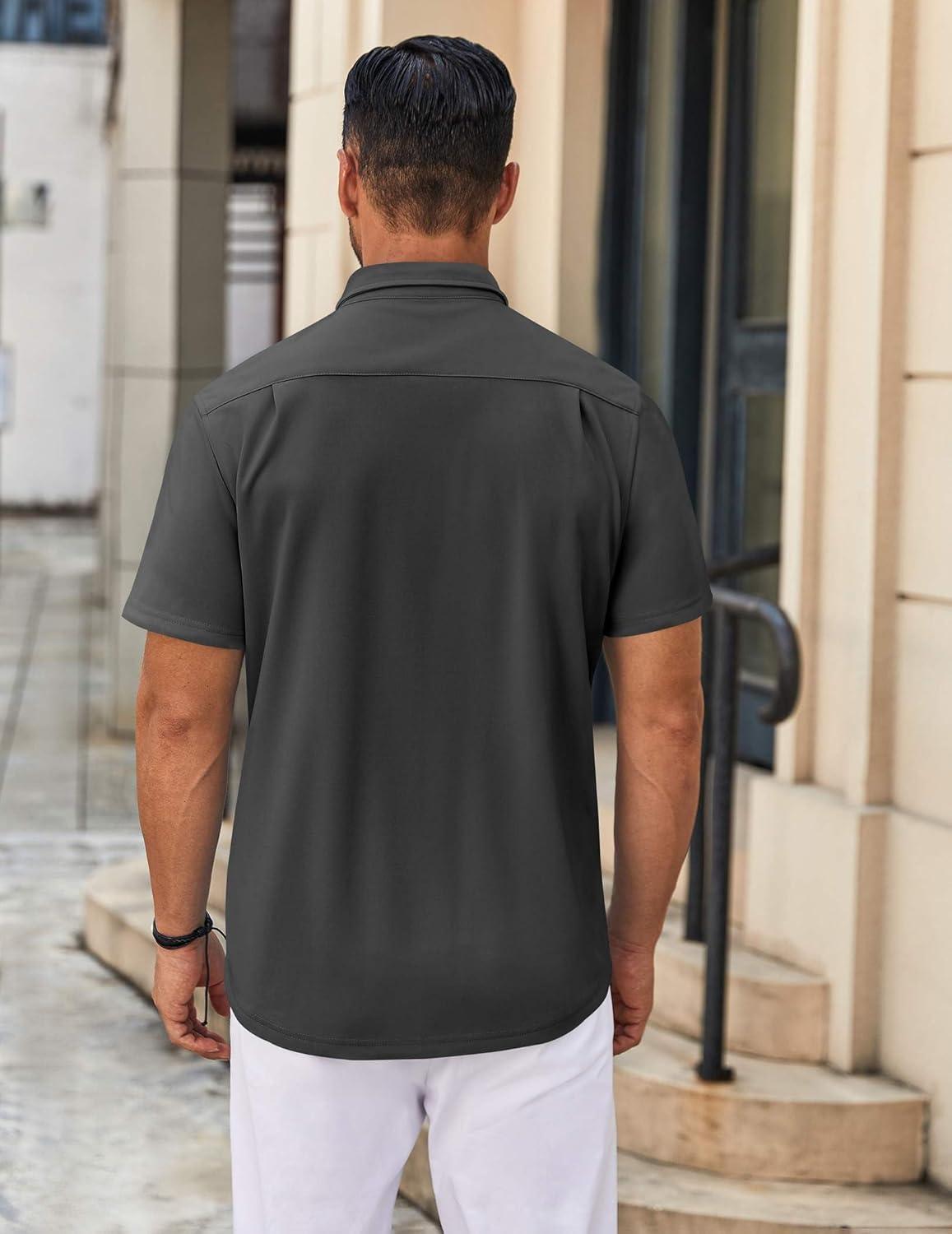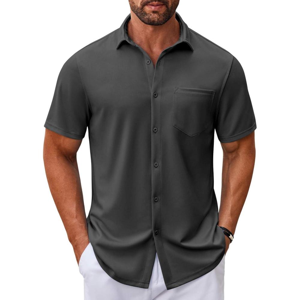 COOFANDY Mens Casual Button Down Shirt Untucked Short Sleeve Strech Wrinkle Free Dress Shirts(Deep Grey)