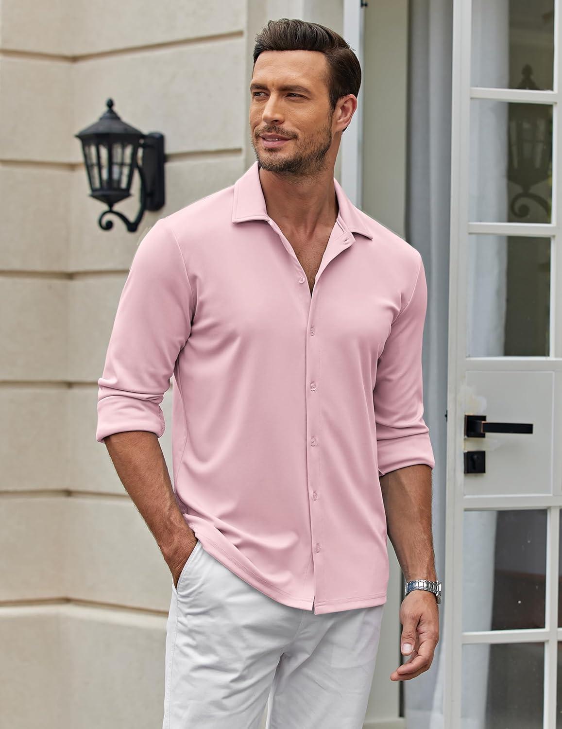 COOFANDY Men's Casual Button Down Shirt Wrinkle Free Shirts Long Sleeve Dress Shirt(Dark Pink)