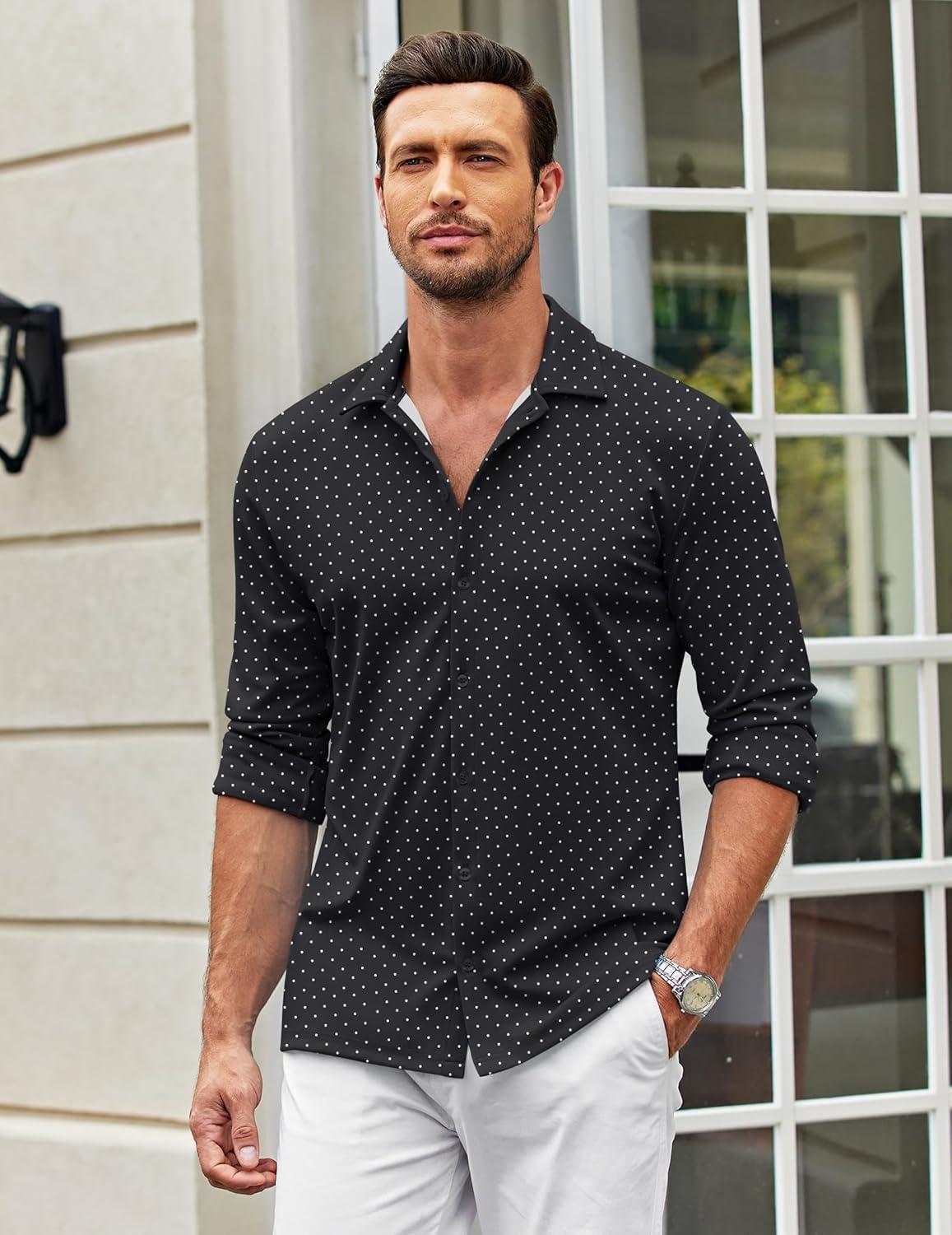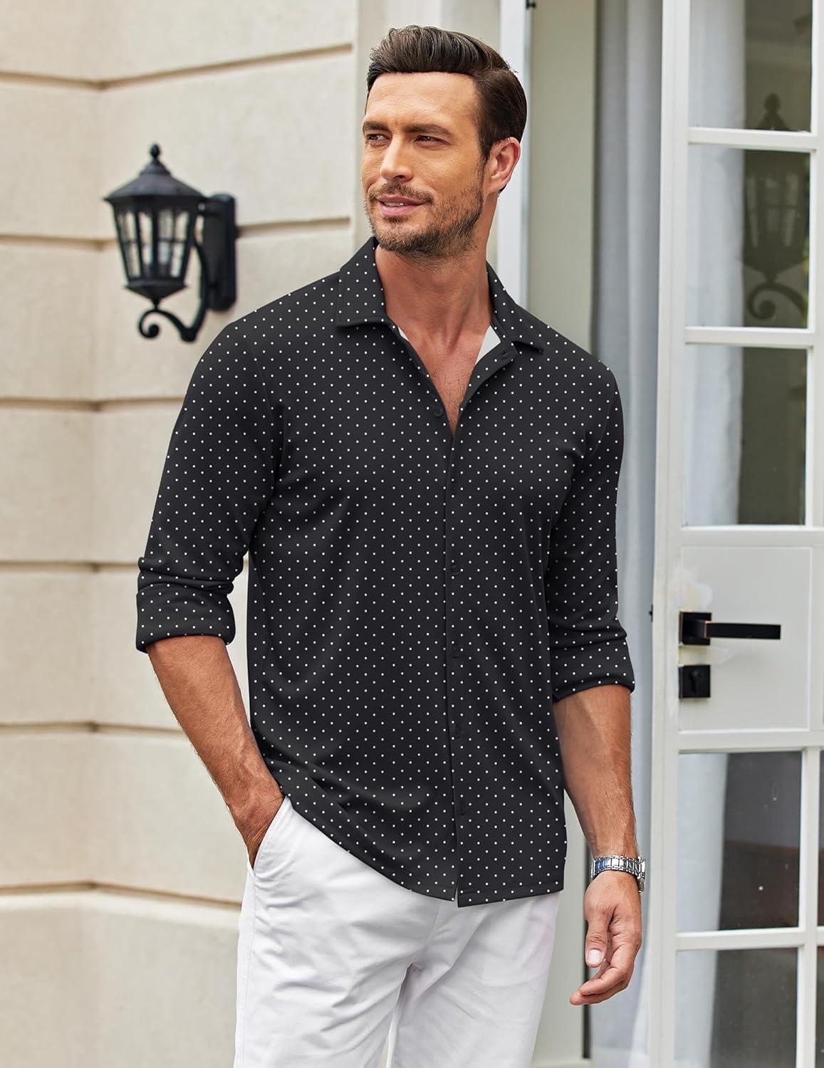 COOFANDY Men’s Casual Button Down Shirt Wrinkle Free Shirts Long Sleeve Dress Shirt(White Spots Black)