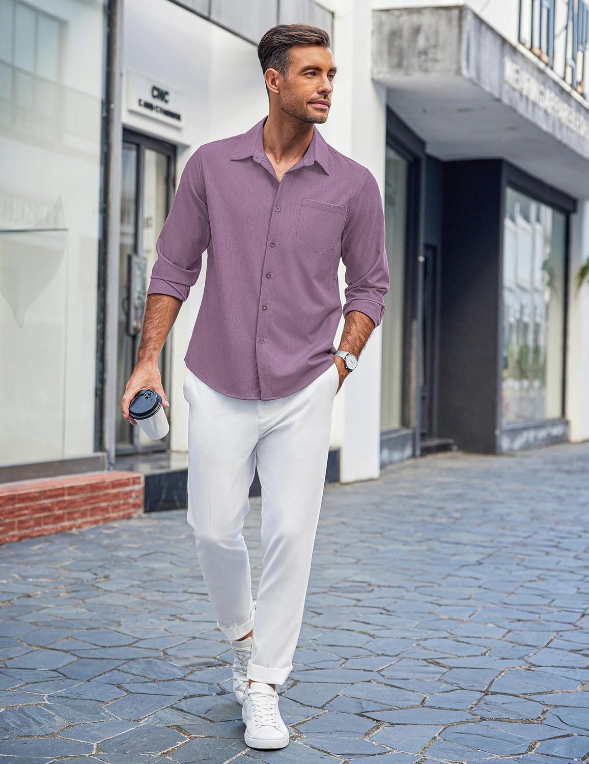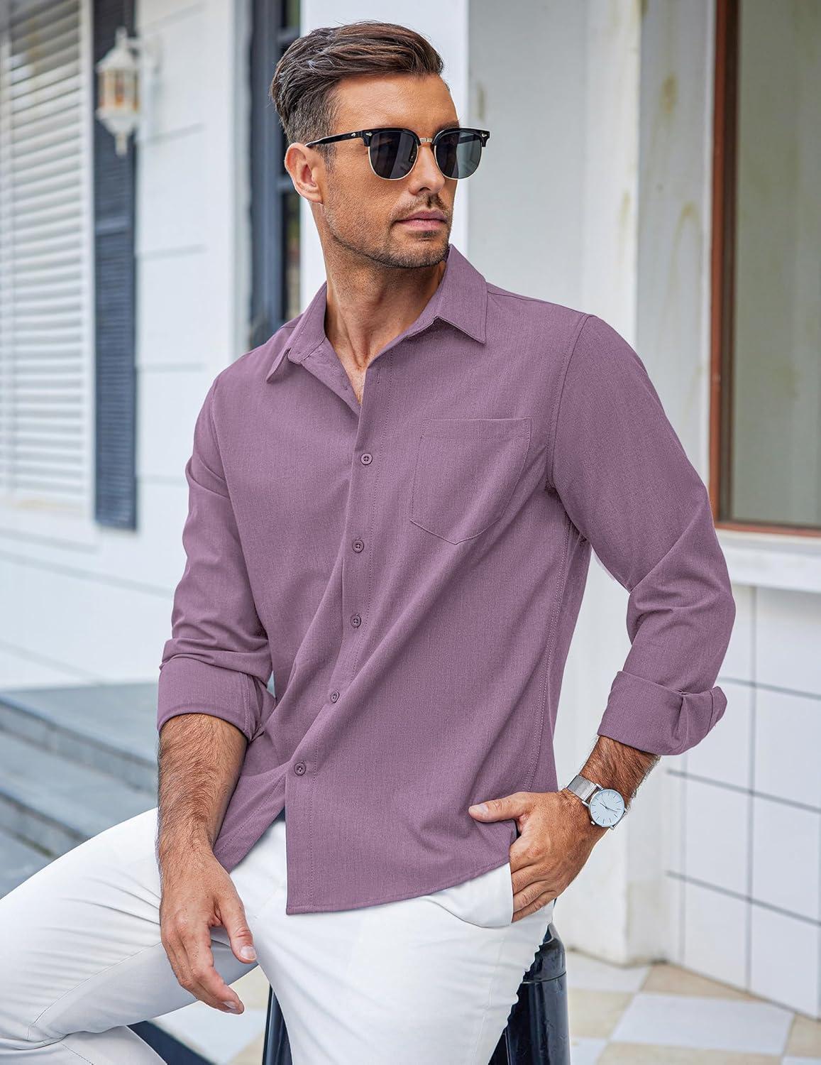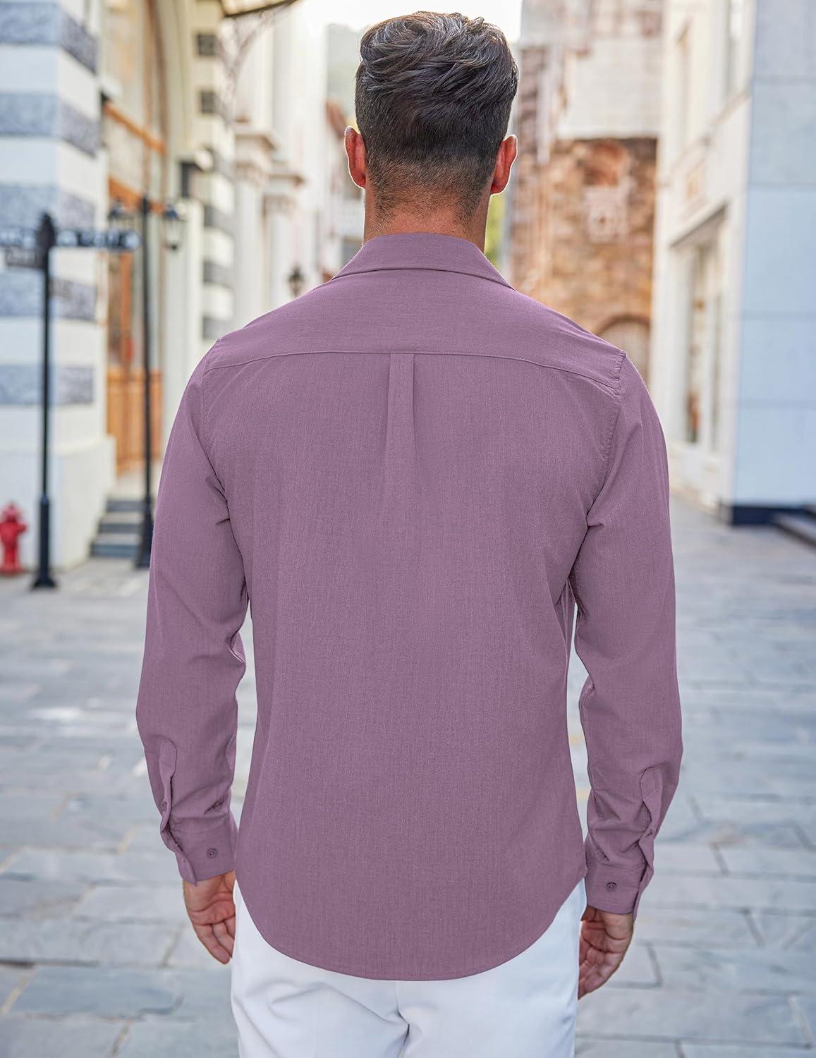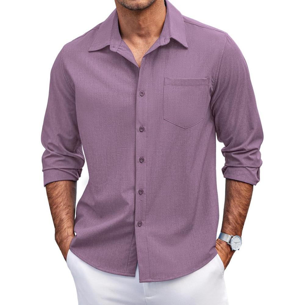 COOFANDY Men's Casual Button Down Shirts Long Sleeve Untucked Shirts Regular Fit Linen Shirt(Purple)