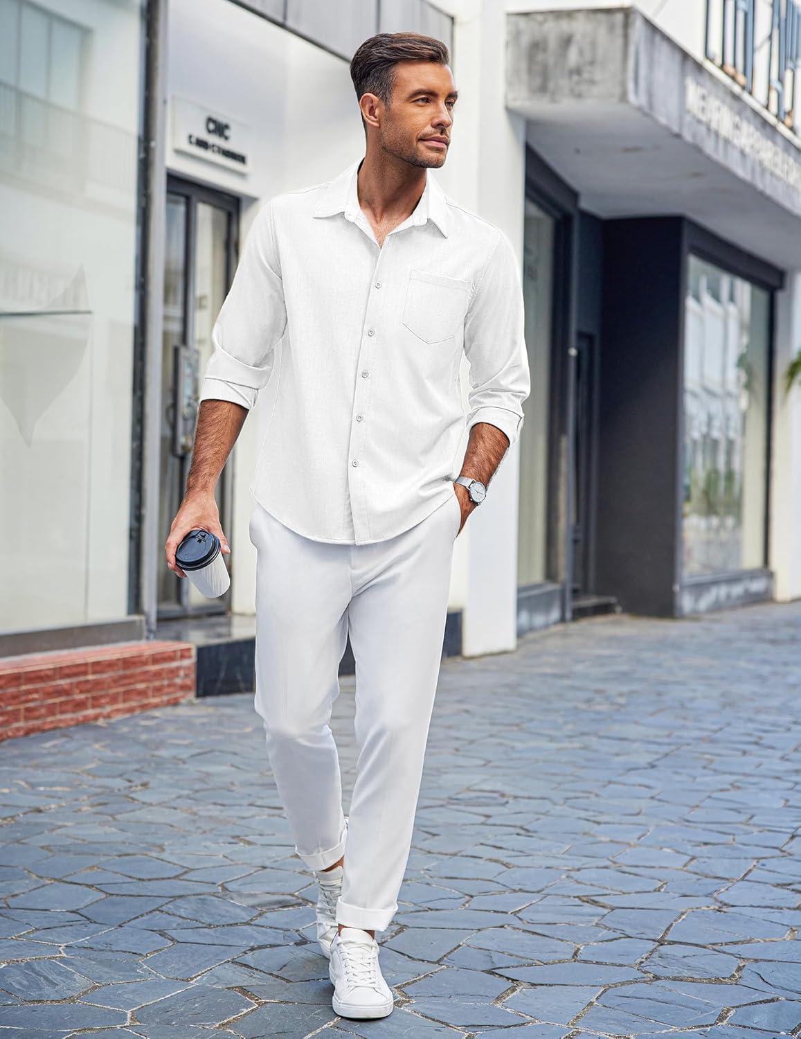 COOFANDY Men's Casual Button Down Shirts Long Sleeve Untucked Shirts Regular Fit Linen Shirt(White)