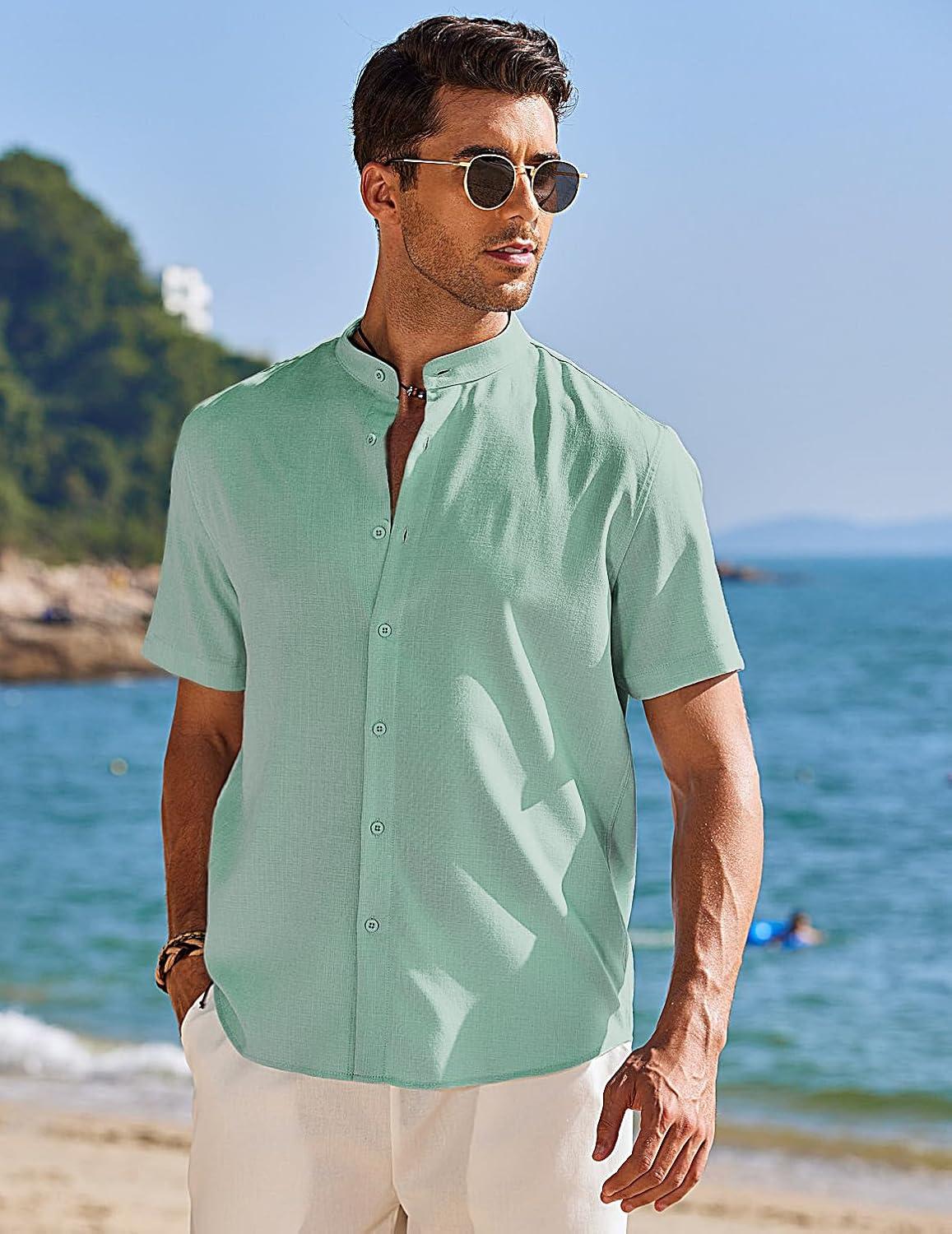 COOFANDY Men's Casual Button Down Shirts Short Sleeve Banded Collar Dress Shirts Solid Summer Beach Tops(Light Green)