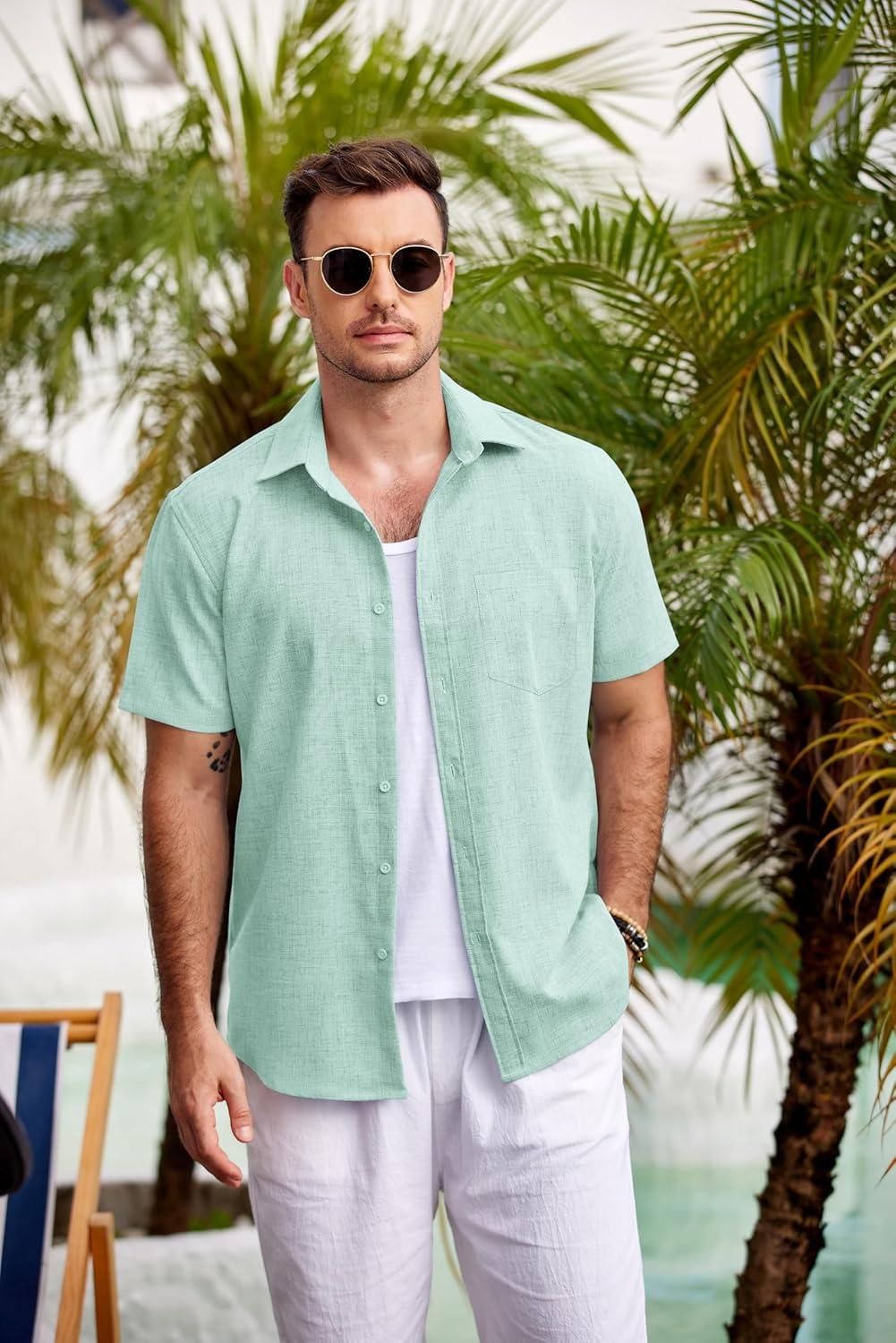 COOFANDY Men's Casual Button Down Shirts Short Sleeve Linen Shirts Summer Beach Dress Shirt(Light Green)