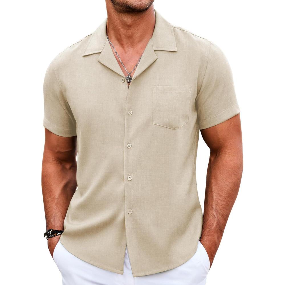 COOFANDY Men's Casual Button Down Shirts Short Sleeve Summer Beach Shirt Cuban Vacation Textured Shirts with Pocket(Beige)