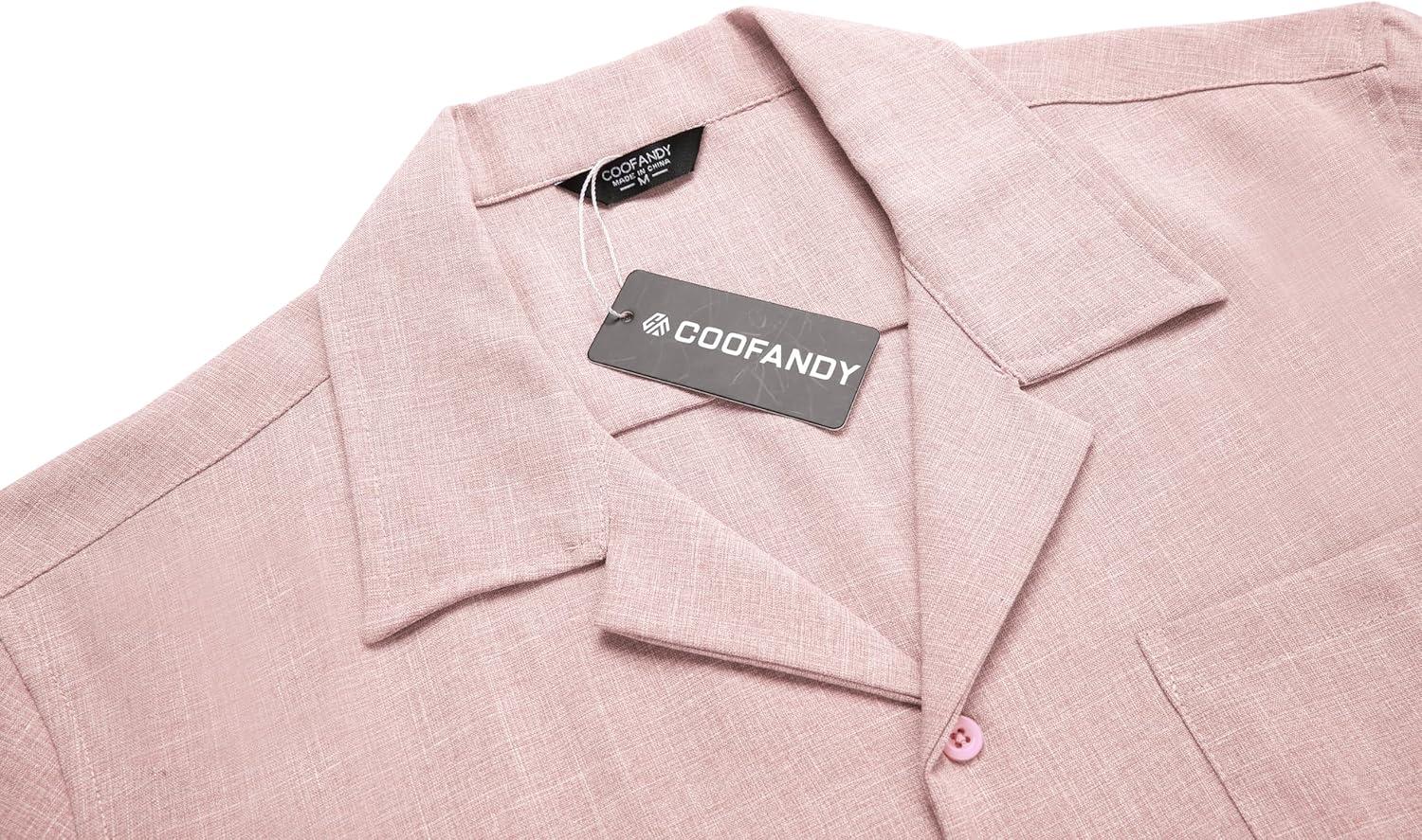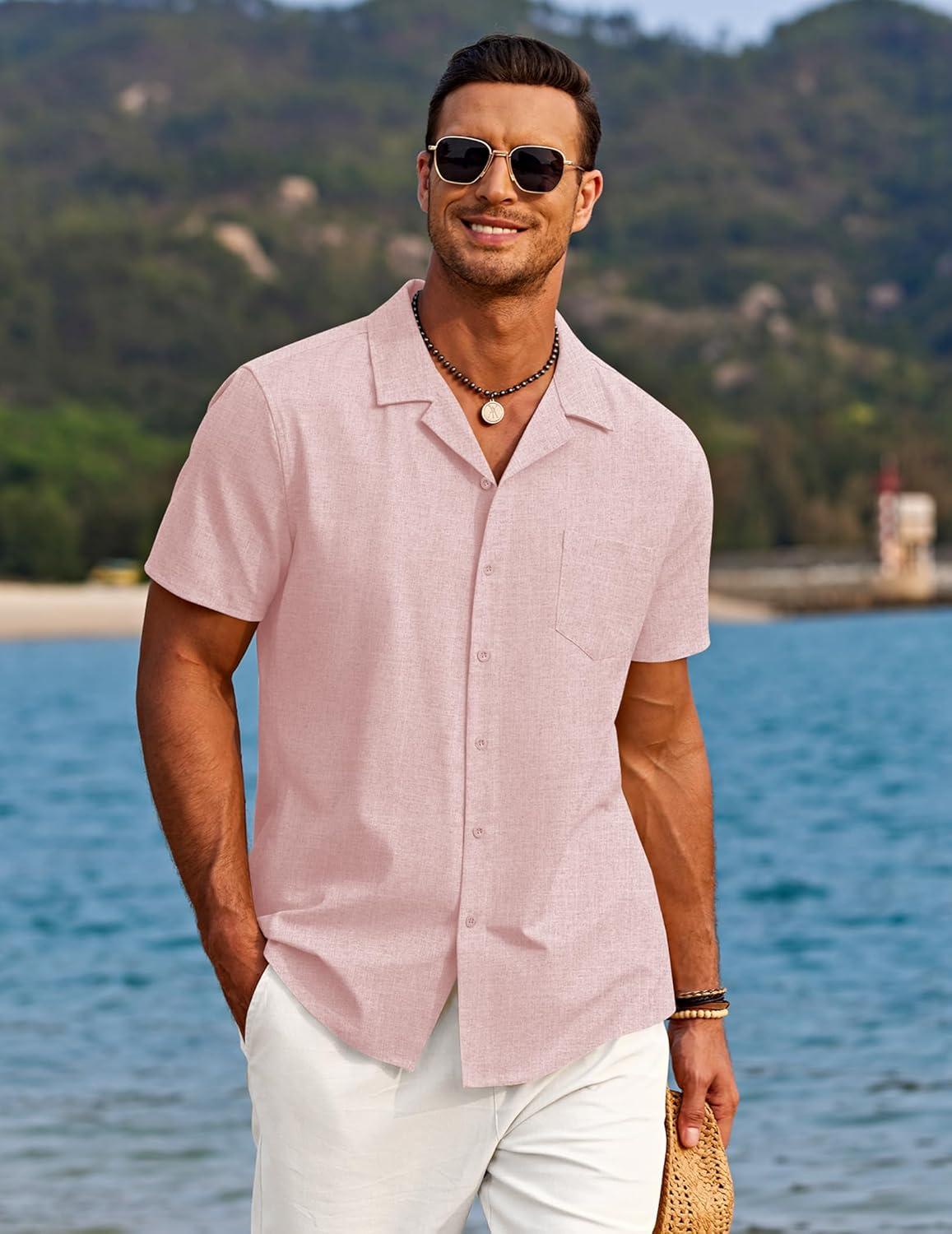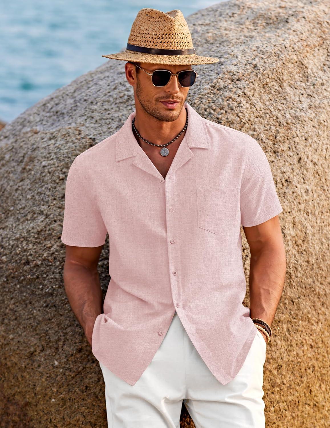 COOFANDY Men’s Casual Button Down Shirts Short Sleeve Summer Beach Shirt Cuban Vacation Textured Shirts with Pocket(Light Pink)