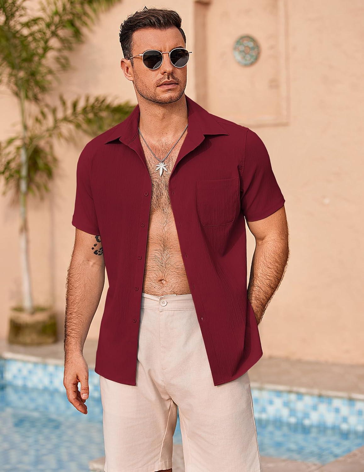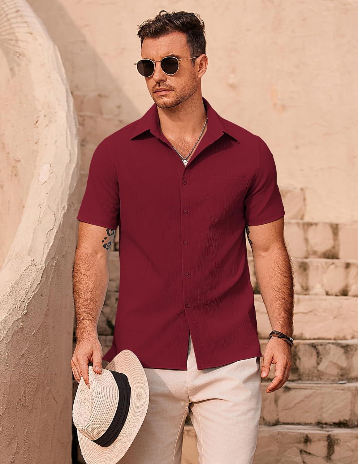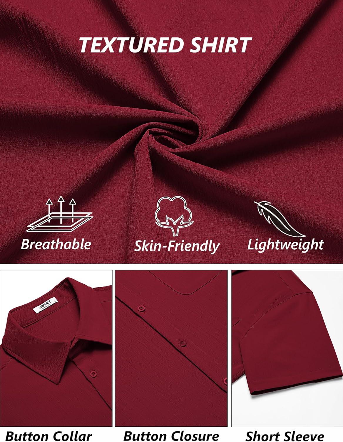 COOFANDY Mens Casual Button Down Shirts Short Sleeve Summer Beach Vacation Shirts(Dark Red)