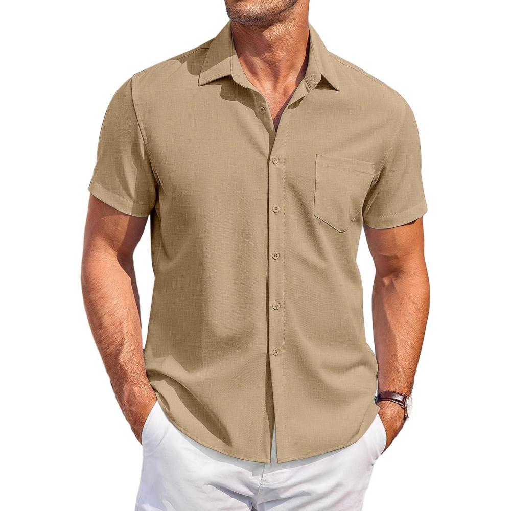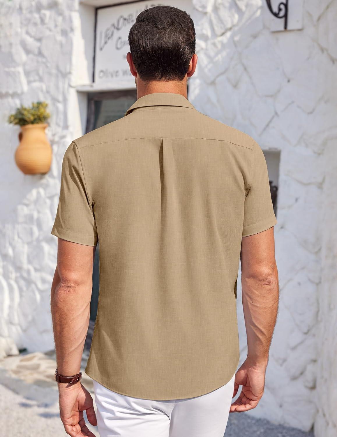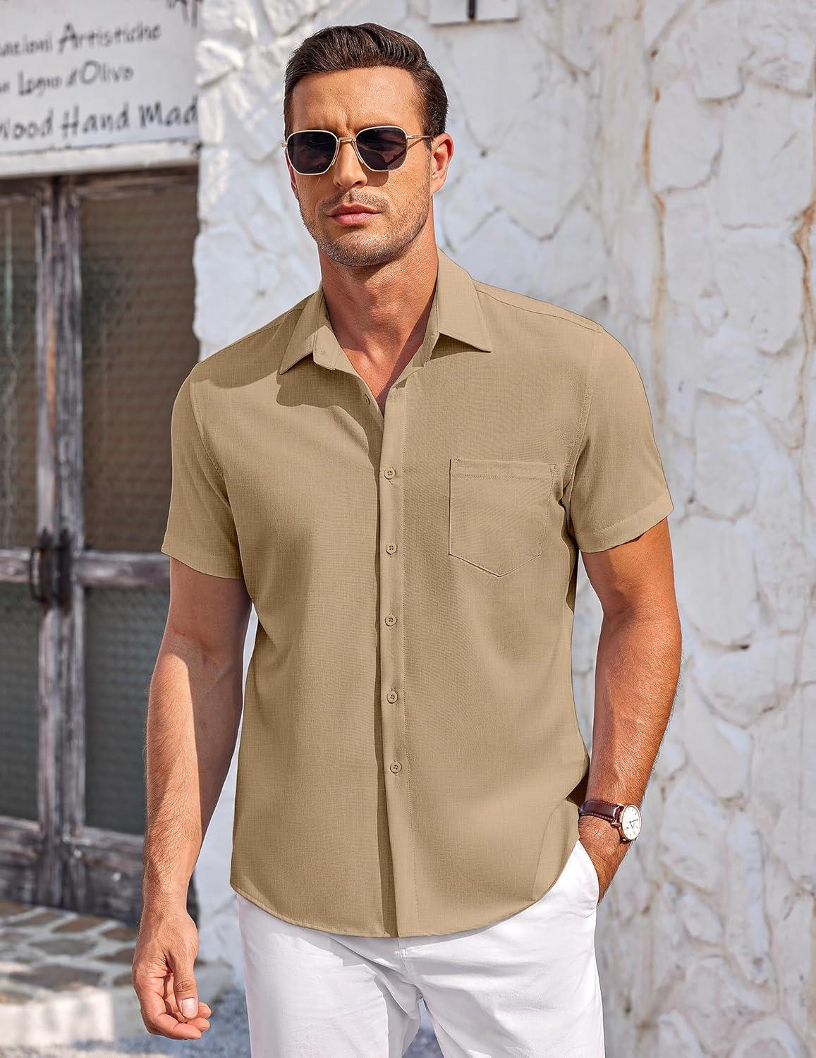 COOFANDY Men’s Casual Button Down Shirts Short Sleeve Summer Beach Vacation Untucked Dress Shirts with Pocket(Light Tan)