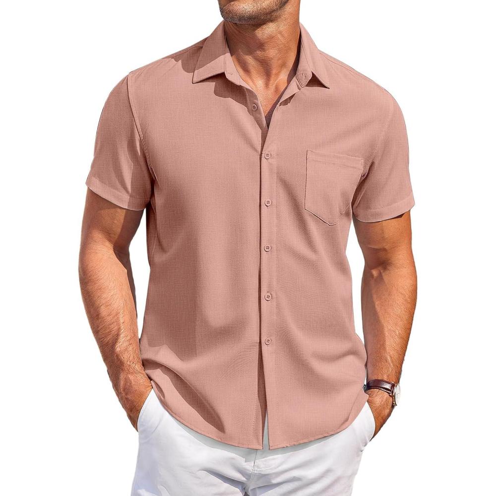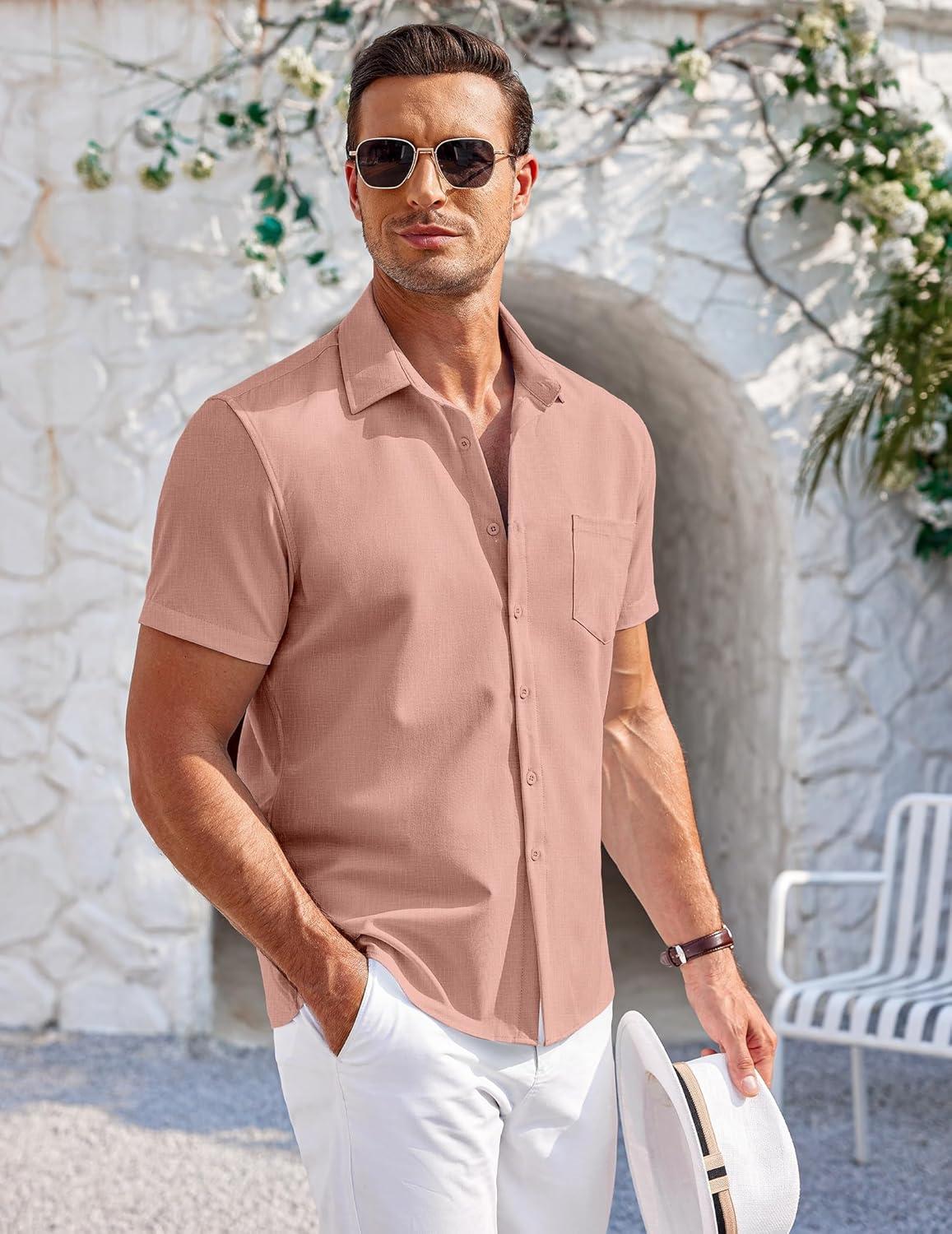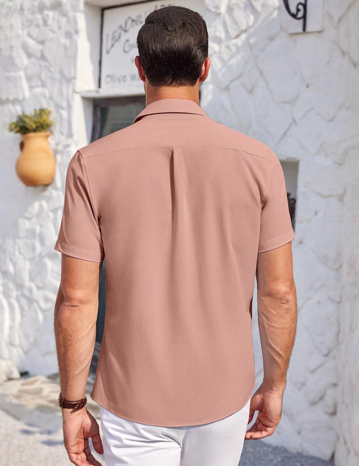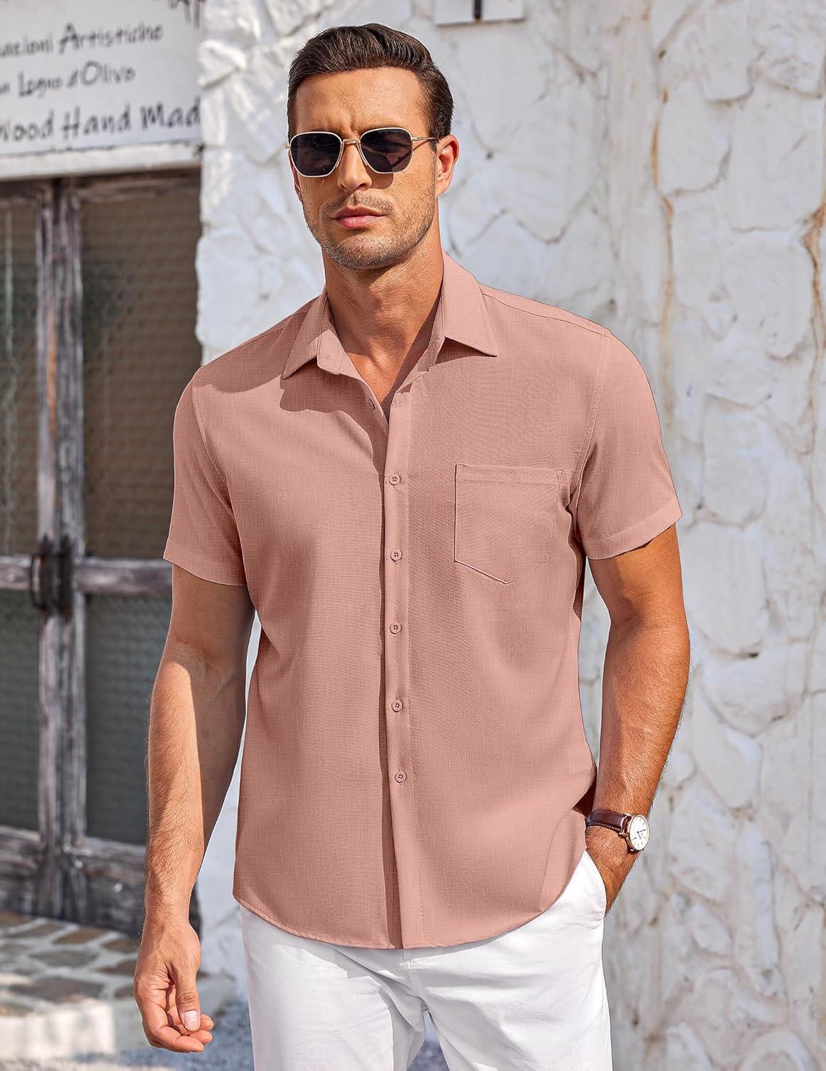 COOFANDY Men's Casual Button Down Shirts Short Sleeve Summer Beach Vacation Untucked Dress Shirts with Pocket(Pink)