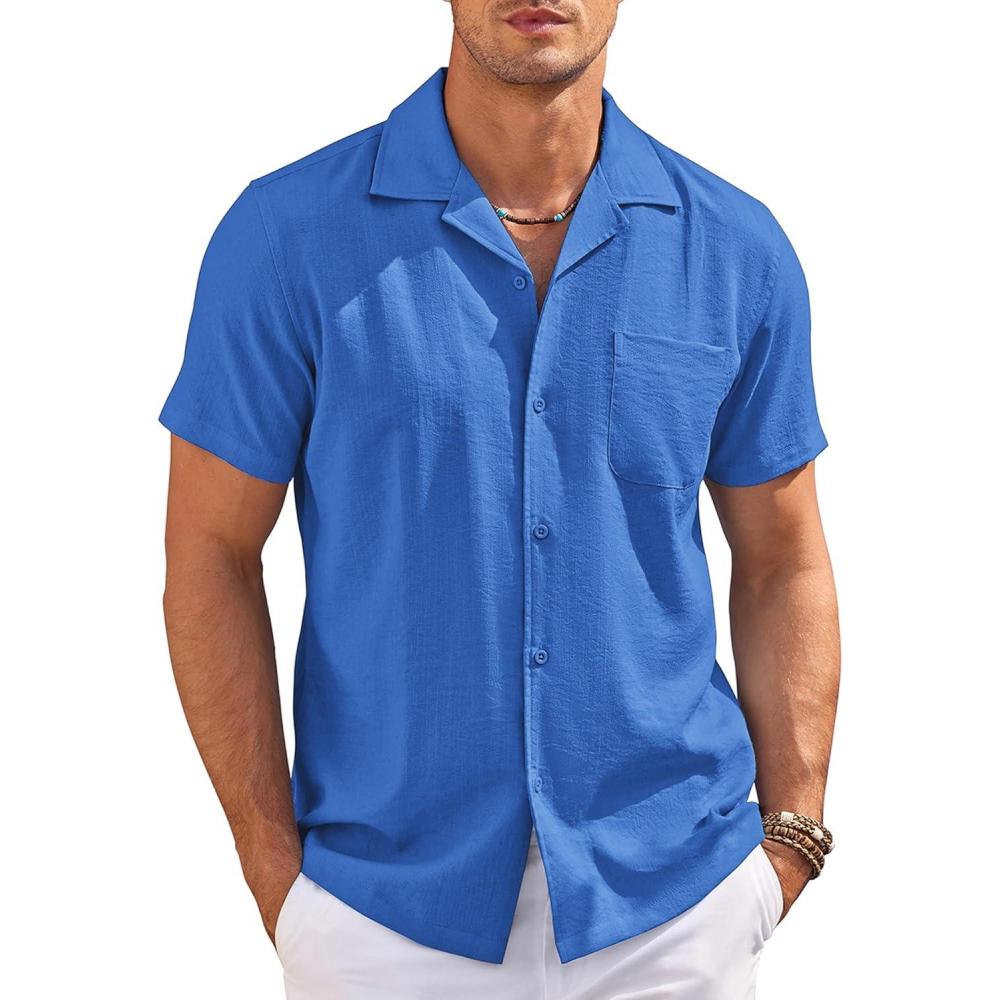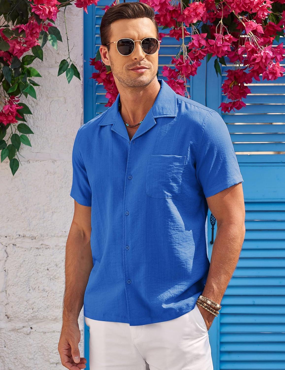 COOFANDY Men's Casual Button Down Shirts Short Sleeve Summer Cuban Vacation Beach Shirts(Classic Blue)