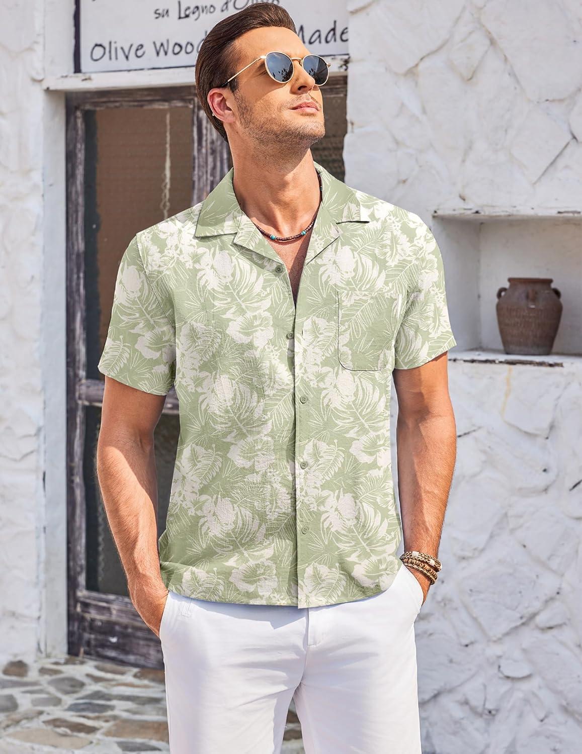 COOFANDY Men's Casual Button Down Shirts Short Sleeve Summer Cuban Vacation Beach Shirts(Light Green White Leaf)