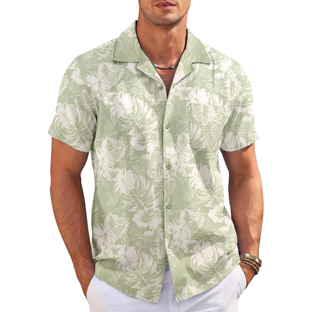 COOFANDY Men’s Casual Button Down Shirts Short Sleeve Summer Cuban Vacation Beach Shirts(Light Green White Leaf)