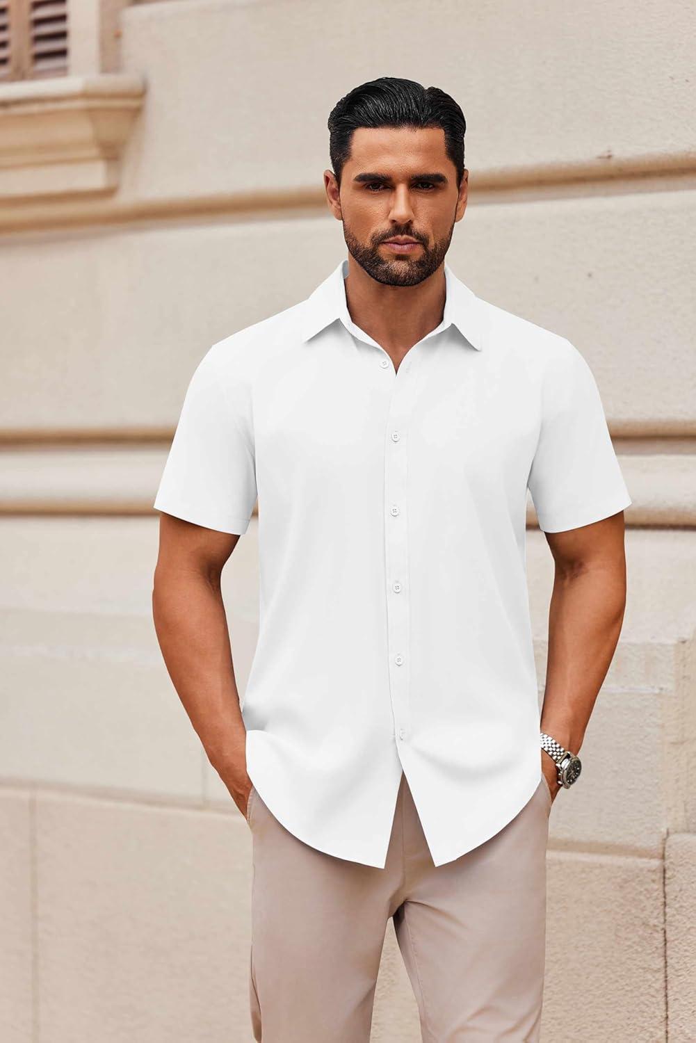 COOFANDY Men’s Casual Button Down Shirts Short Sleeve Summer Untucked Dress Shirts(White)