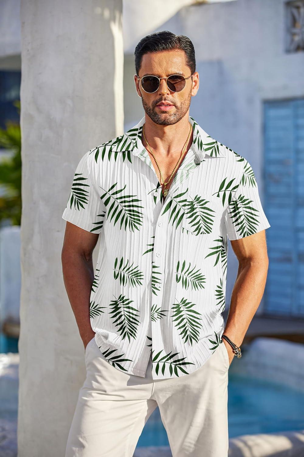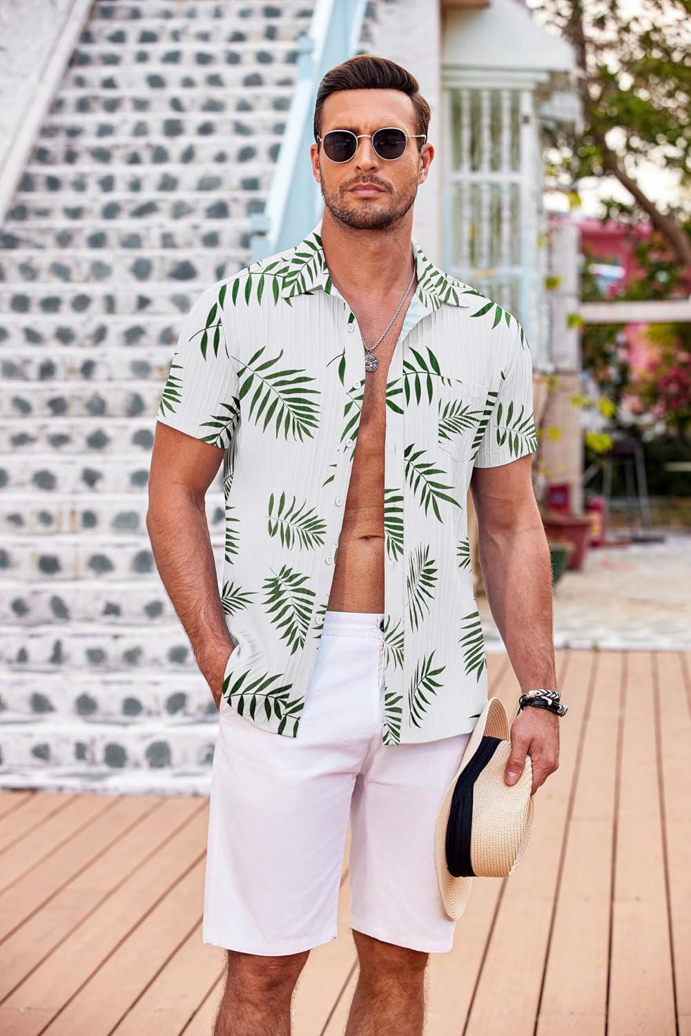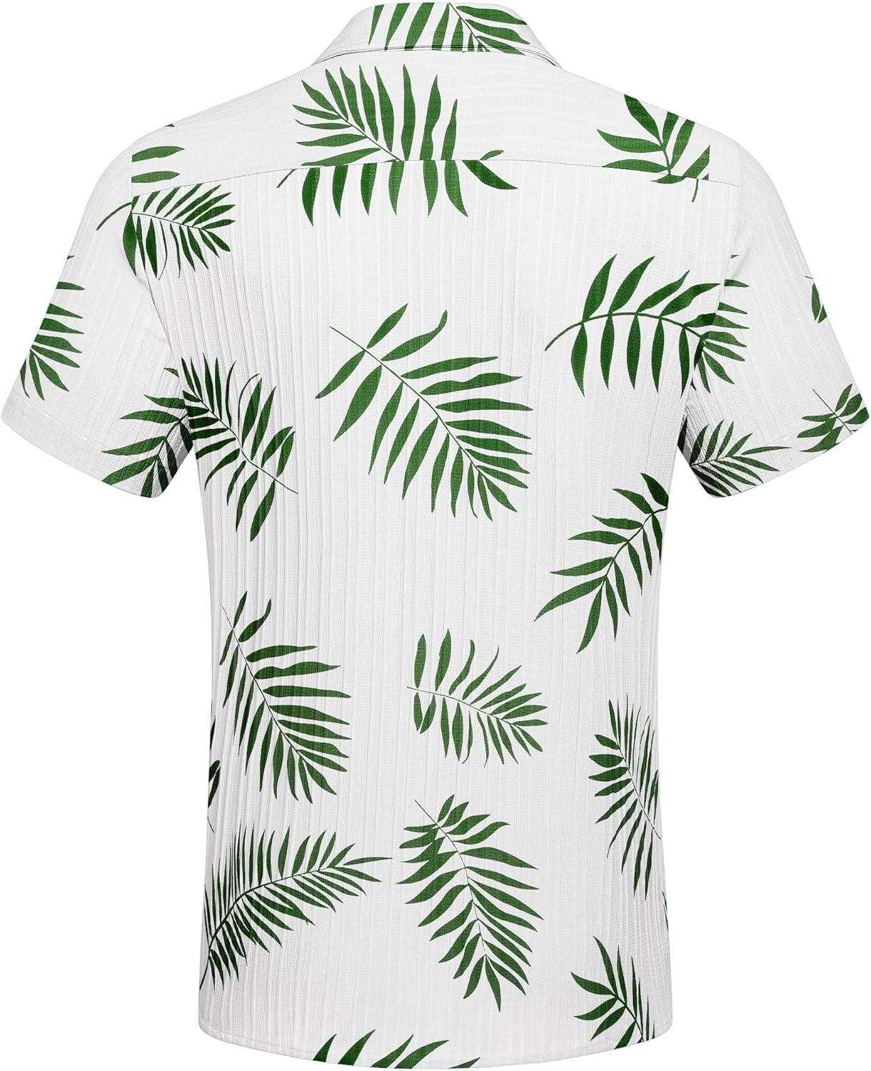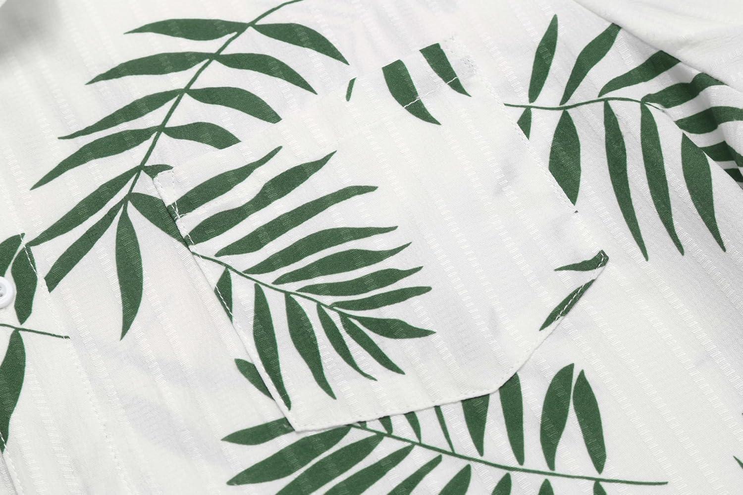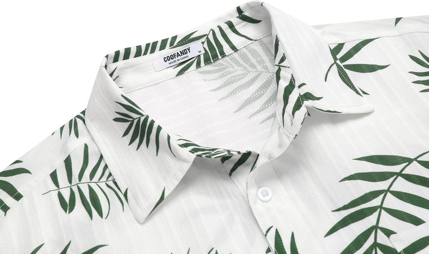 COOFANDY Men’s Casual Button Down Shirts Short Sleeve Textured Summer Beach Shirt with Pocket(White-green Leaves)