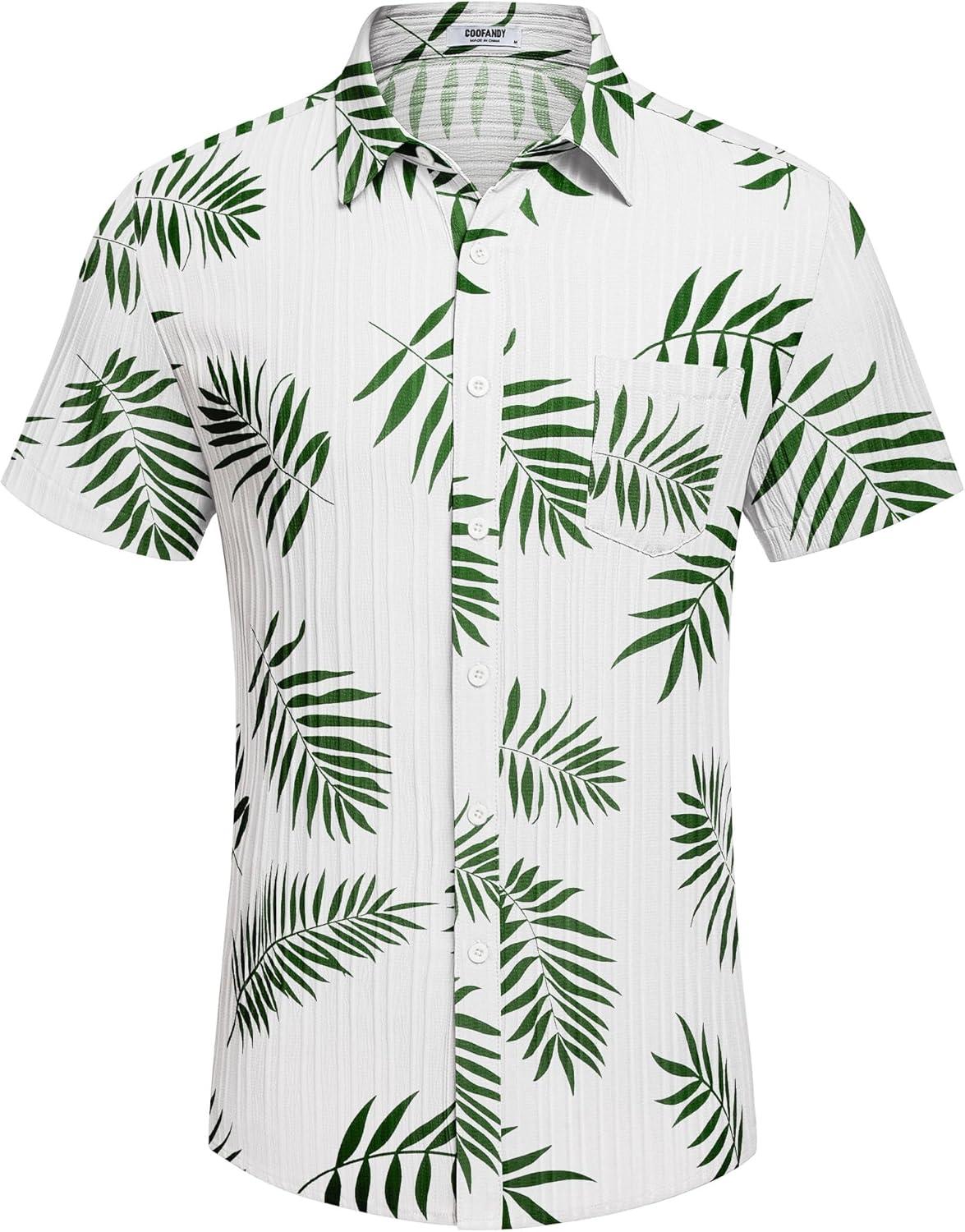 COOFANDY Men's Casual Button Down Shirts Short Sleeve Textured Summer Beach Shirt with Pocket(White-green Leaves)