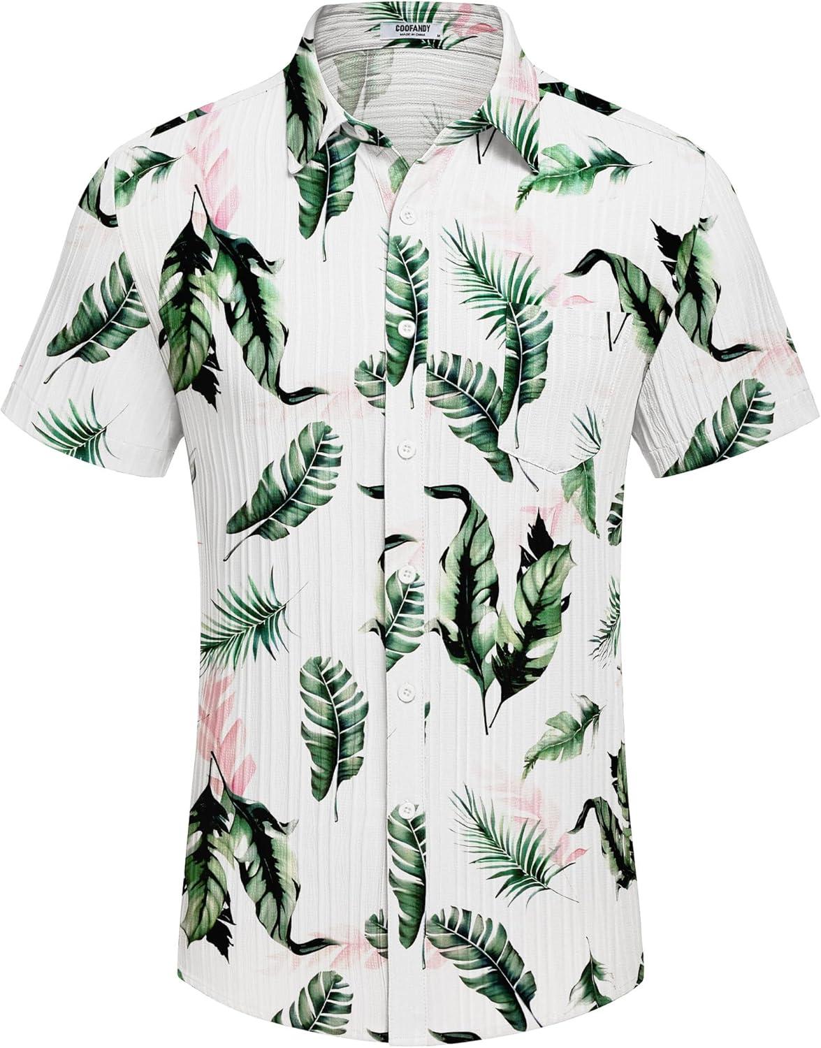 COOFANDY Men's Casual Button Down Shirts Short Sleeve Textured Summer Beach Shirt with Pocket(White-green Pink Leaves)