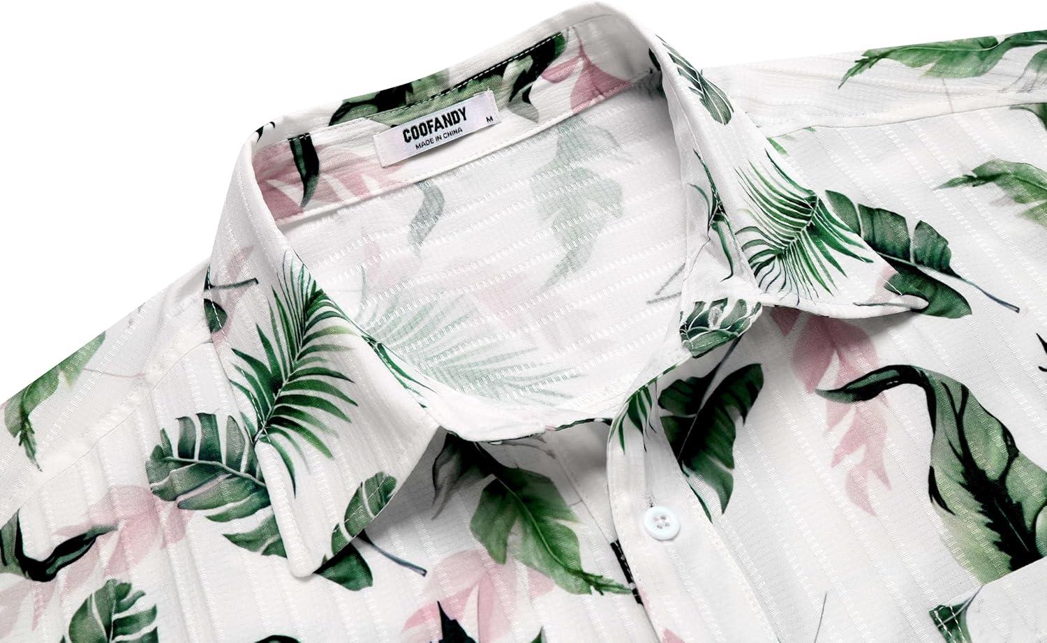 COOFANDY Men’s Casual Button Down Shirts Short Sleeve Textured Summer Beach Shirt with Pocket(White-green Pink Leaves)