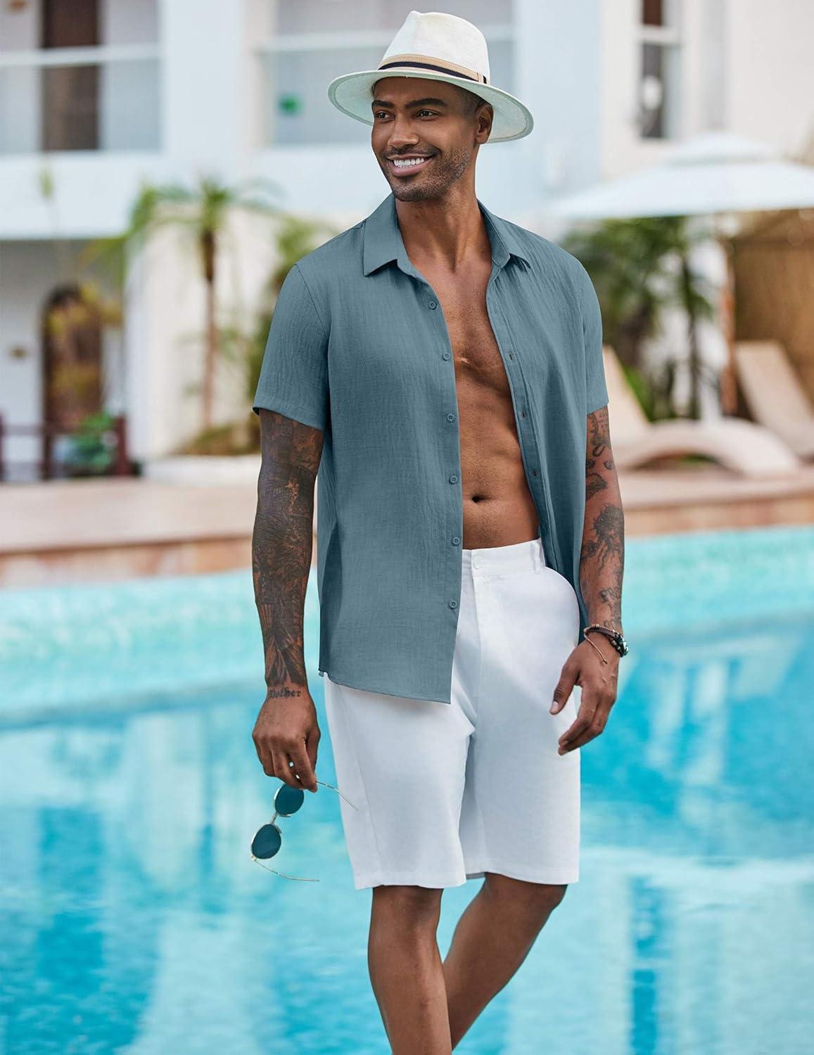 COOFANDY Men’s Casual Button Down Shirts Short Sleeve Textured Summer Beach Shirt(Denim Blue)